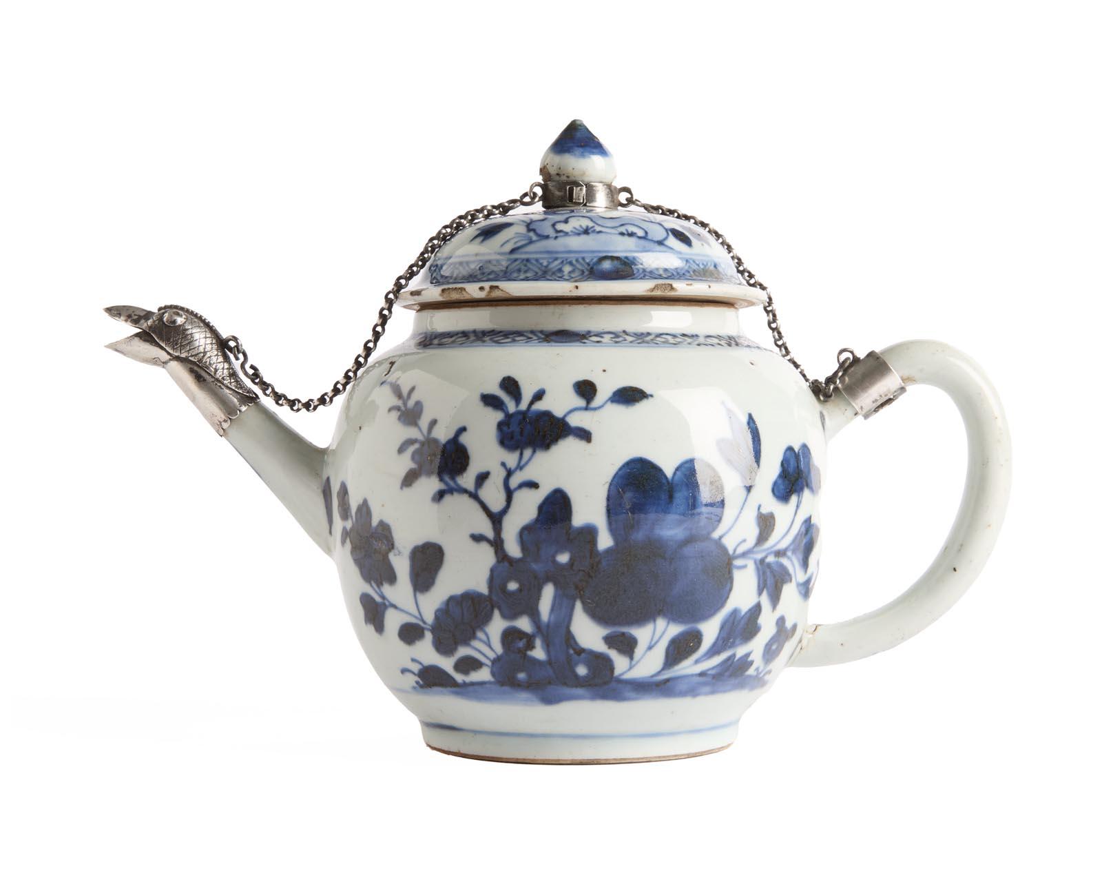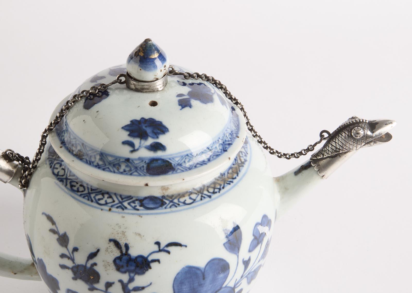 72 : Chine : Théière couverte en porcelaine à décor peint en camaïeu bleu figurant des fleurs et végétaux. Epoque : Qianlong 1736-1795. Etat : bout du bec cassé et remplacé par un bec verseur en argent. Egrenures. Dim : 16.5 x 22 cm .
