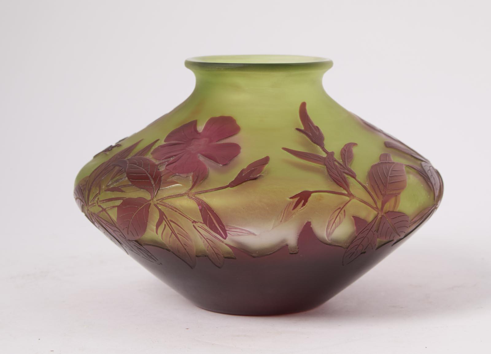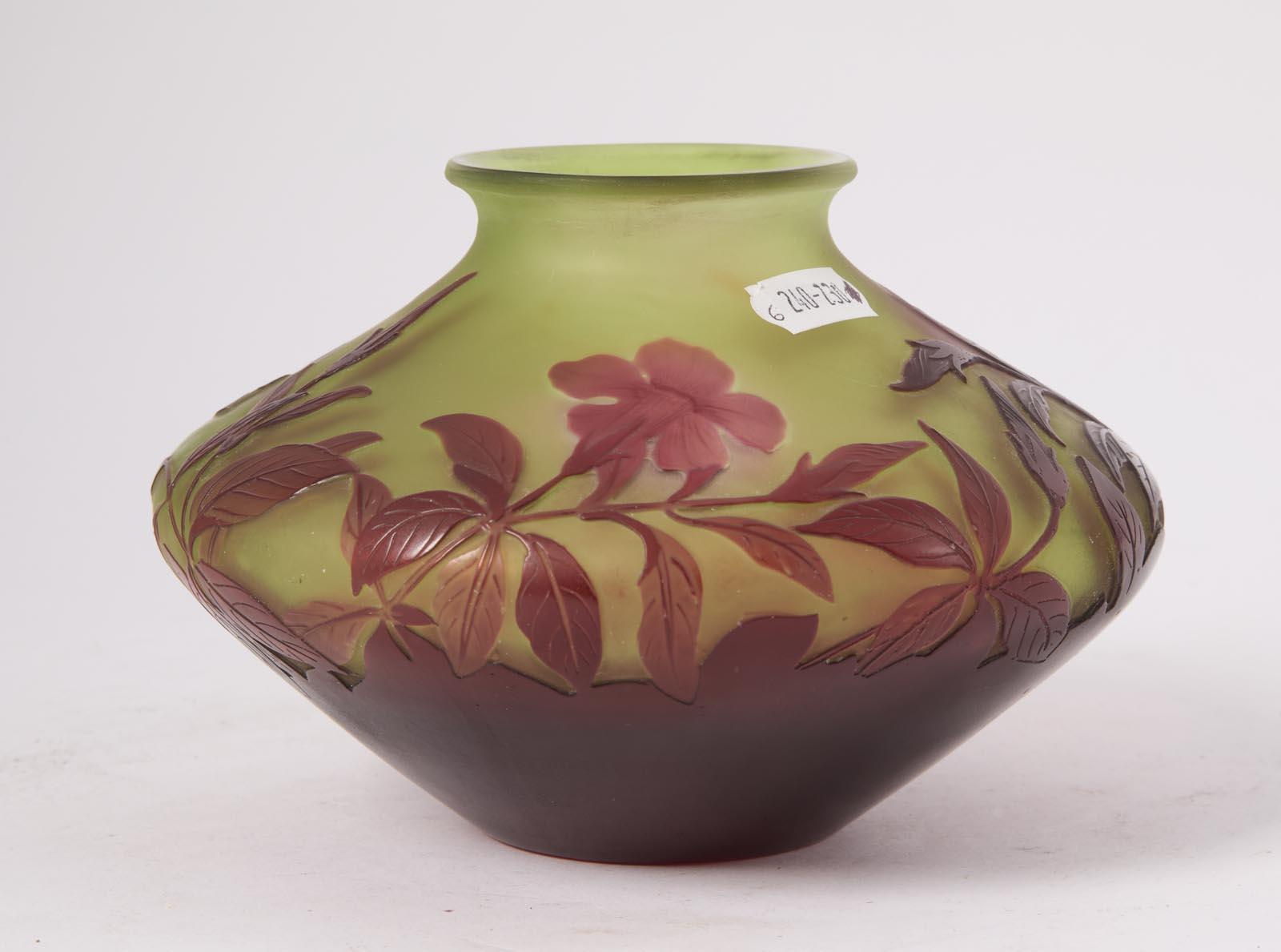 Vase à panse aplatie et col évasé en verre multicouche à décor floral. Signé.
