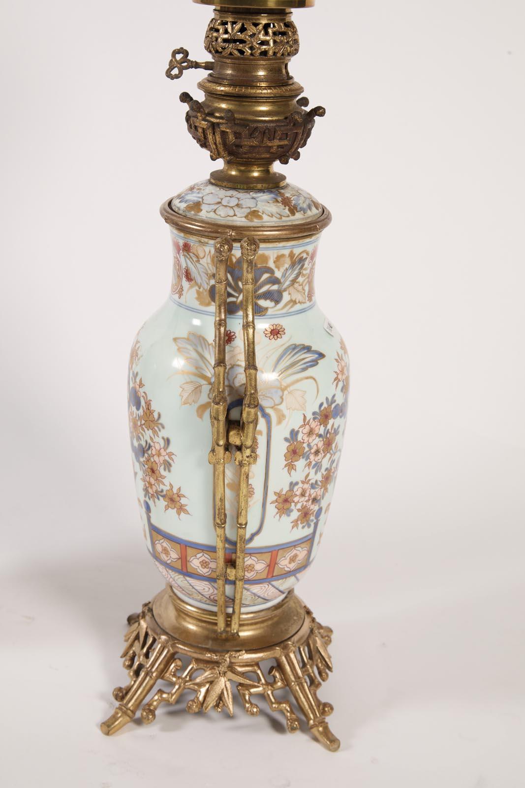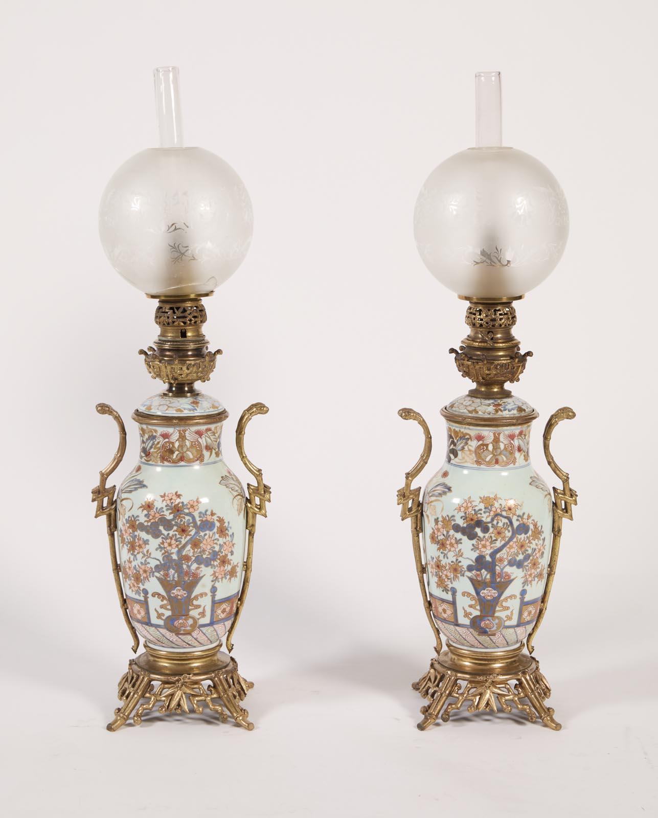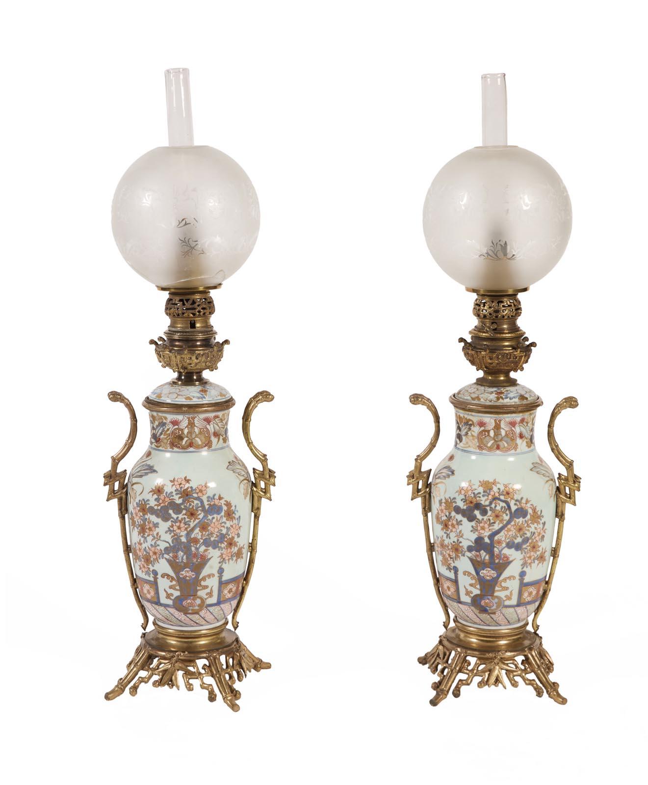 181 Paire d’importantes lampes à pétrôle en porcelaine dans le gôut des porcelaines Imari, bronze doré à l’imitation du bambou, verre et verre dépoli.