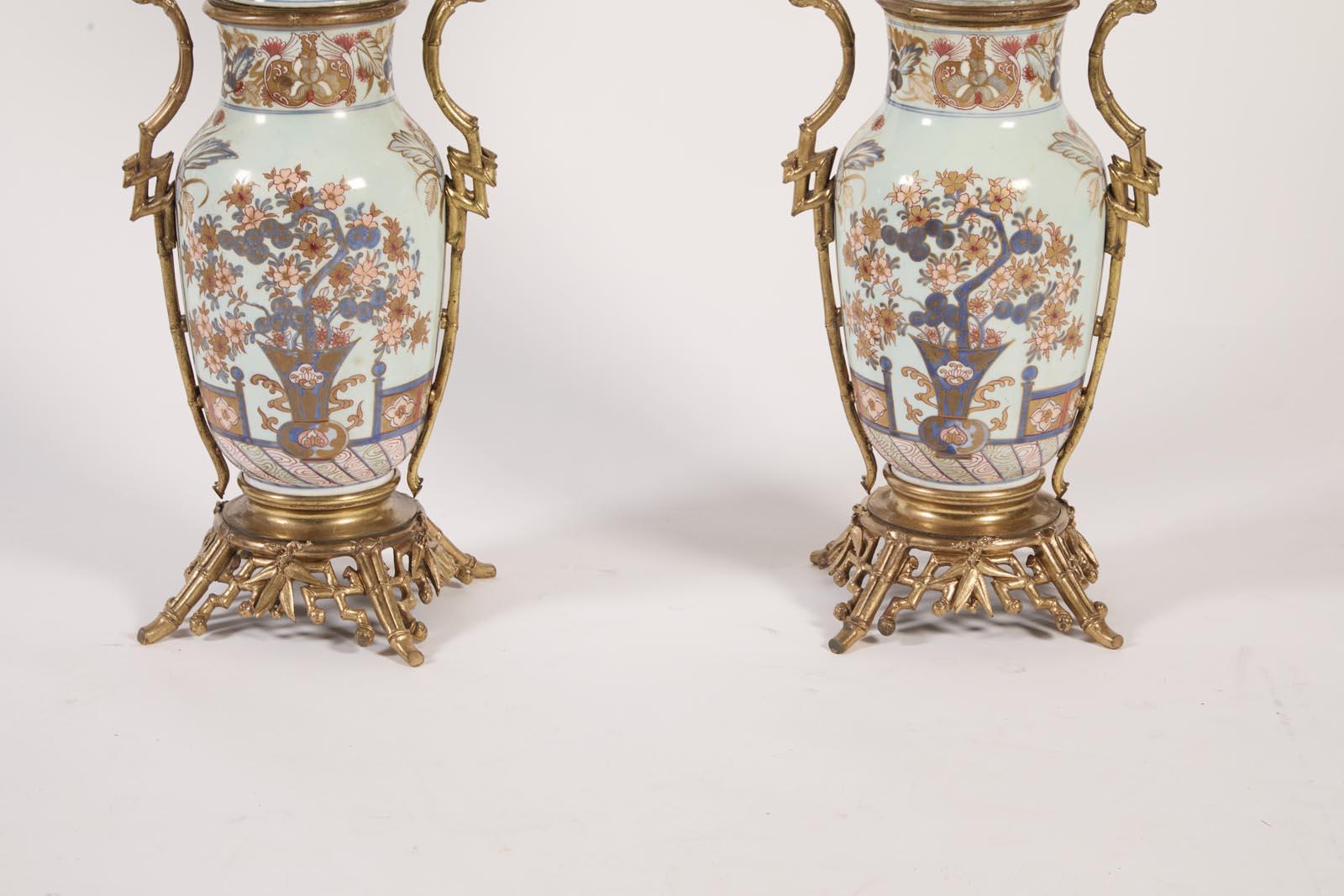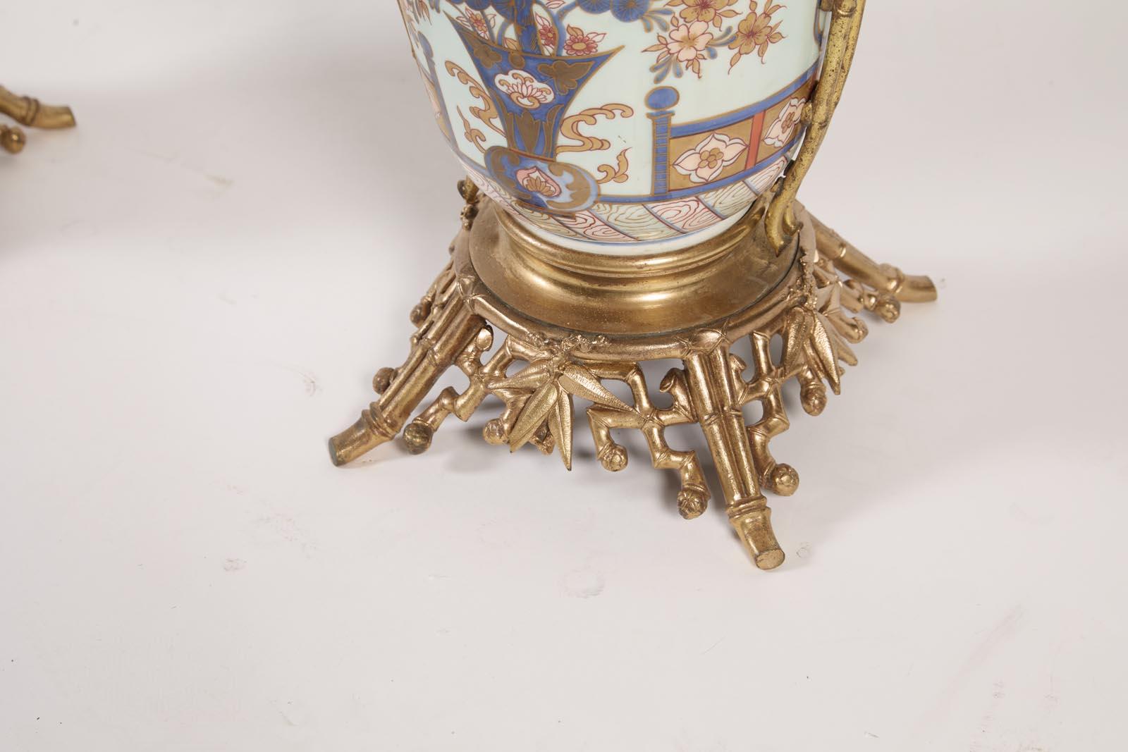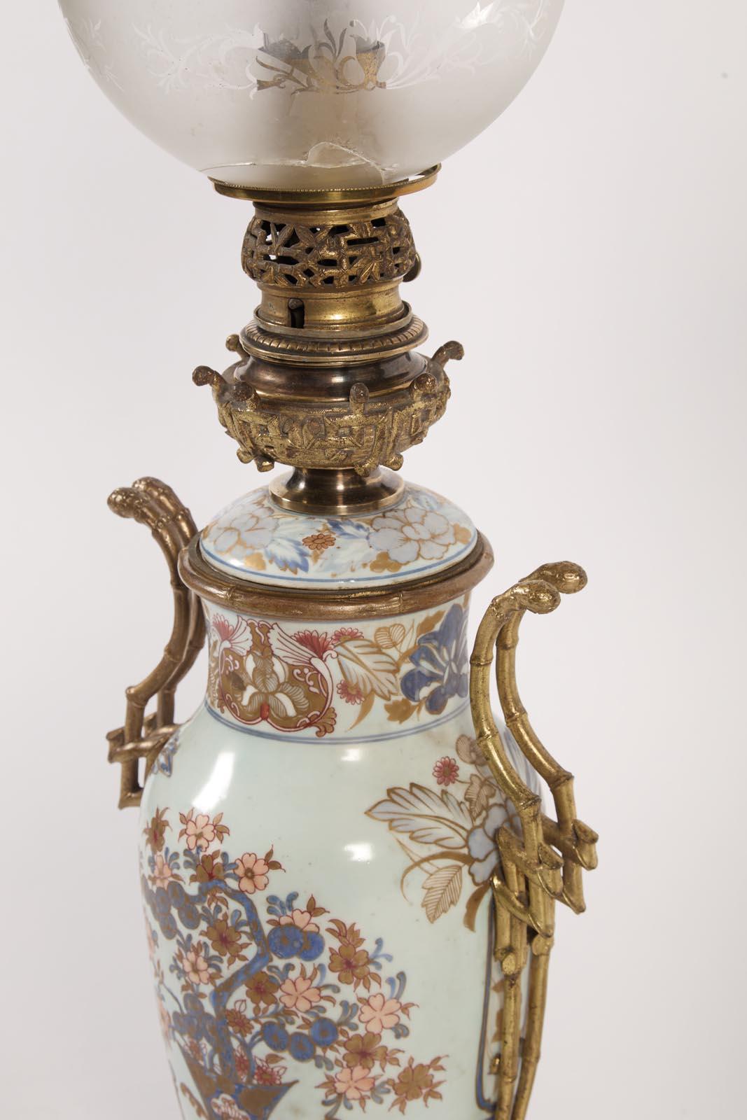181 Paire d’importantes lampes à pétrôle en porcelaine dans le gôut des porcelaines Imari, bronze doré à l’imitation du bambou, verre et verre dépoli.