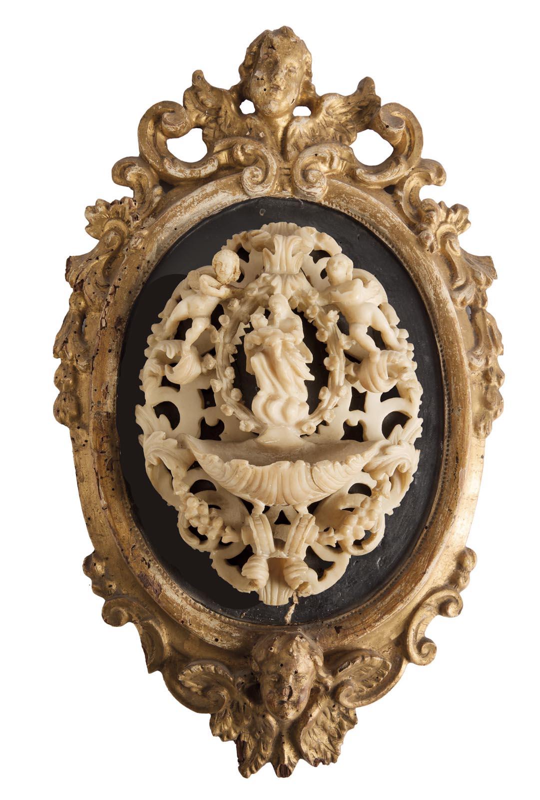 Lot n°213 - 213 Bénitier en albâtre sculpté à décor de vierge à l’enfant dans une mandorle,