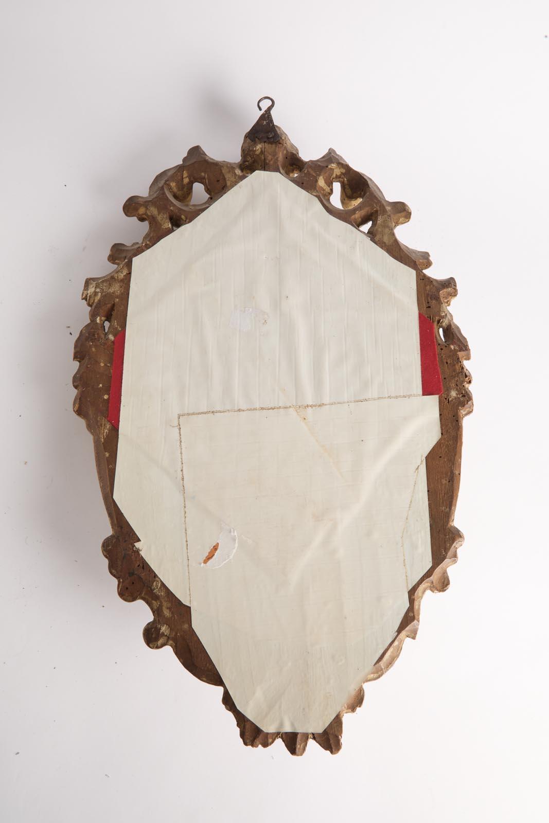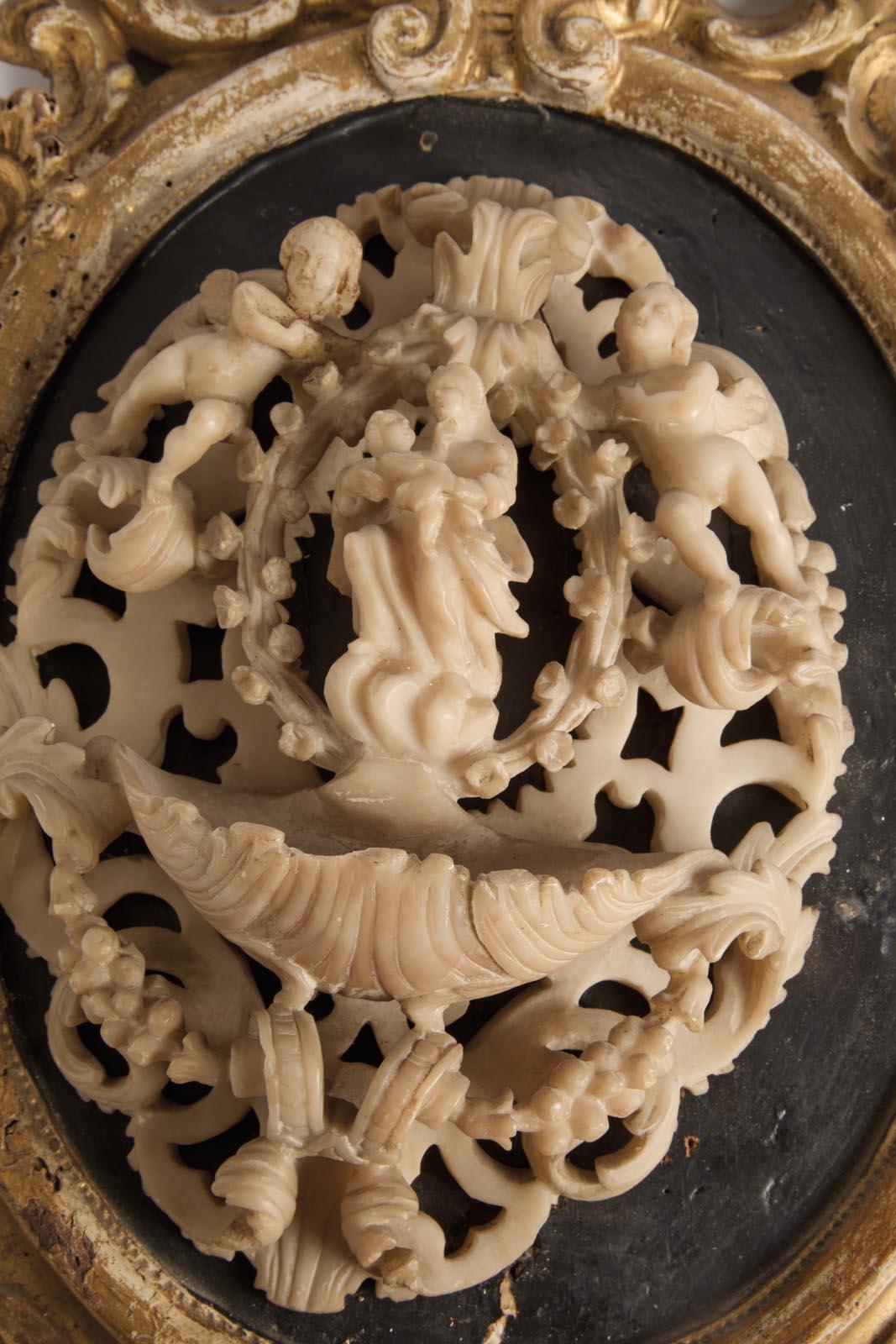 213 Bénitier en albâtre sculpté à décor de vierge à l’enfant dans une mandorle, anges et enroulements sur fond de niche en bois laqué, sculpté et doré.
