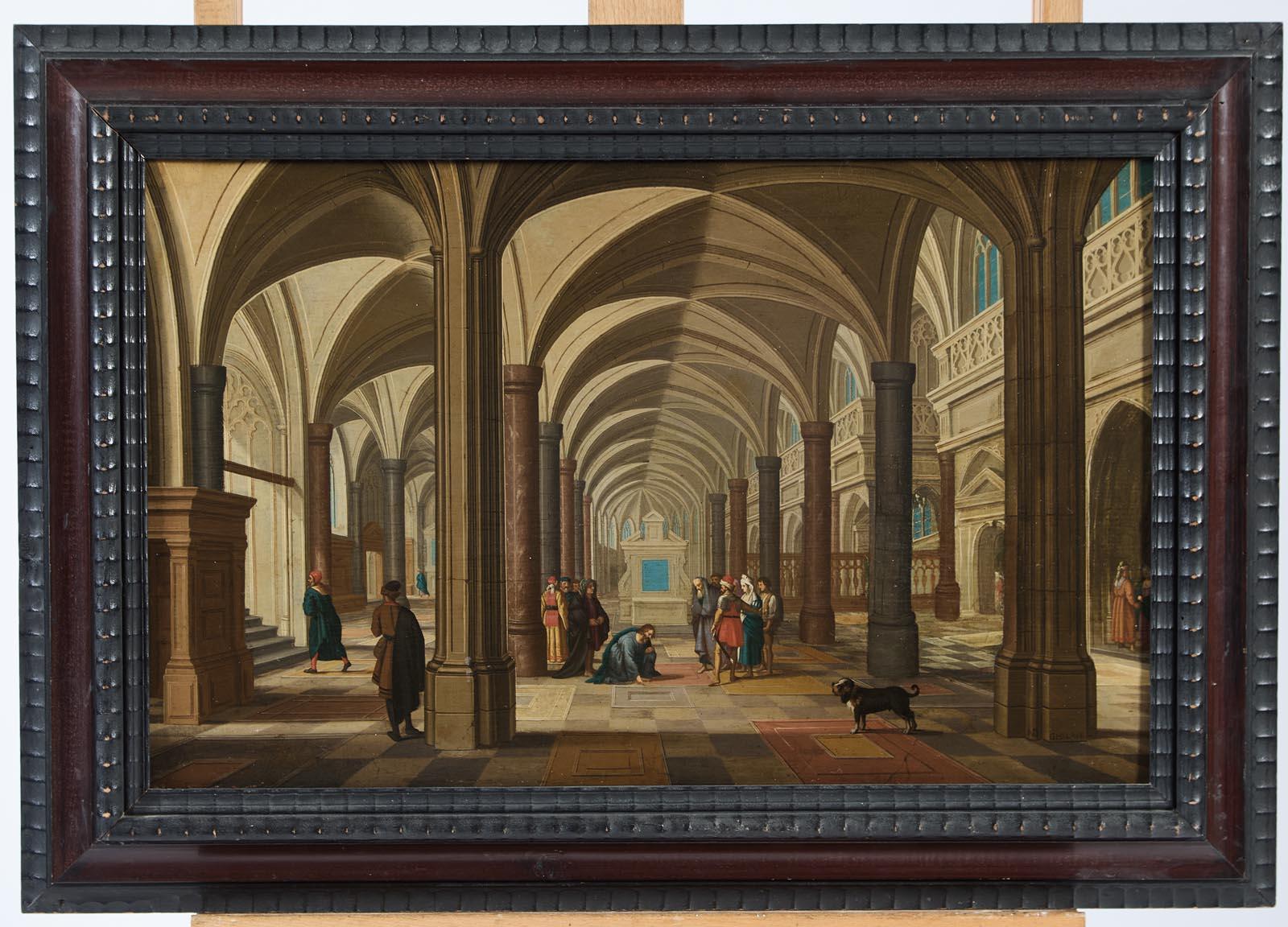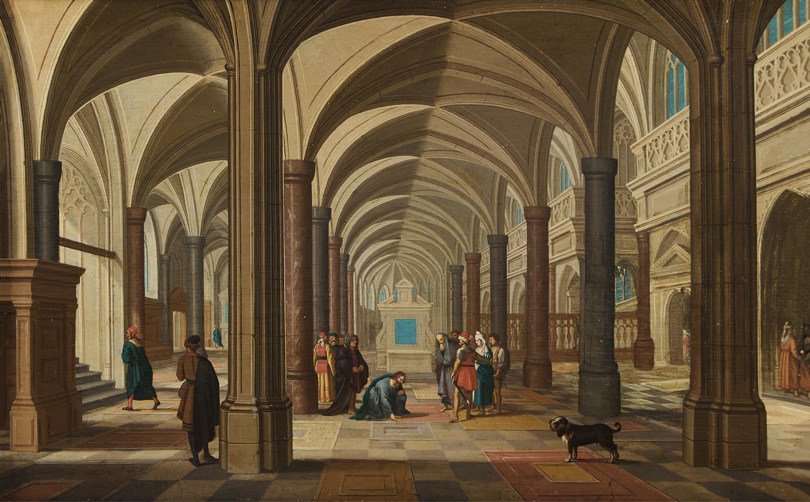 Intérieur d’église avec le Christ et la femme adultère