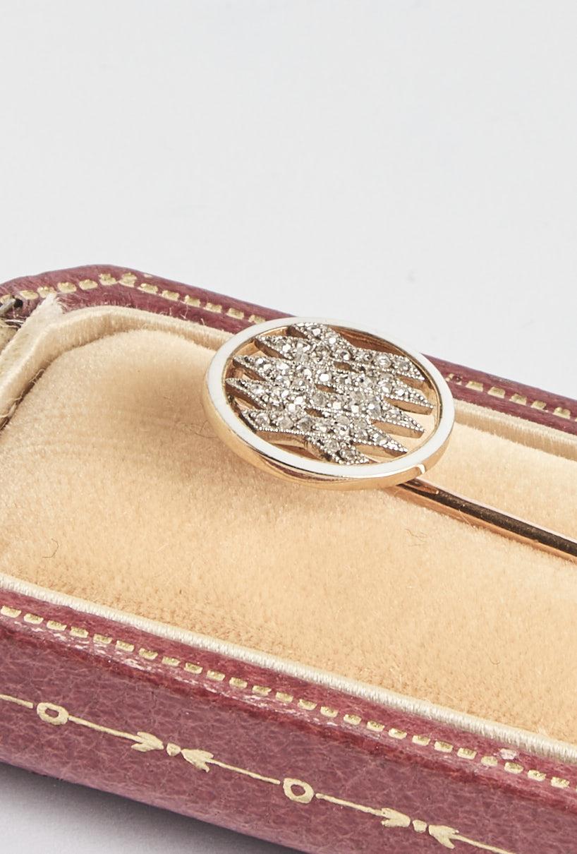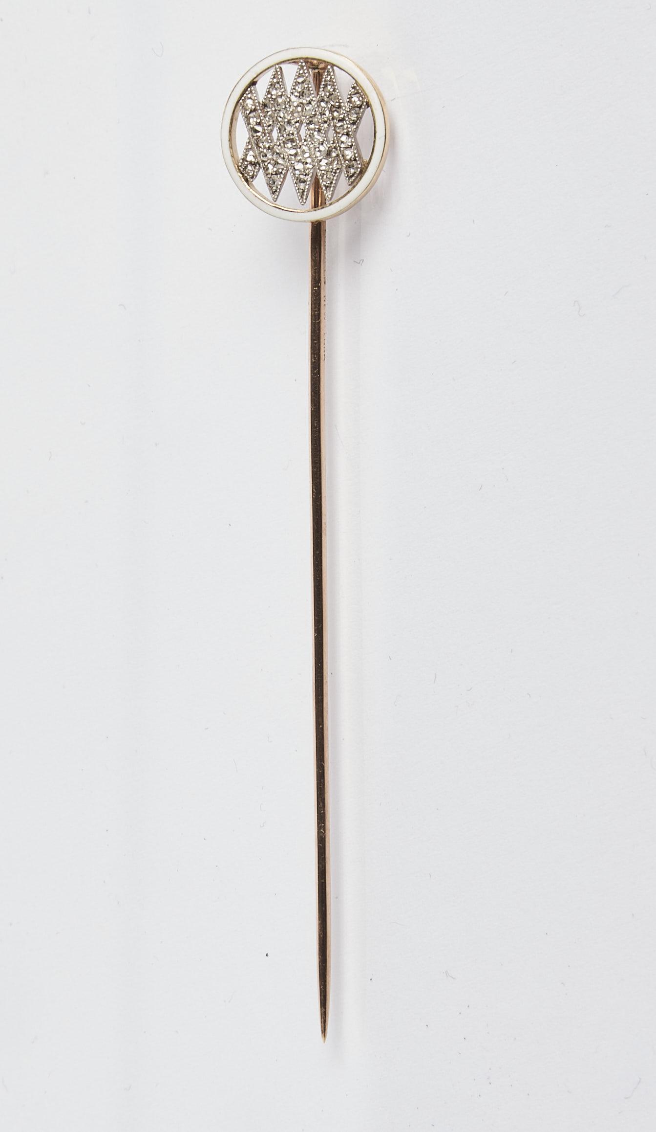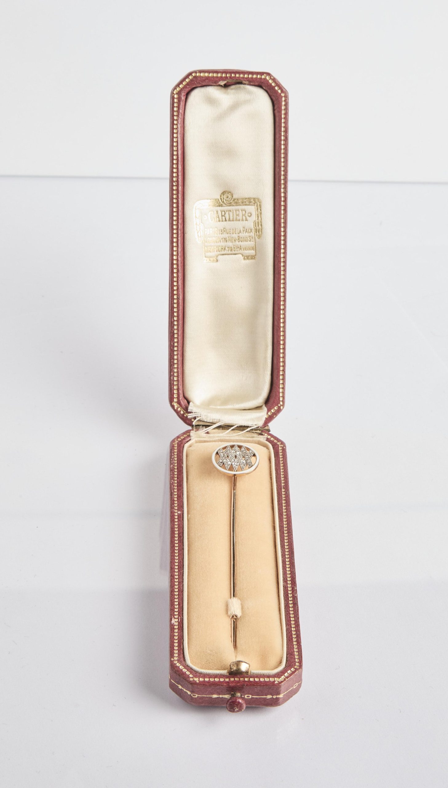 Épingle à cravate en or jaune et or gris orné W en pavage de rose de diamants inscrit dans un cerclage émaillé blanc. Dans son écrin d’origine