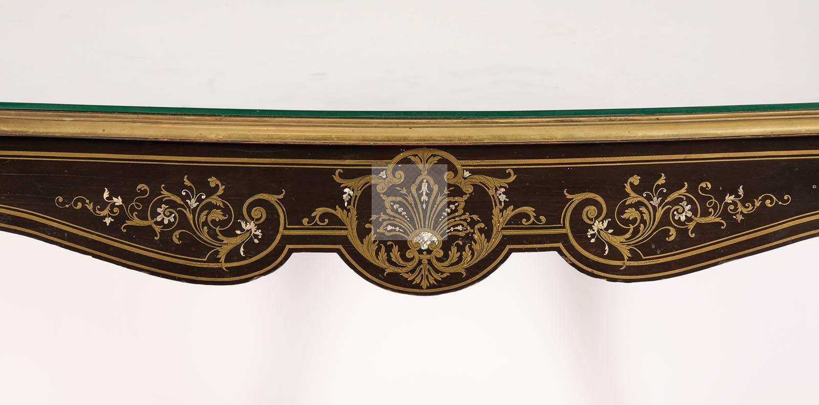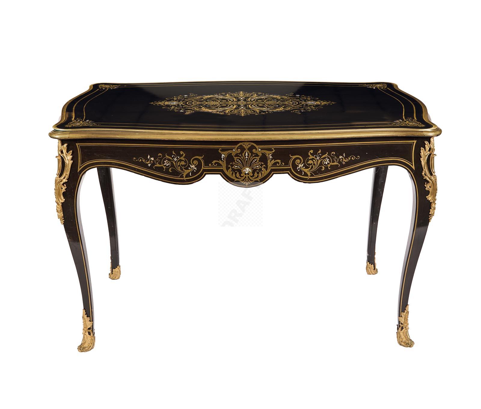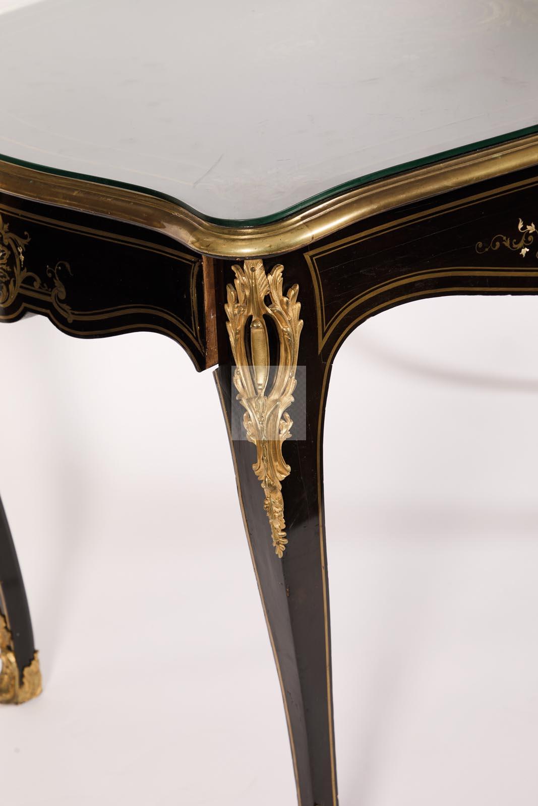498 Bureau plat de forme mouvementée en bois noirci ouvrant par un tiroir latéral. Ceinture et plateau à lingotière décorés de marqueteries Boulle en laiton et burgeau. Repose sur quatre pieds cambrés ornés de bronzes dorés rocailles.