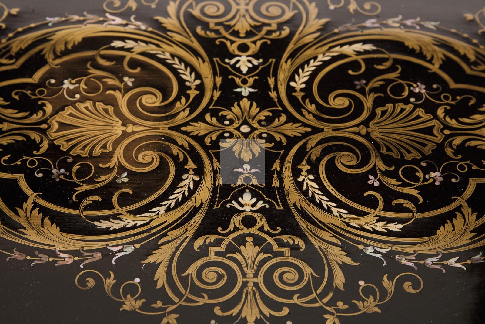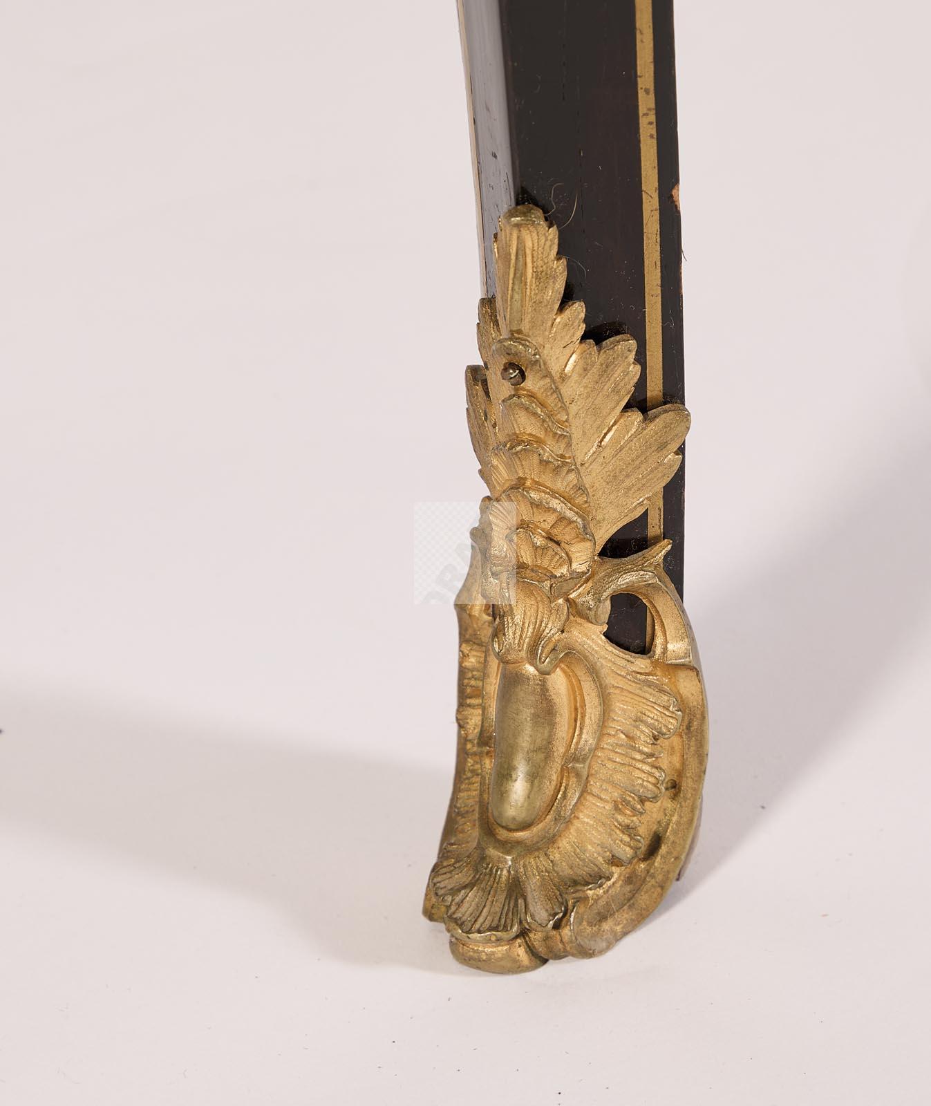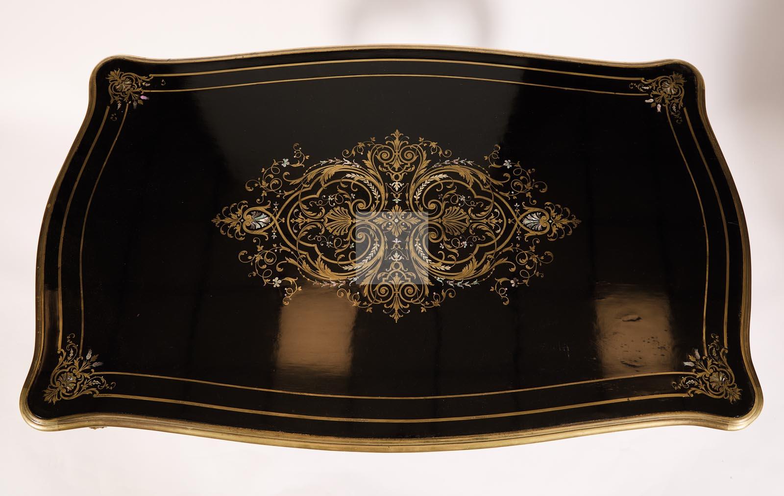 498 Bureau plat de forme mouvementée en bois noirci ouvrant par un tiroir latéral. Ceinture et plateau à lingotière décorés de marqueteries Boulle en laiton et burgeau. Repose sur quatre pieds cambrés ornés de bronzes dorés rocailles.