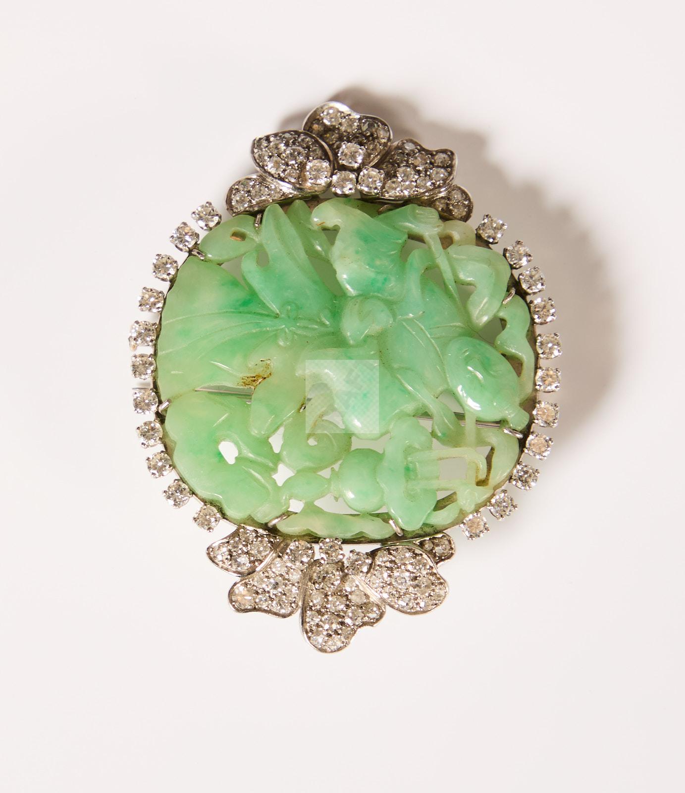 346 Broche Art Déco en or et platine ornée d’une plaque de jade gravée, la monture pavée de diamants, diamètre 4,5 à 6 cm environ, poids 30,7 g