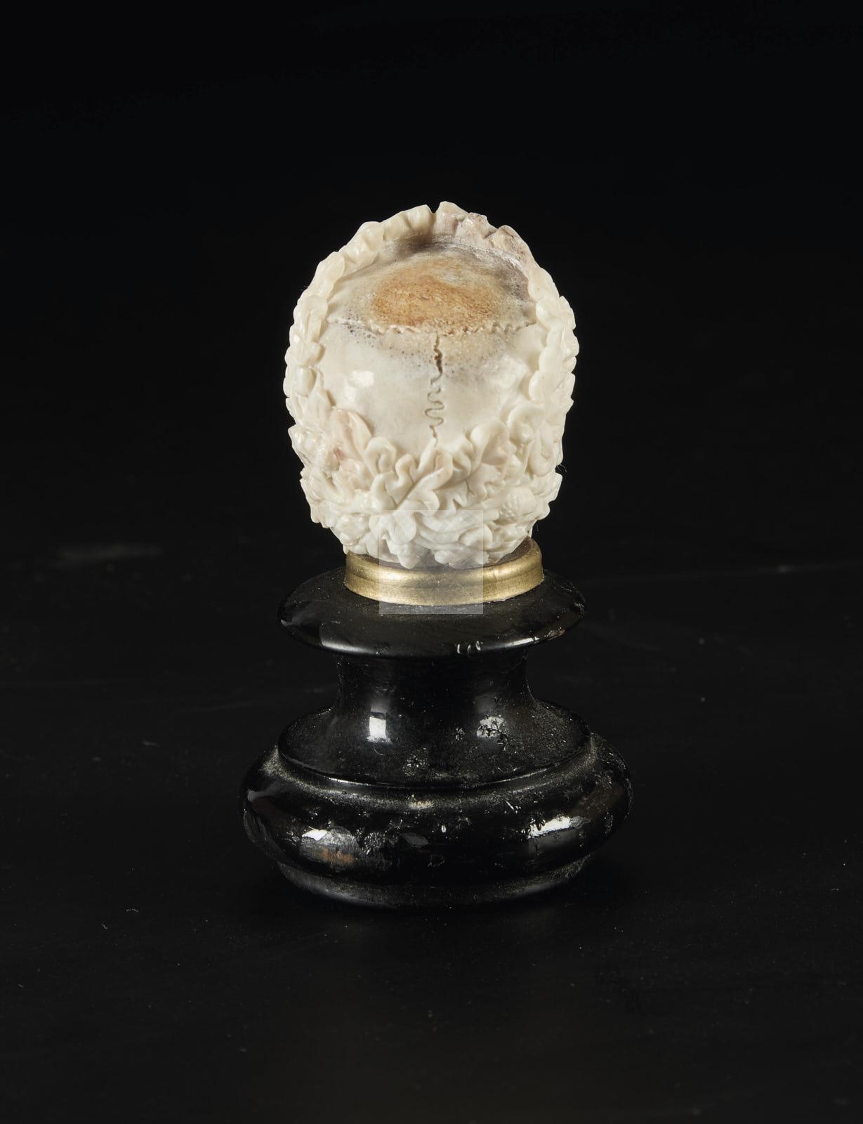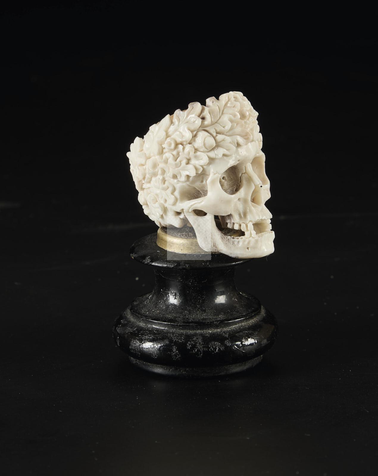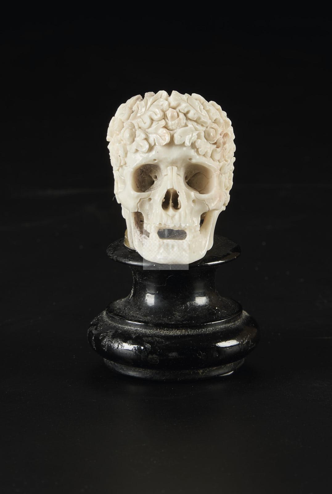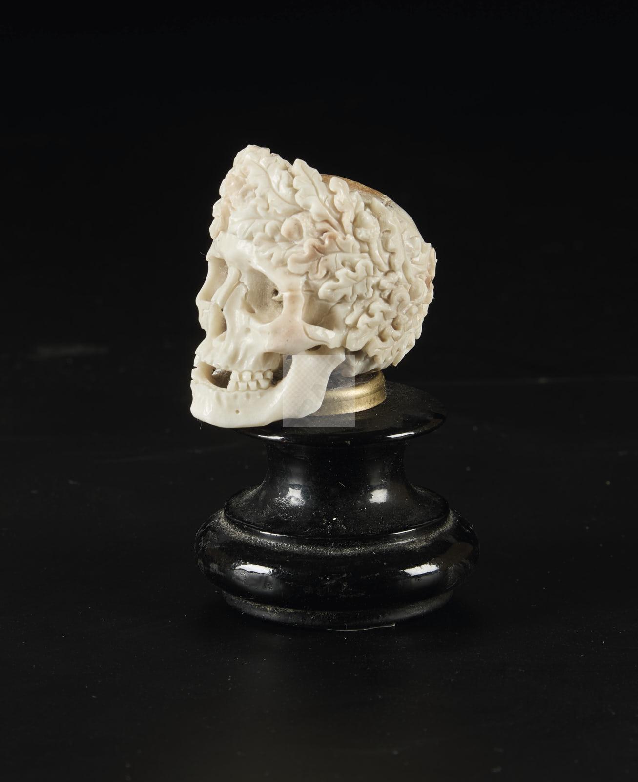 Lot n°187 - 187 Crâne, la tête entourée de guirlandes de feuilles et glands de chêne, bois d