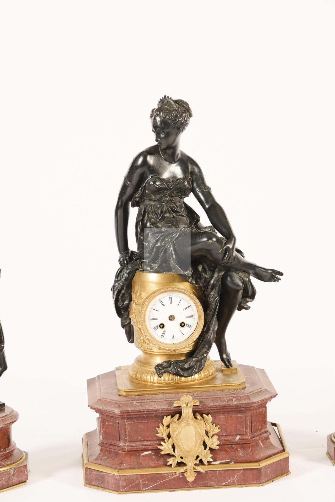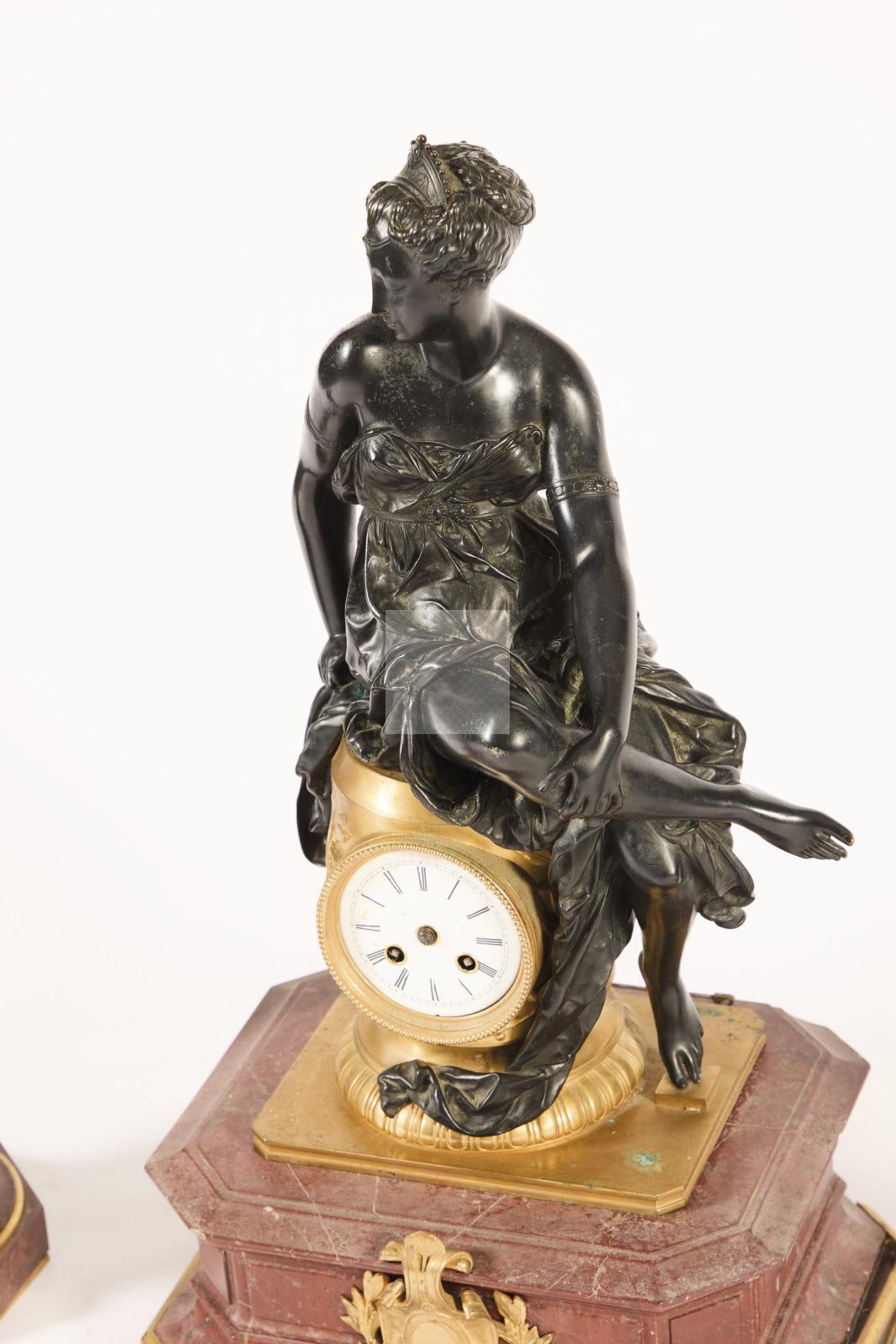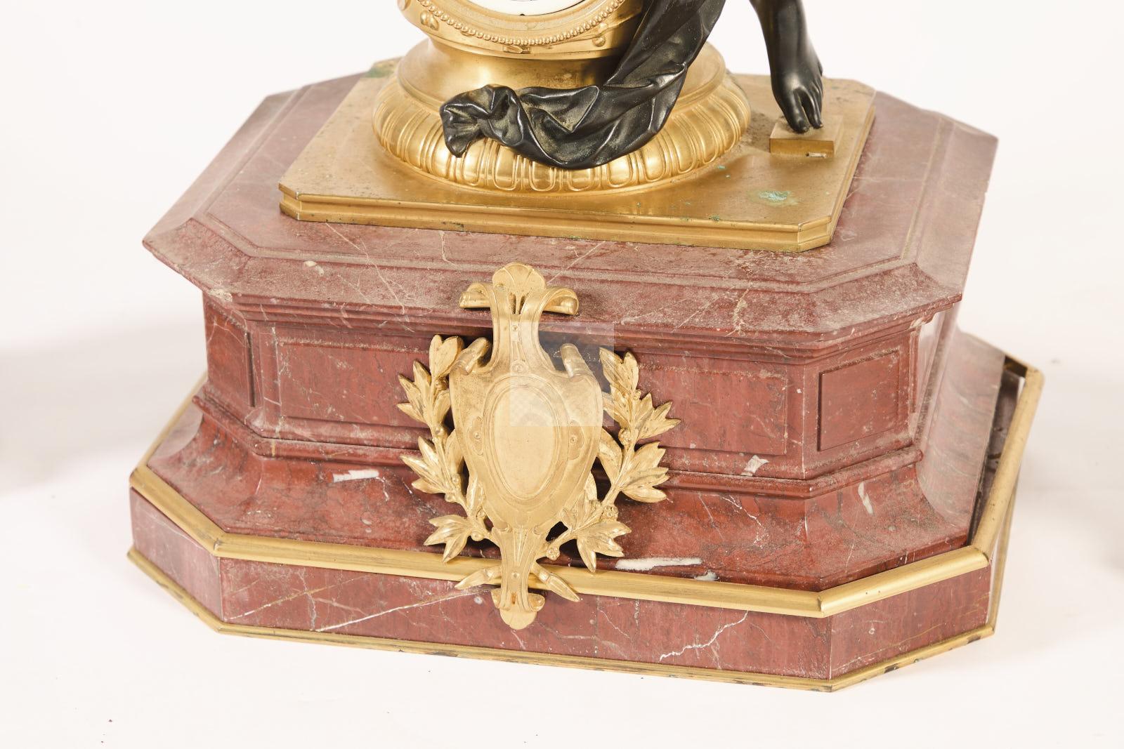 247 Garniture de cheminée en bronze patiné bronze ciselé et doré et marbre griotte composé de