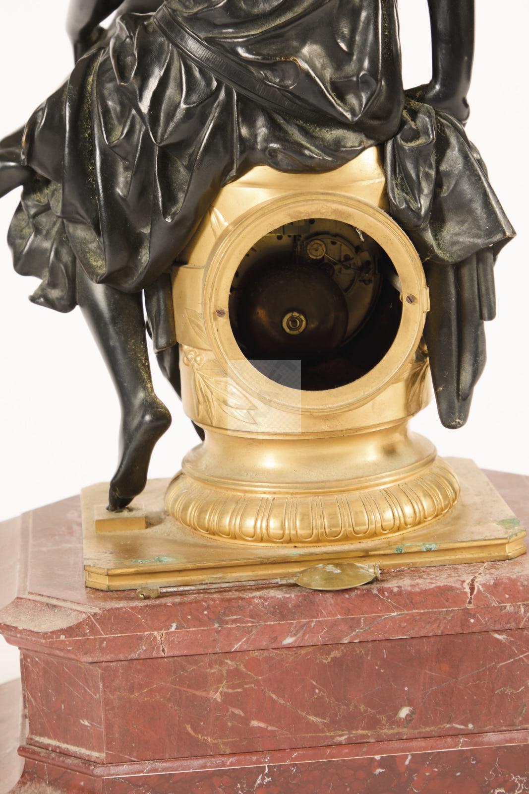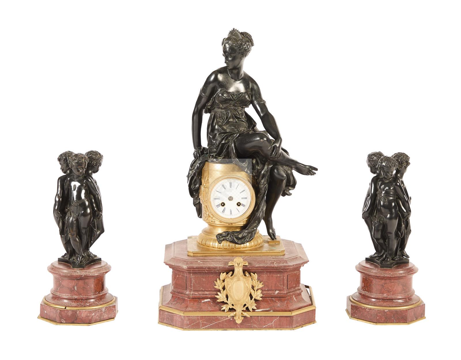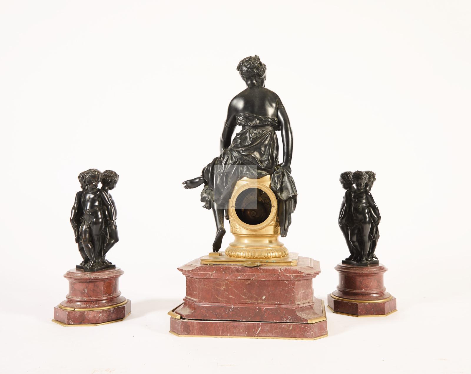 247 Garniture de cheminée en bronze patiné bronze ciselé et doré et marbre griotte composé de