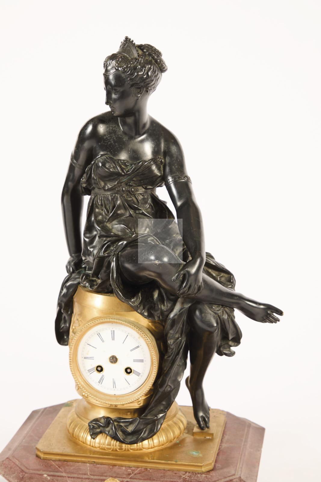 – une pendule à décor en ronde-bosse de femme à l’antique, base à pans coupés