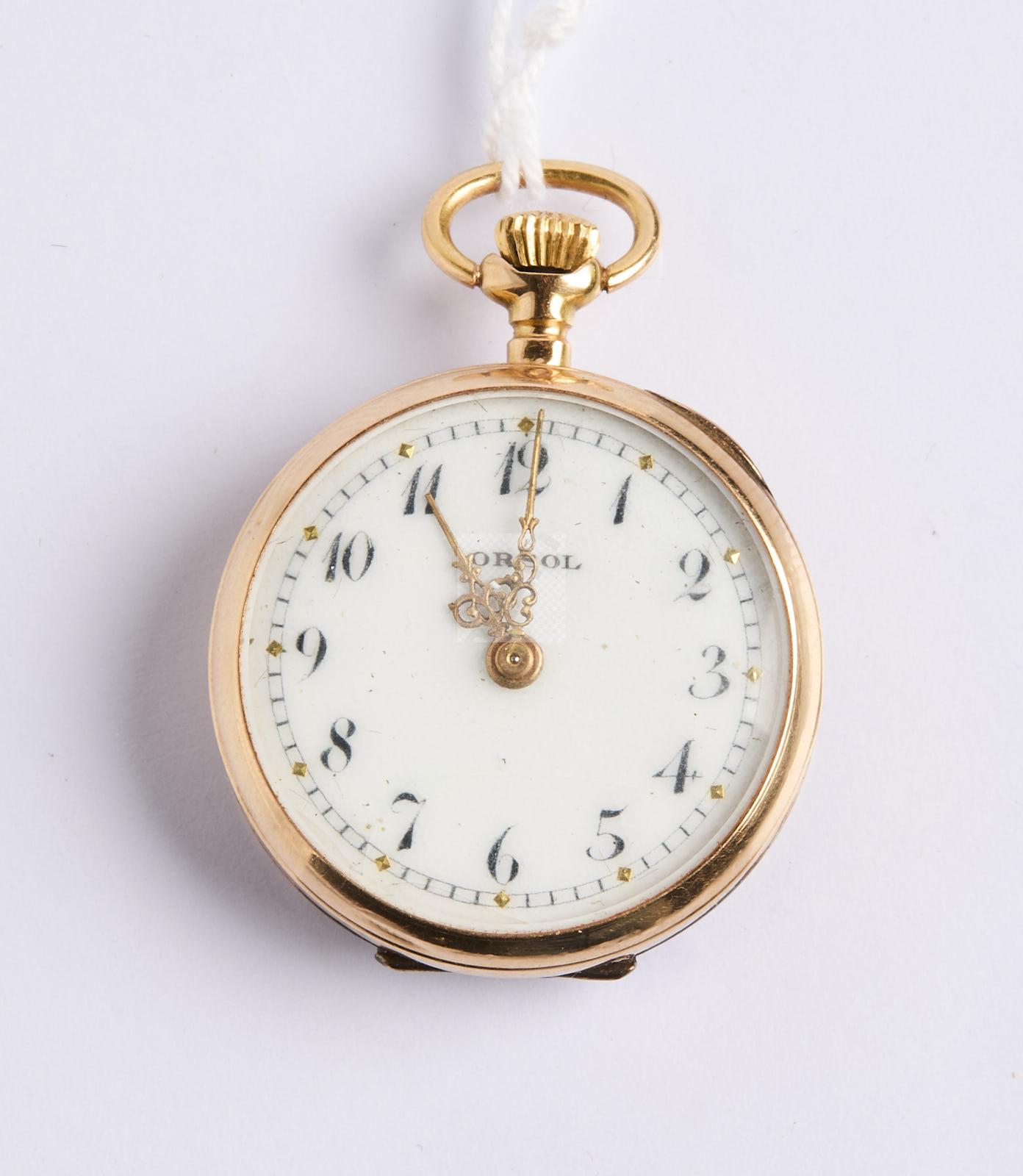 Lot n°42 - 42 Montre de col en or jaune 750 ‰, double boitier cuivre. Dos gravé d’une peti