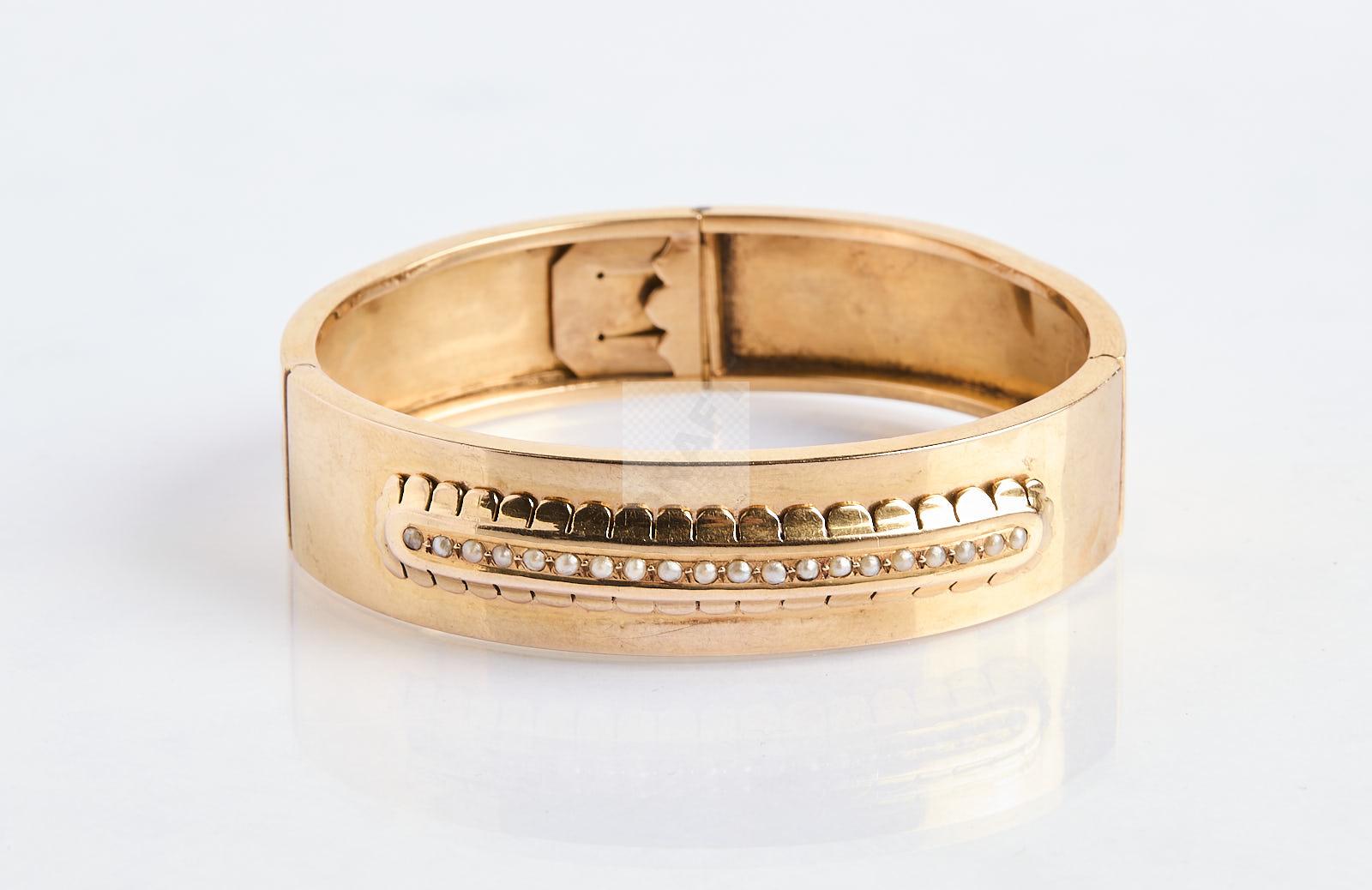 165 Bracelet rigide ouvrant, or jaune 750 ‰, à motif serti de semences de demi-perles, petits chocs, poignet 6 cm x 5 cm , largeur 1,5 cm, poids 19,7 g