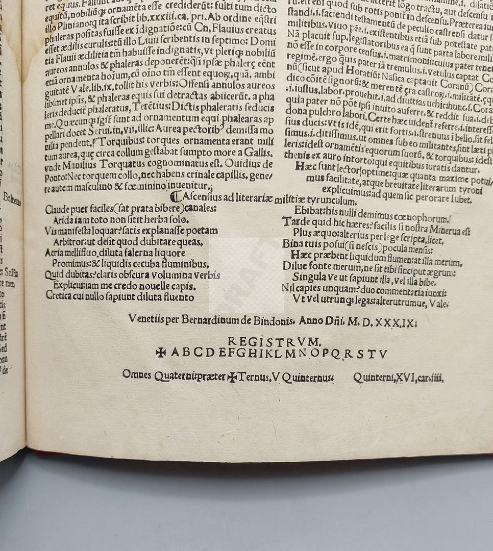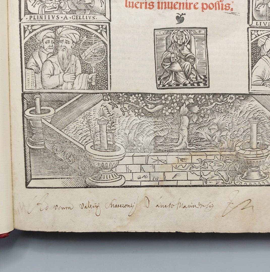Titre en rouge et noir, dans un encadrement on retrouve des auteurs classiques, Pline, Cicéron, PlutarqueThéocrite, Hésiode etc…, bois gravés dans le texte et lettrines, belle impression vénitienne.