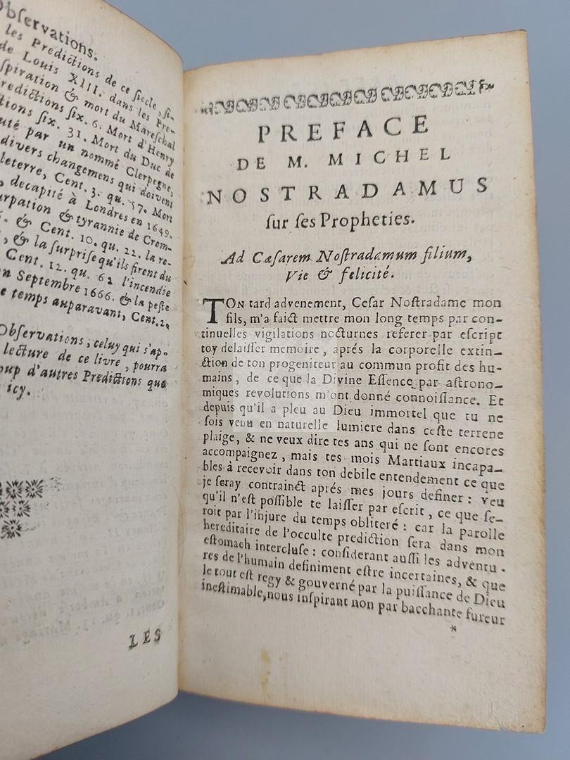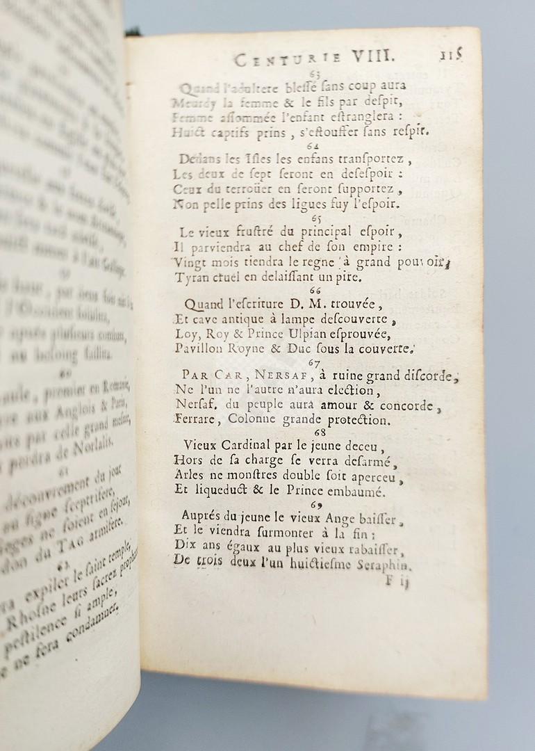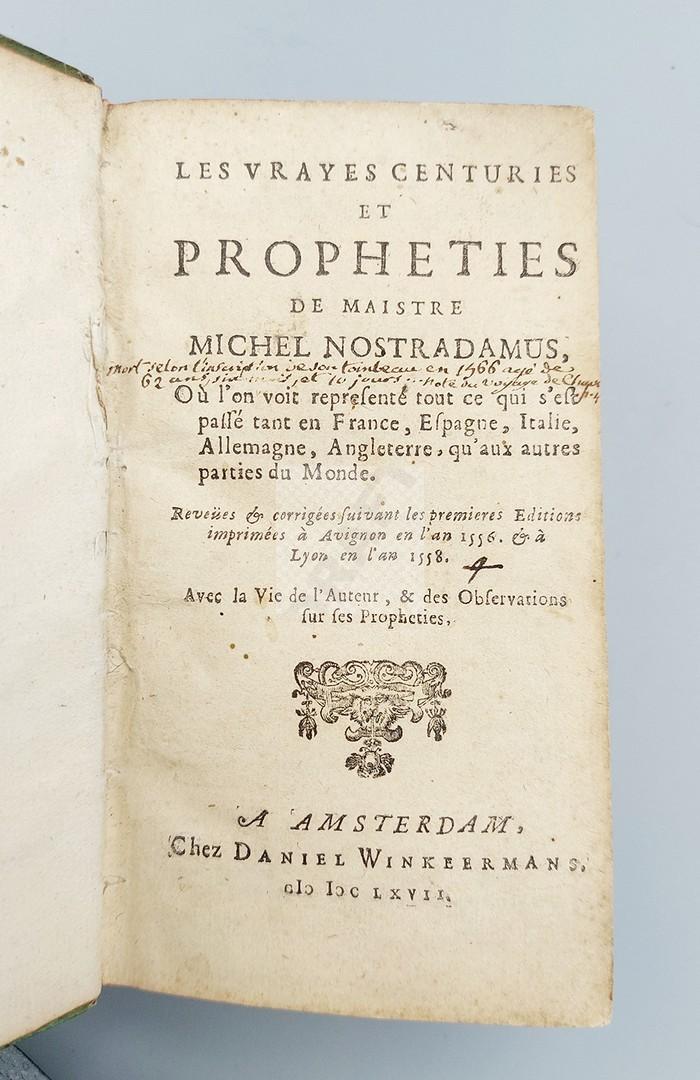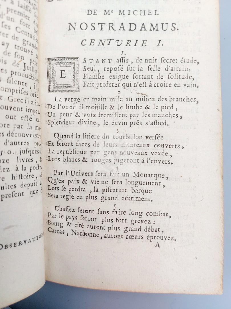 Les vrayes centuries et propheties de Maistre Michel Nostradamus, ou l’on voit représenté tout ce qui s’est passé tant en France, Espagne, Italie, Allemagne, Angleterre, qu’aux autres parties du monde. Revues et corrigées suivant les premières éditions imprimées à Avignon en l’an 1556 & à Lyon en l’an 1558. Avec la vie de l’auteur, & des observations sur les prophéties.