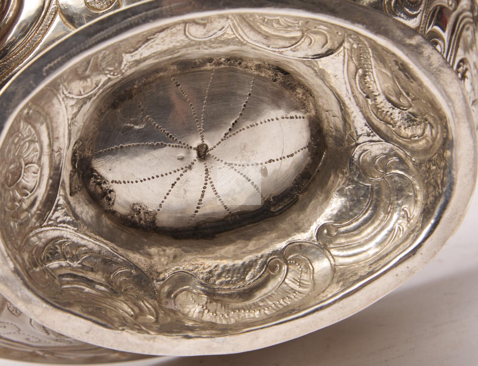 4 Tasse à vin sur piédouche en argent à décor au repoussé de paons et rocailles, prises ajourées à décor de masques radiés et personnages.