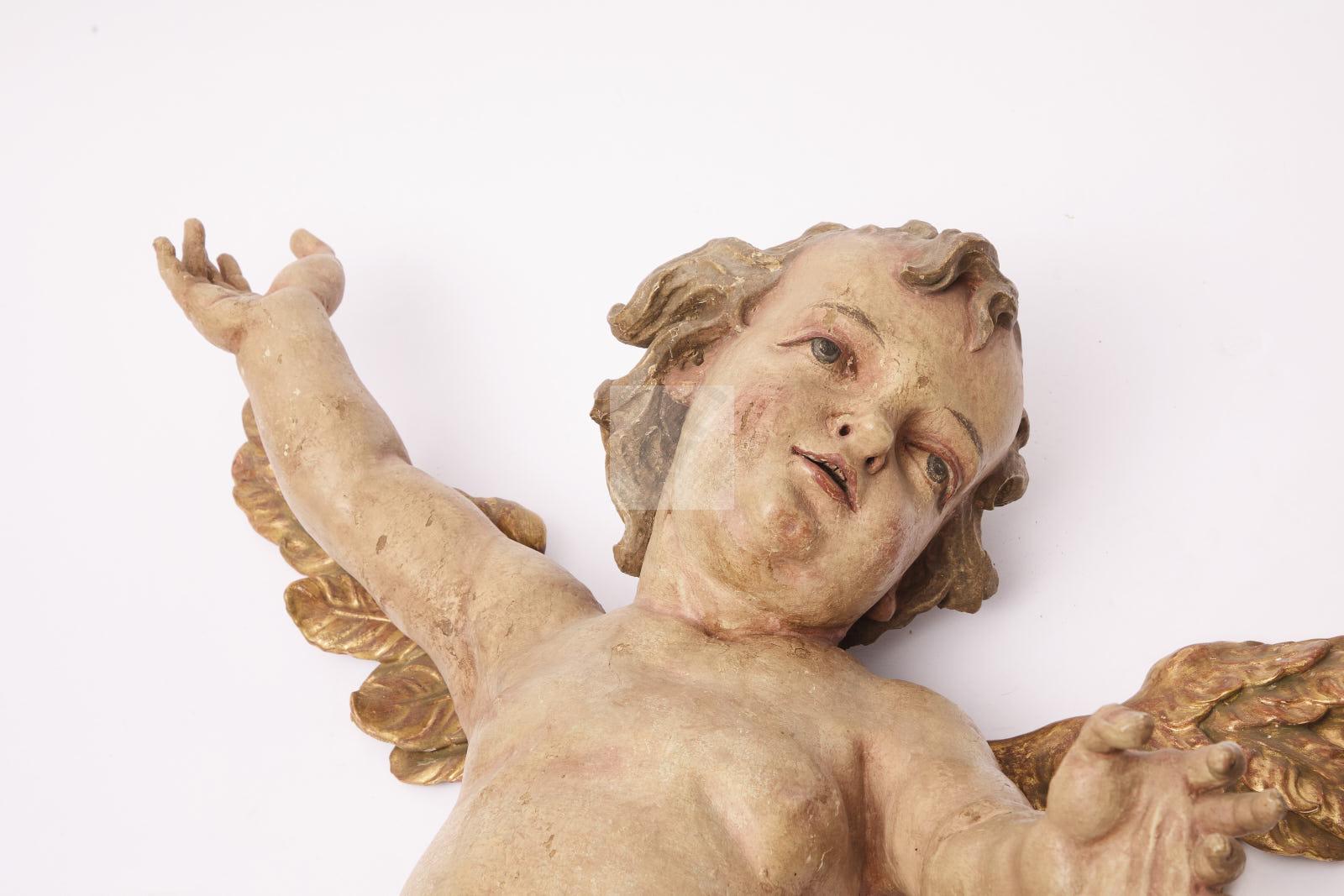 Lot n°155-A - 155 Très importante paire d’anges en bois sculpté polychrome à réhauts dorés.