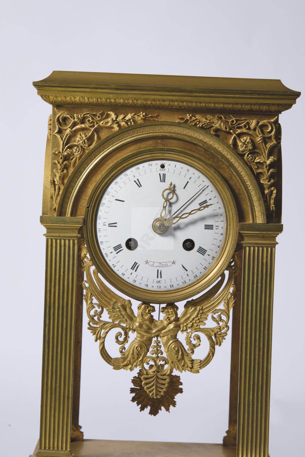 Lot n°167 - 167 Pendule portique en bronze ciselé et doré, les montants formés de colonnes t