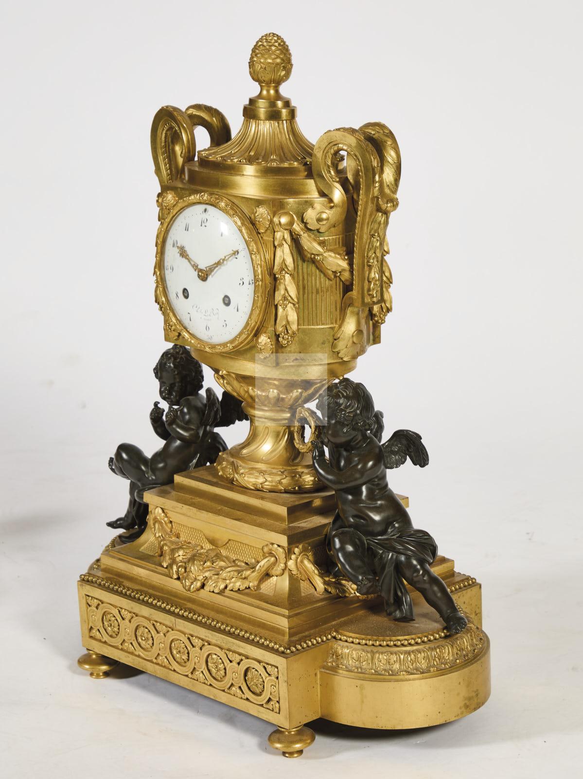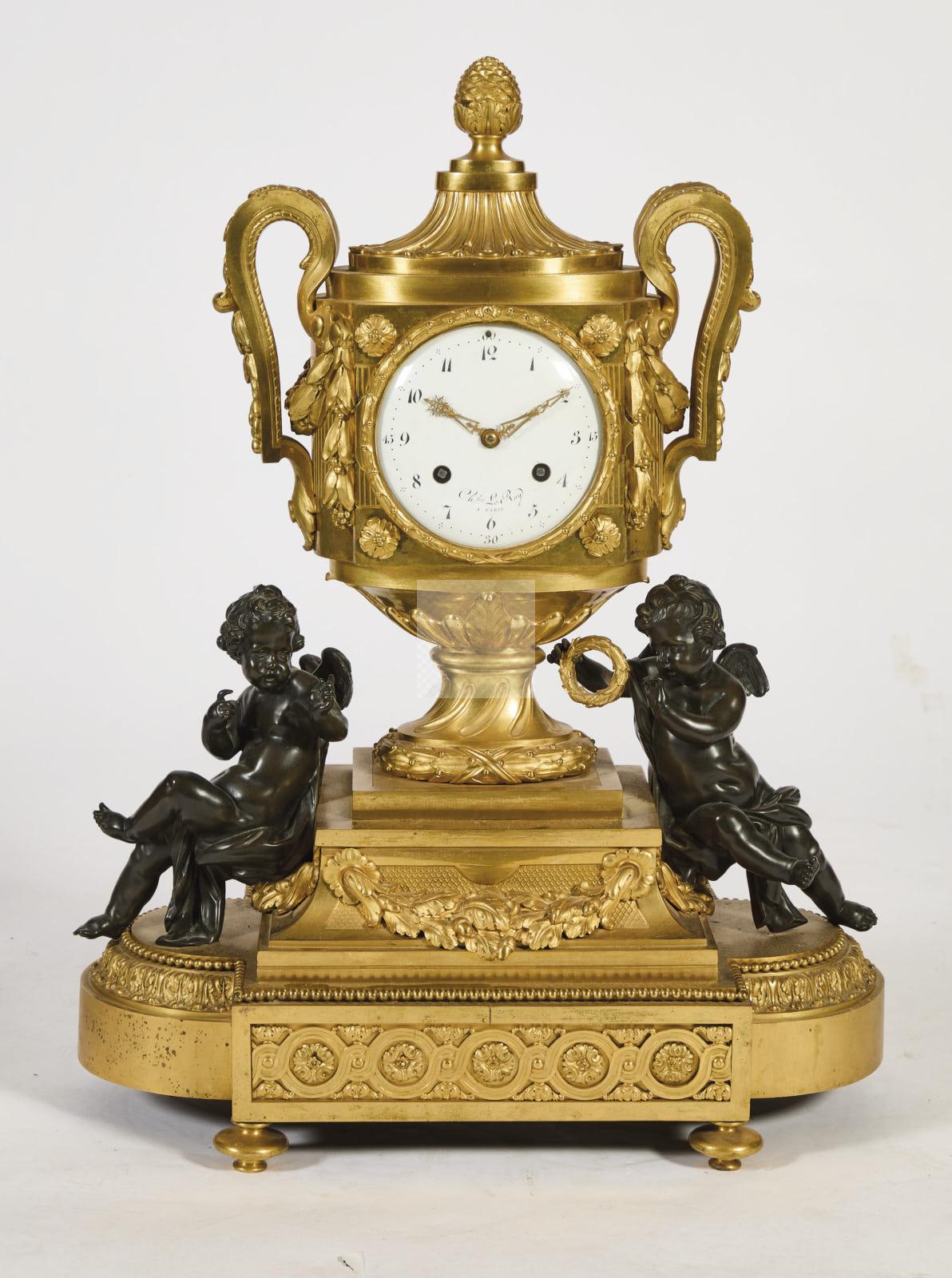 Importante pendule en bronze ciselé à double patine brune et dorée à décor d’un pot couvert flanqué de deux puttis, l’un tenant une couronne de lauriers. Riche ornementation de frises de tores de lauriers. Pose sur une base de forme oblongue et quatre pieds boule, cadran et mouvement signés de Charles Le Roy, à Paris.