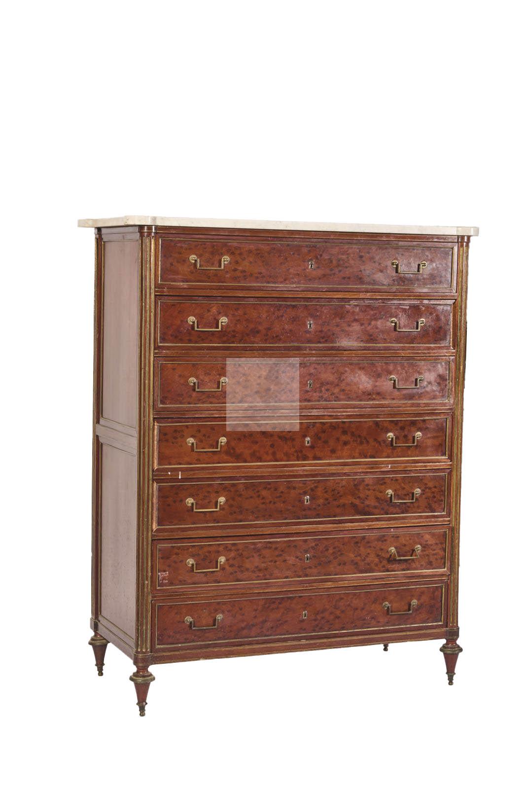 488 Large semainier en acajou moucheté à montants à colonnes cannelées, rudentées. Dessus de marbre blanc veiné. Pieds toupies.