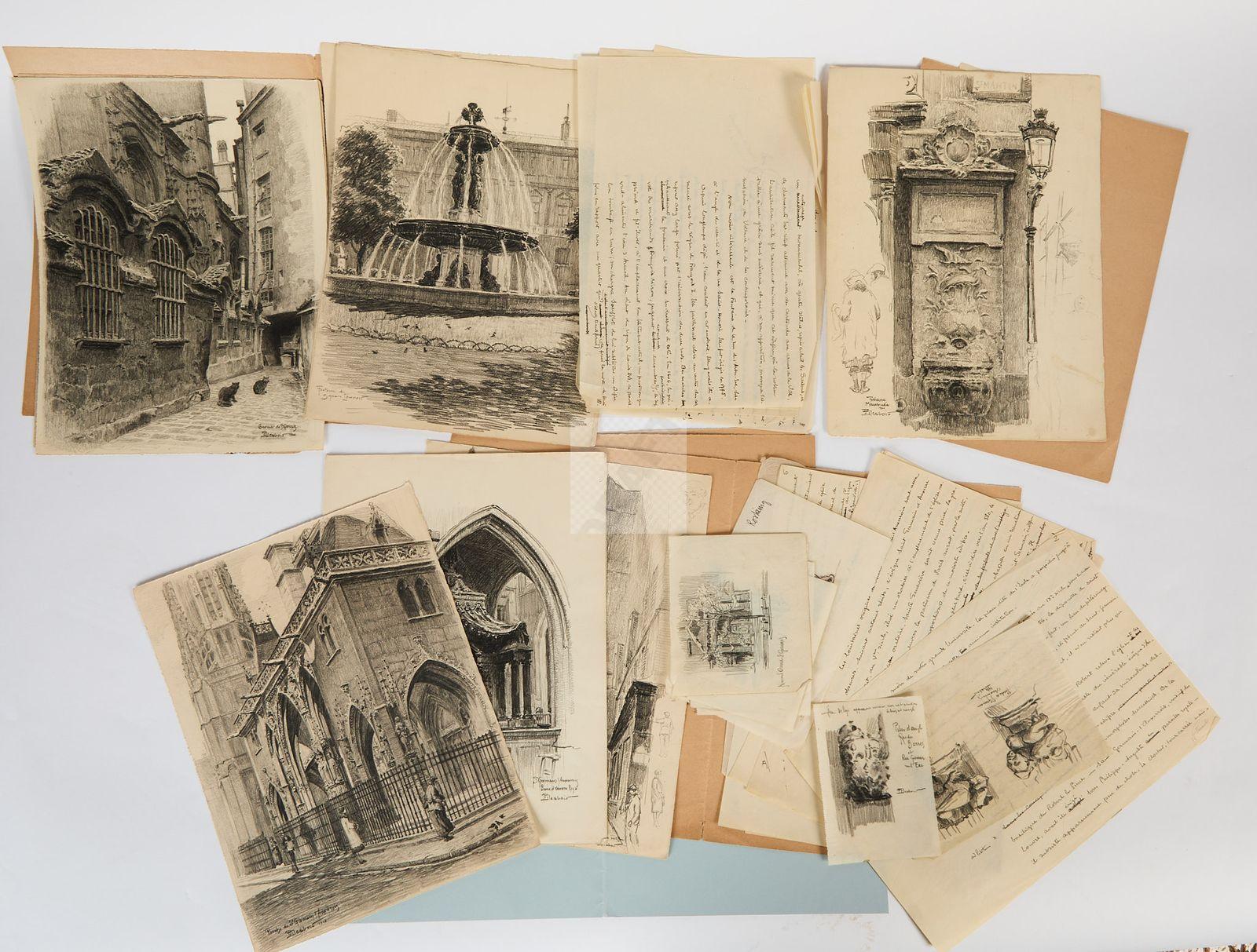 Très important et riche ensemble de gravures avant la lettre étudiant les « Aspects du Vieux Paris », ensemble subdivisé en quatre pochettes annotées respectivement « Chapitre VI », « Chapitre VII », « Chapitre X » et « Chapitre XII », chacune comporte des oeuvres sur papier, ou calque, et des feuilles manuscrites annotées.