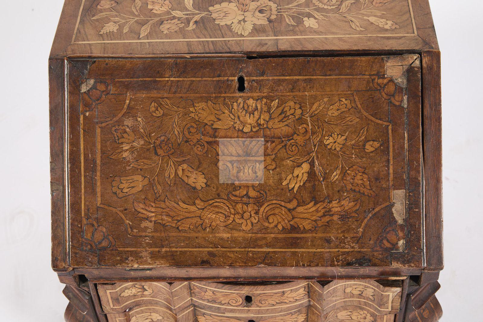 223 Petit cabinet de maîtrise à décor marqueté de vases fleuris et entourage fleuri et feuillagé, ouvre par un abattant laissant découvrir tiroirs et casiers, et deux tiroirs en façade,