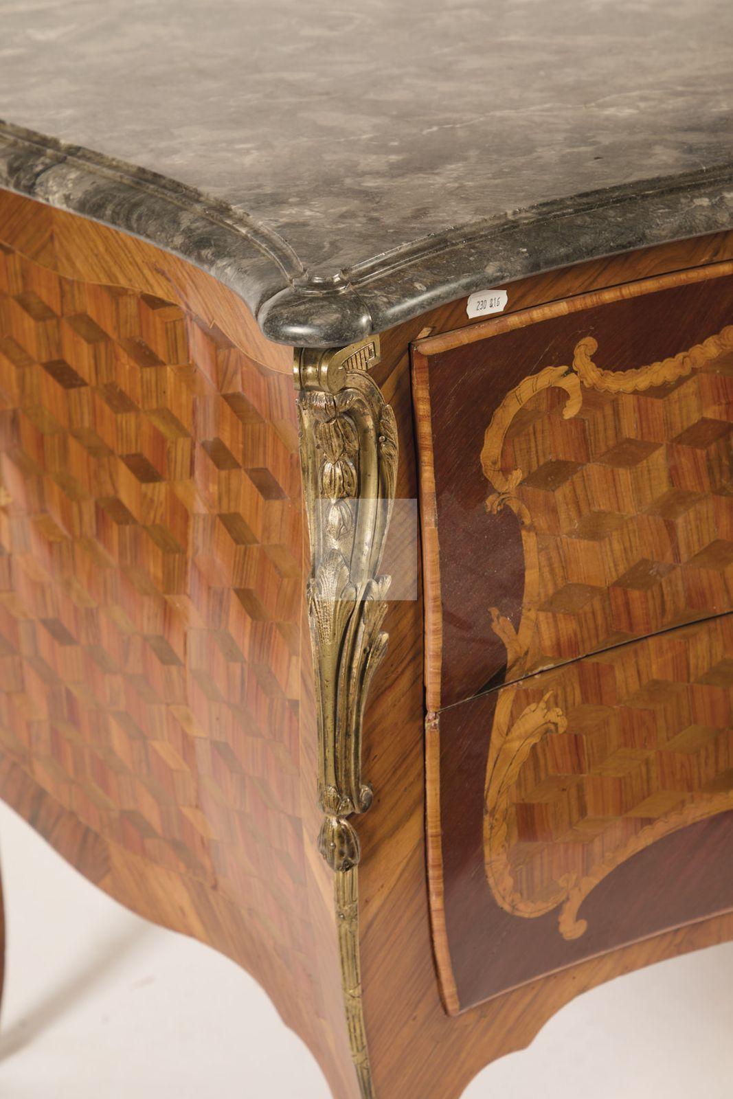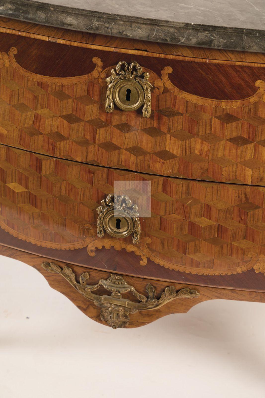 Lot n°428-B - 428 bis Commode à façade et côtés galbés en bois de placage et bois teinté à déc