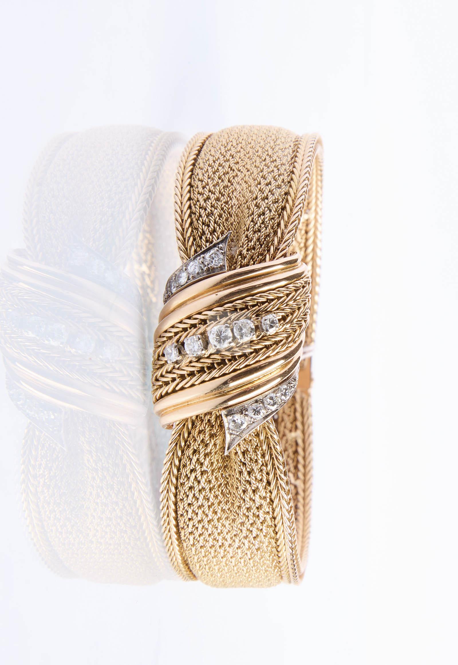145 REINE BLANCHE : Montre de dame en or tissé et plissé à couvre cadran souligné de lignes de diamants, années 50, mouvement mécanique, poignet 16,8 cm, poids brut 50,27 g