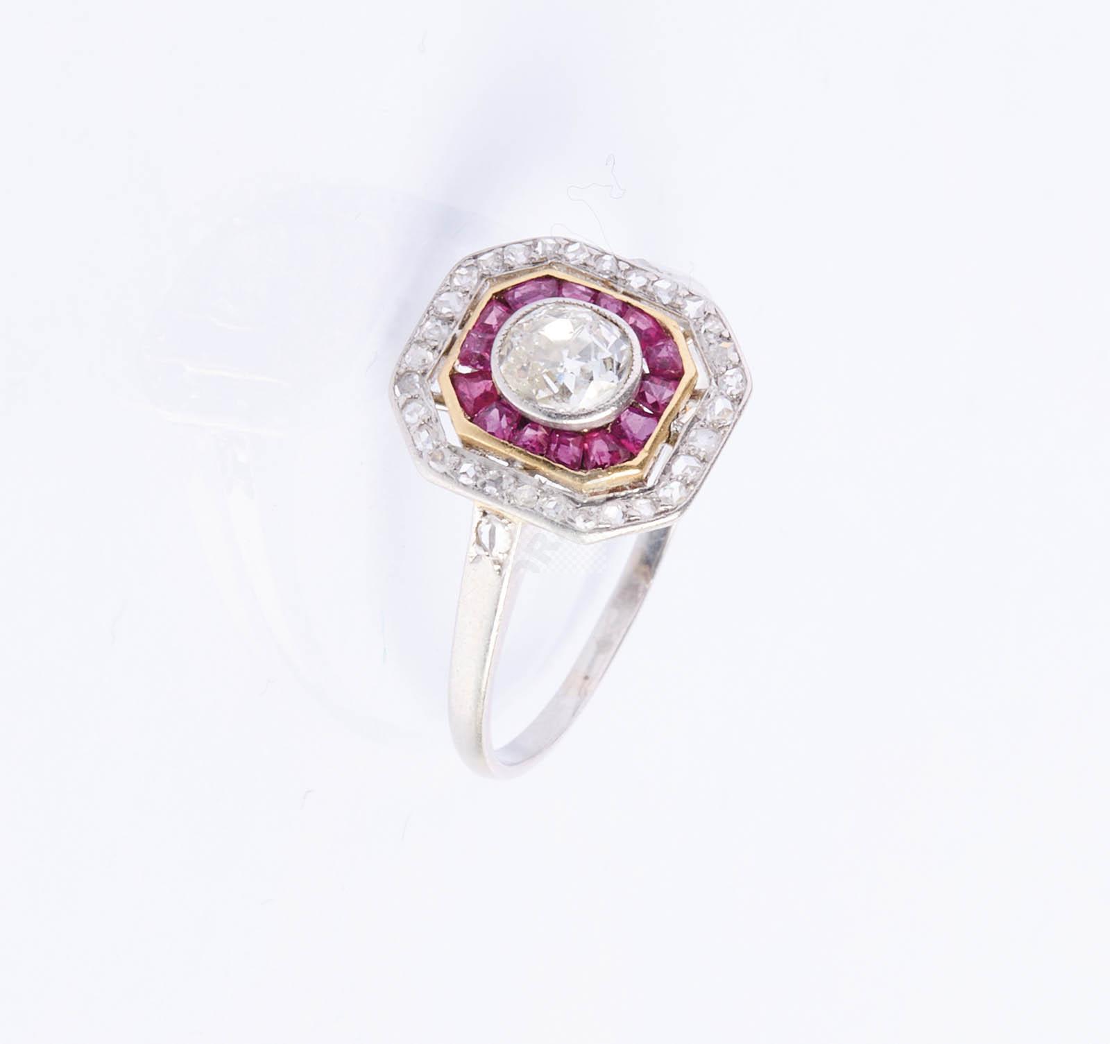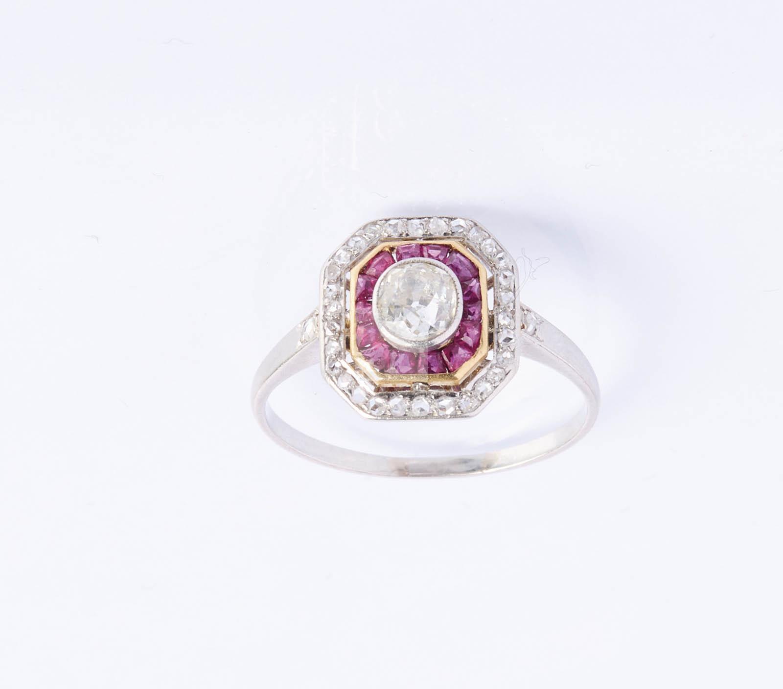 200 Bague en or gris 750/1000 de forme octogonale sertie d’un diamant de taille ancienne d’environ 0,40ct dans un entourage de rubis calibrés et roses de diamants.