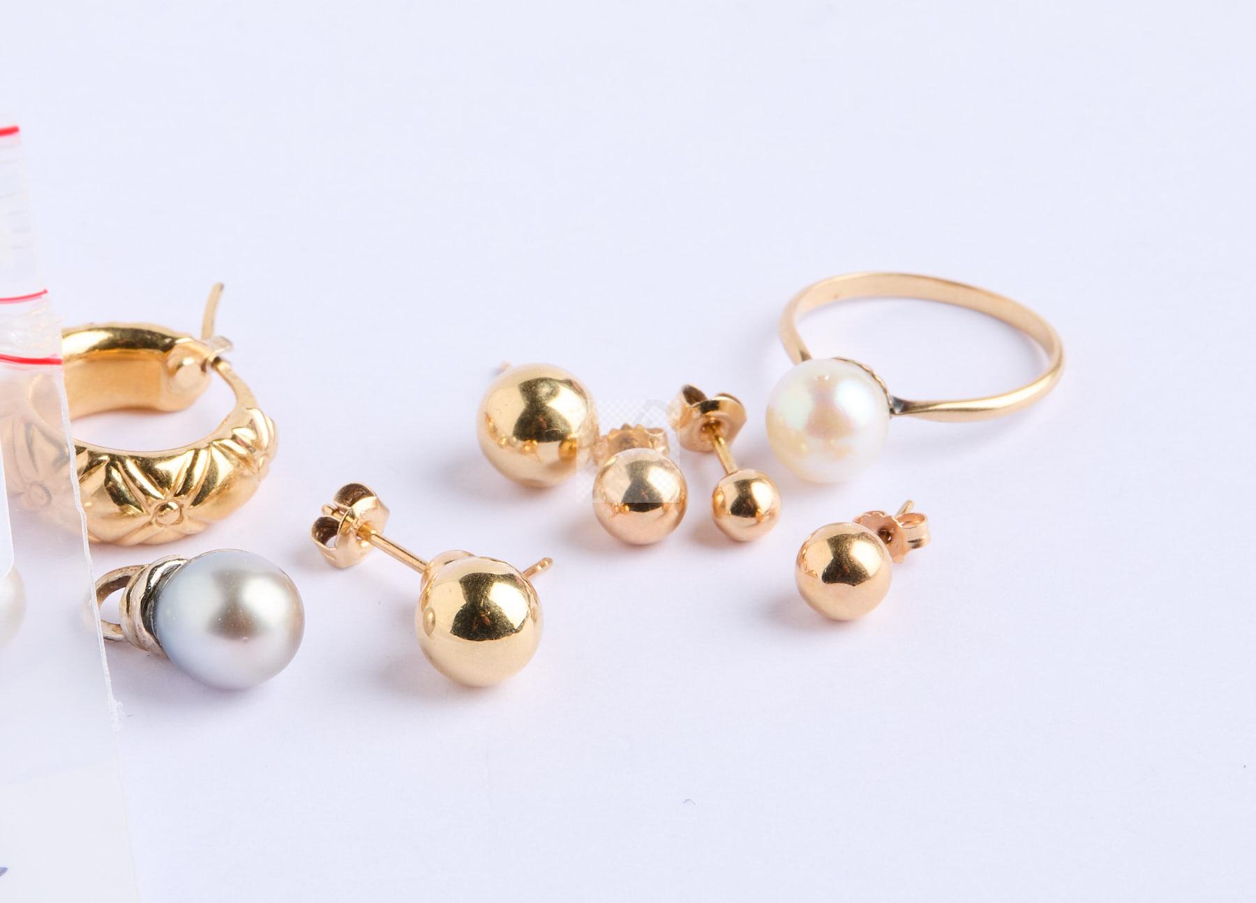 33 Trois paires de clous d’oreille or (manque 2 poucettes) poids 2,4 g on joint une bague or et perle de culture de 7,5 mm, tour de doigt 49, poids brut 1,8 g on joint une créole or 1,4 g , une perle de culture de 6,7 mm sur or 0,7 g et une perle de culture grise de Tahiti de 8,3 mm sur or poids brut 1,7 g soit environ 8,1 g brut