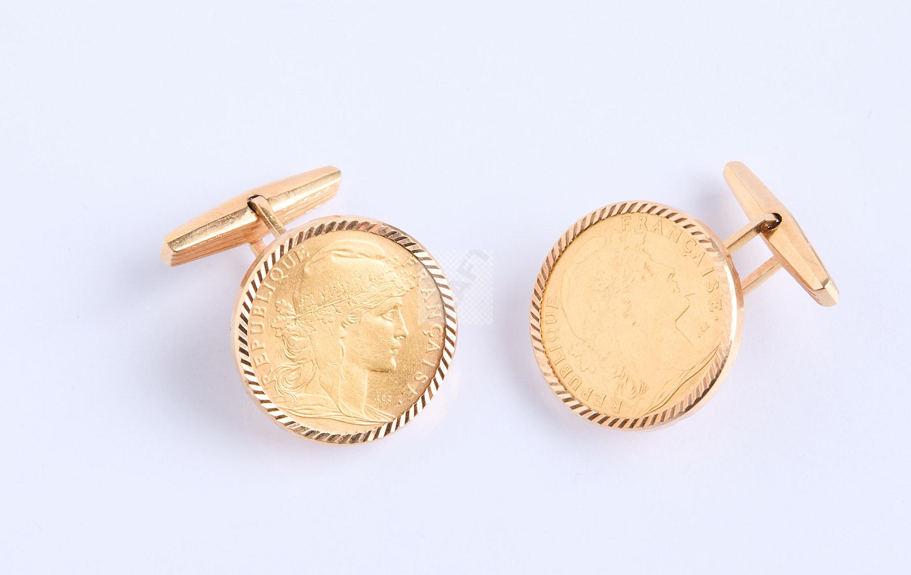 Lot n°75 - 75 Paire de boutons de manchettes en or sertis de copies de pièces de 20 F, poid