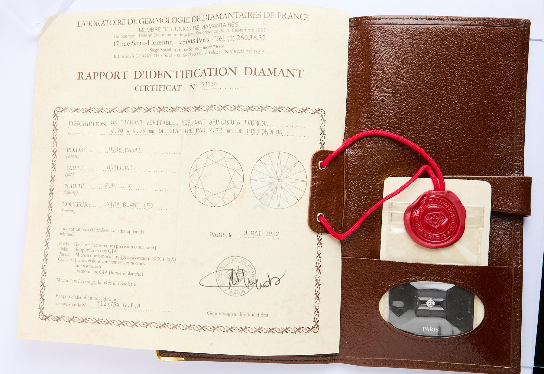 78 Diamant brillanté sous scellé et son attestation de poids 0,36 ct, couleur F et pureté IF (x10)