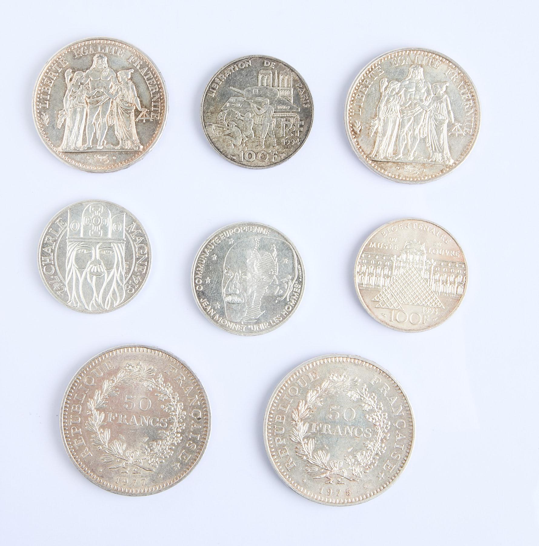 193 Pièces en argent : 100 F x 4, 10 F Hercule x 2; 50 F Hercule x 2, poids 170 g