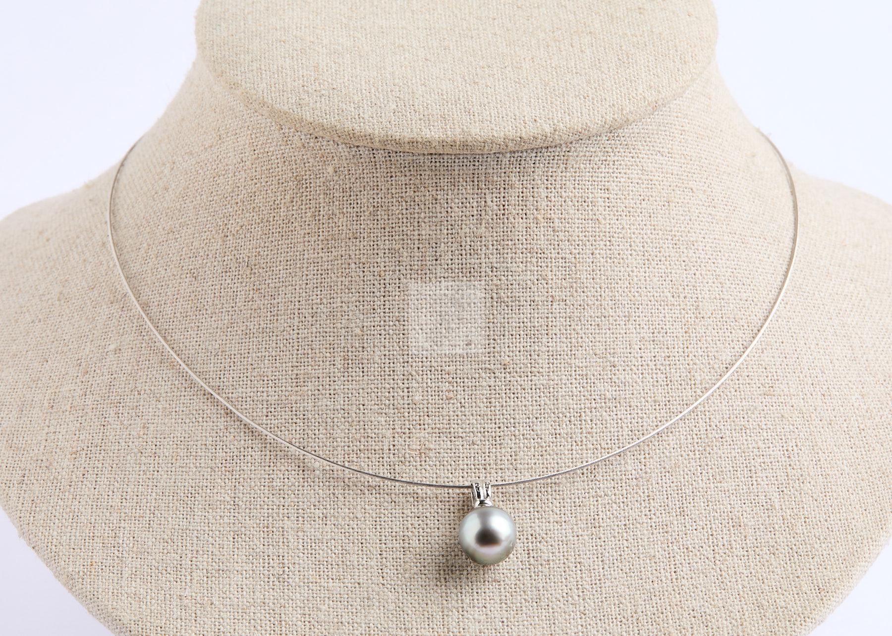 378 Pendentif en or gris serti d’une perle de culture de Tahiti de 9,3 mm sur collier câble en or gris , poids 2,8 g
