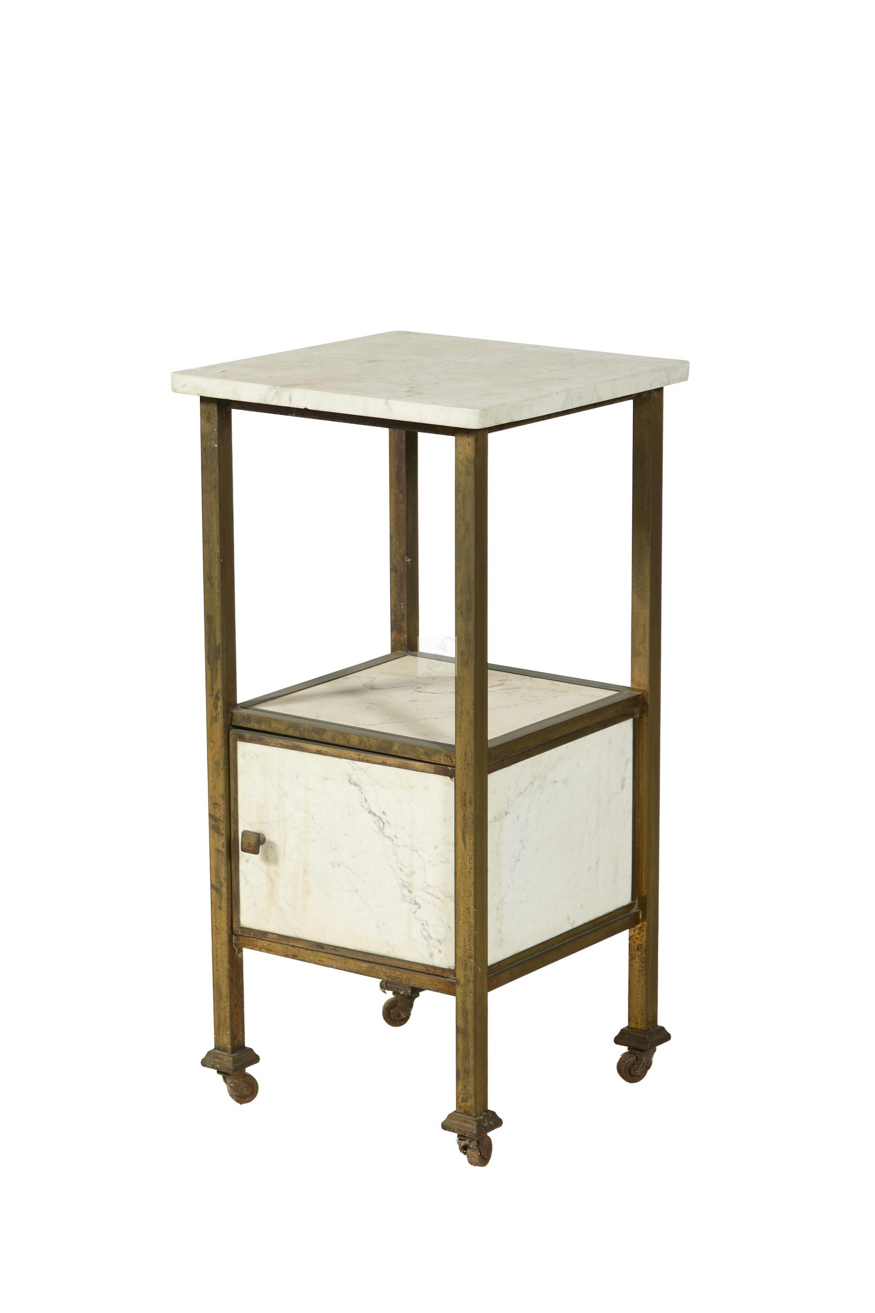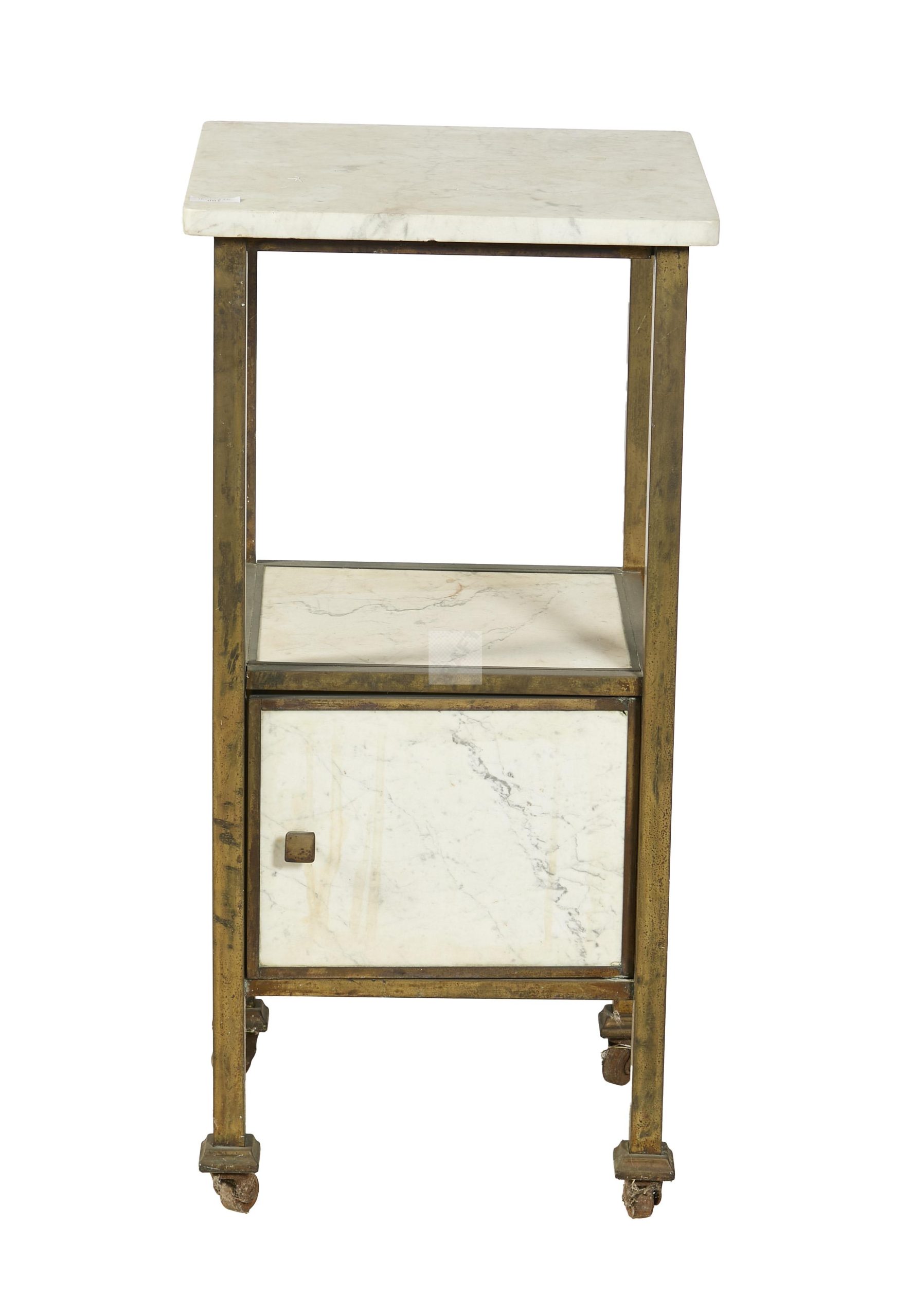 1 Chevet à structure en métal argenté et plateau de marbre blanc veiné, caisson de rangement en entretoise, argenture abîmée, 82×40.5×40.5 cm