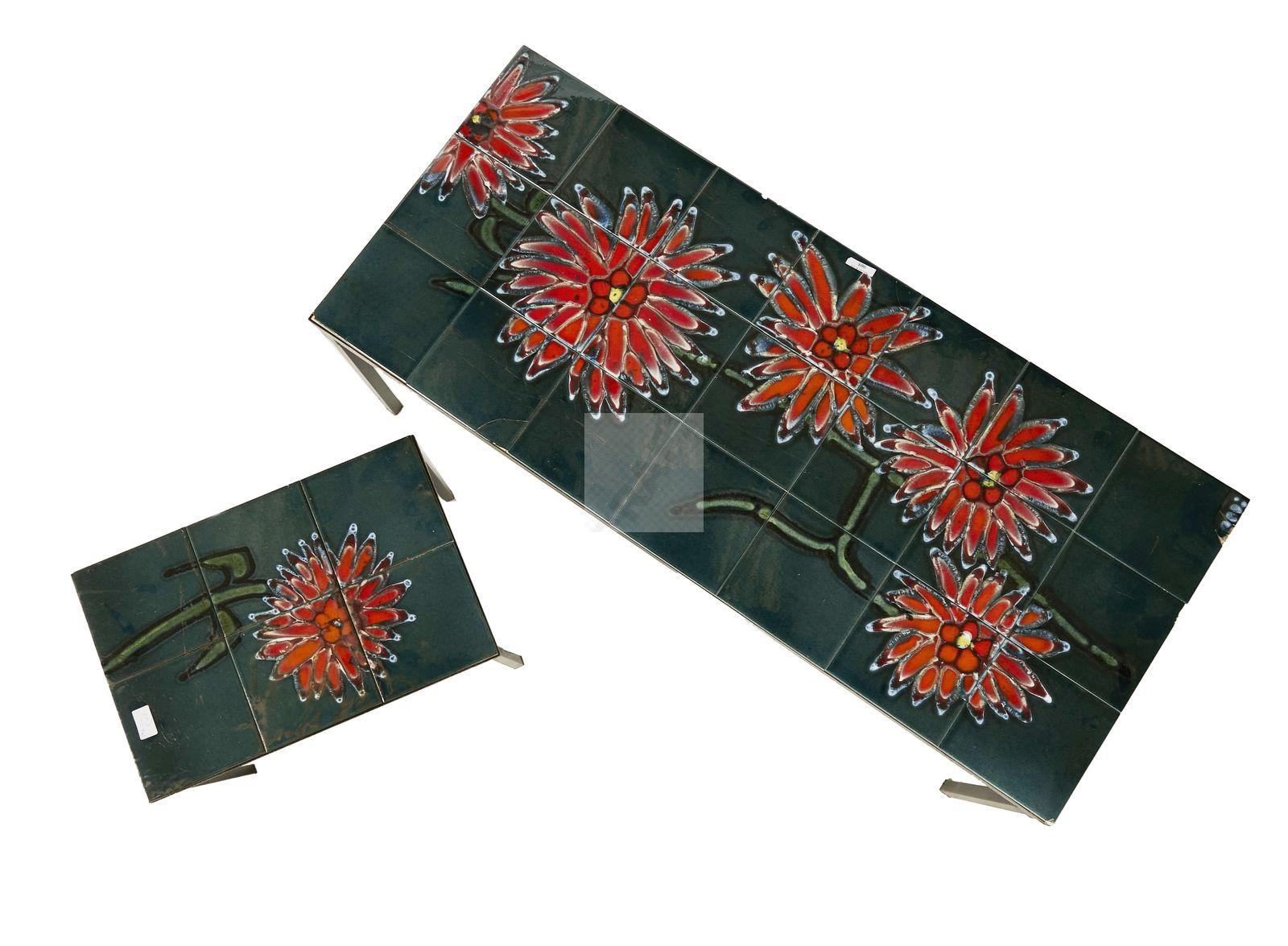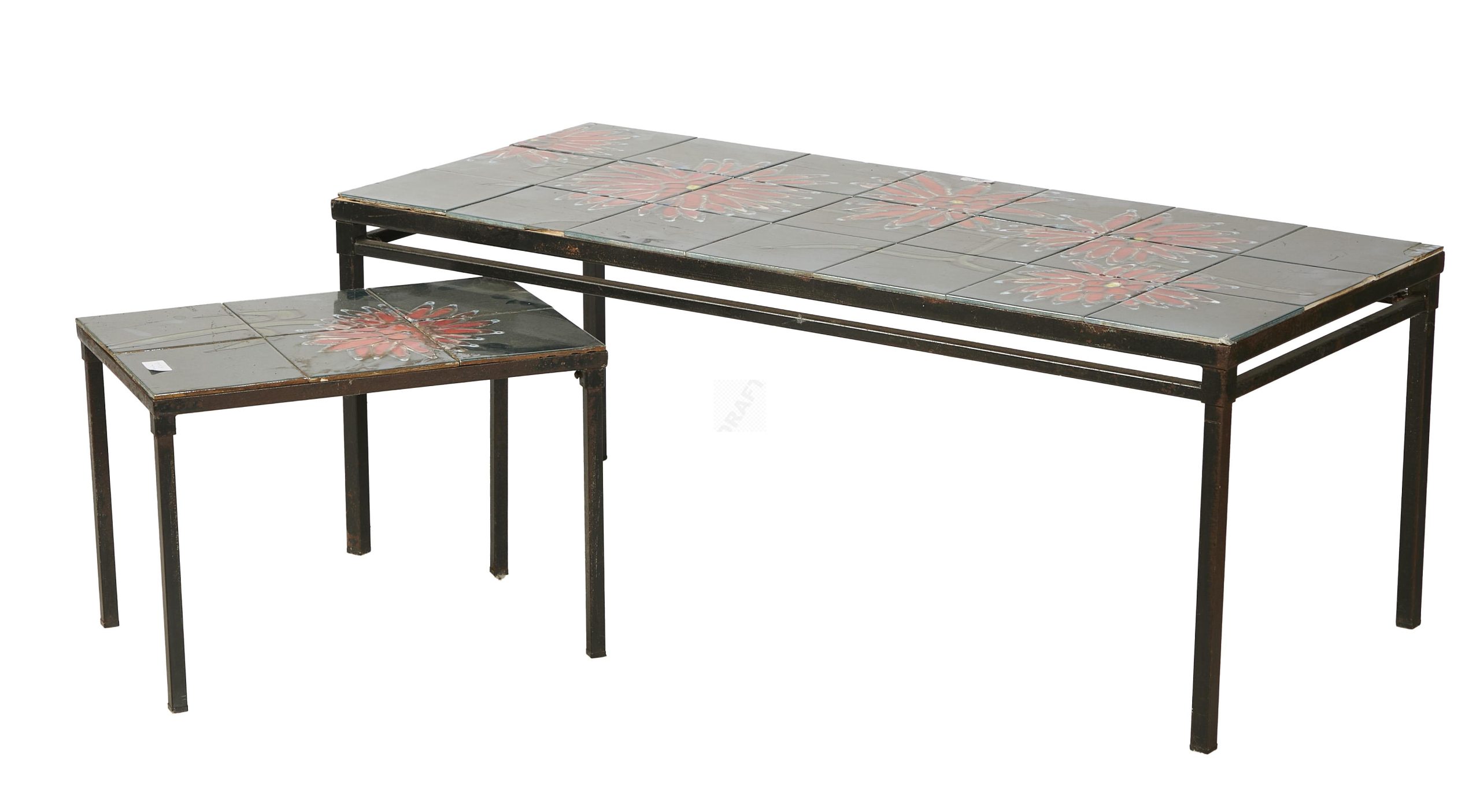 5 Suite de deux tables basses, à piètement en métal, les plateaux en carreaux de céramique émaillée à motifs floraux, accidents, 41x108x46 cm et 33×46.5×31 cm