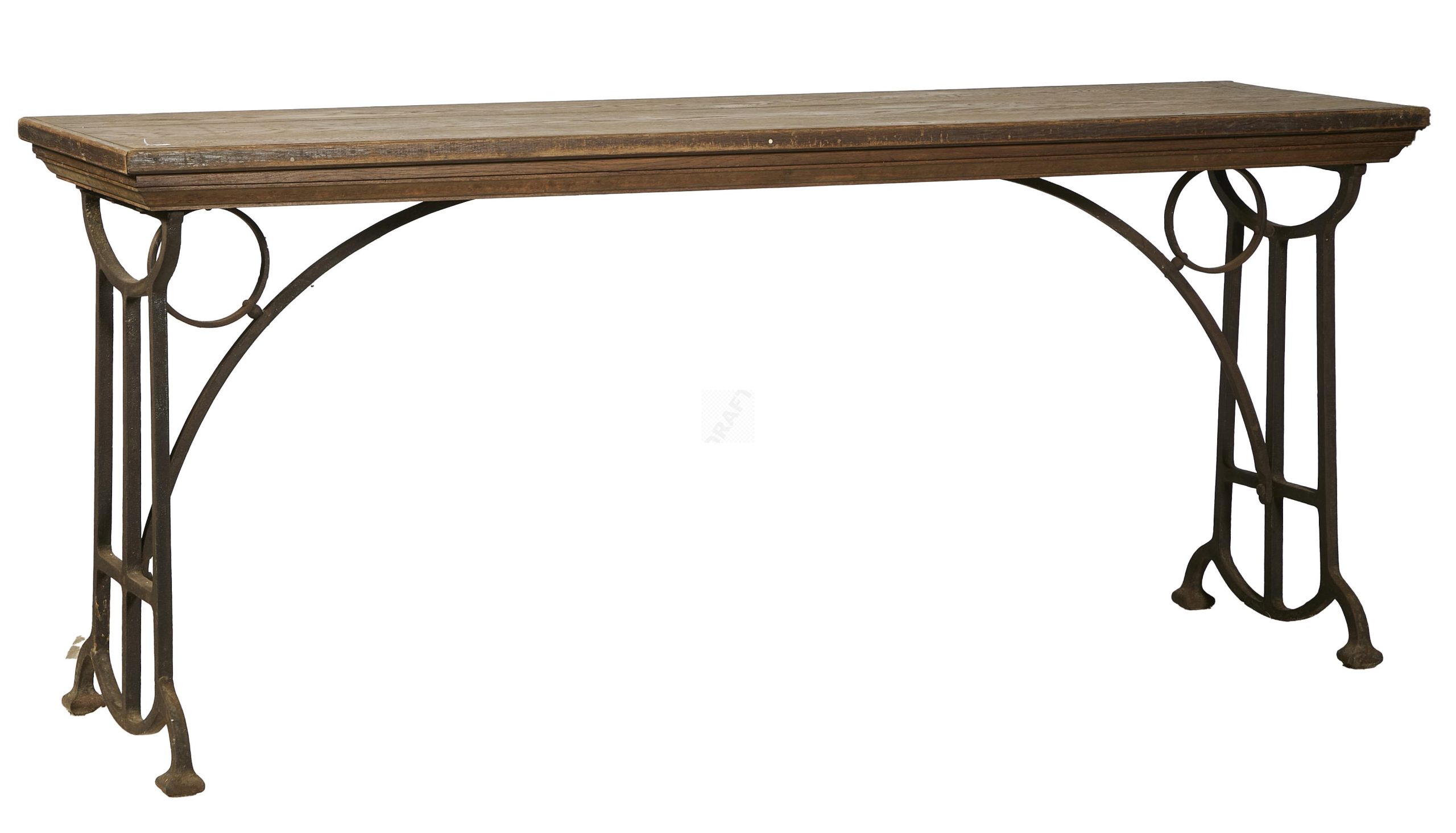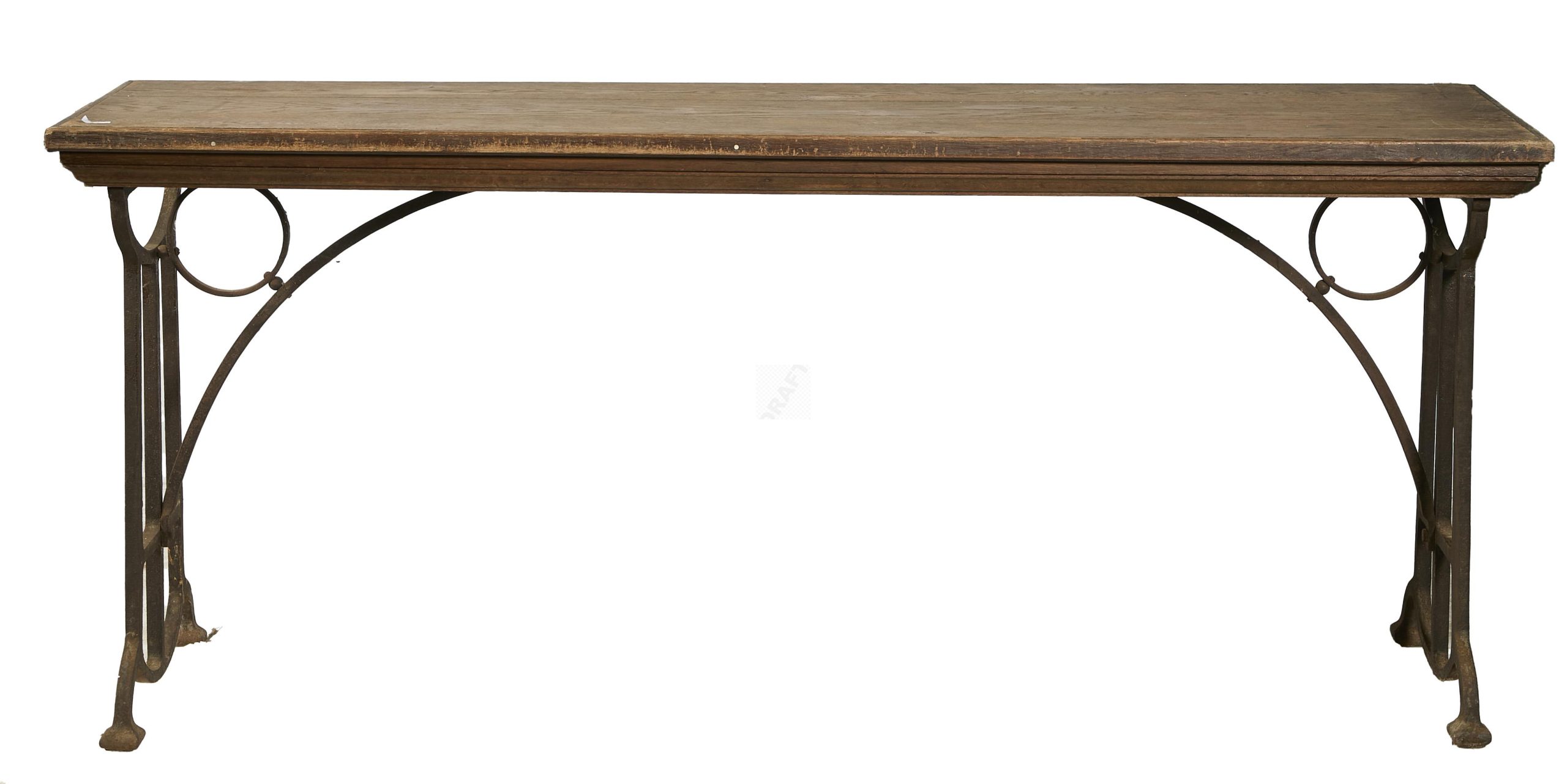 6 Console à plateau en bois posant sur un piètement en fer forgé, à structures latérales ajourées. 86x200x54 cm