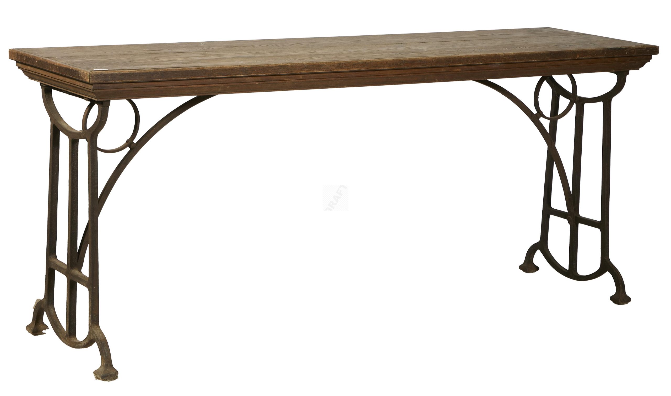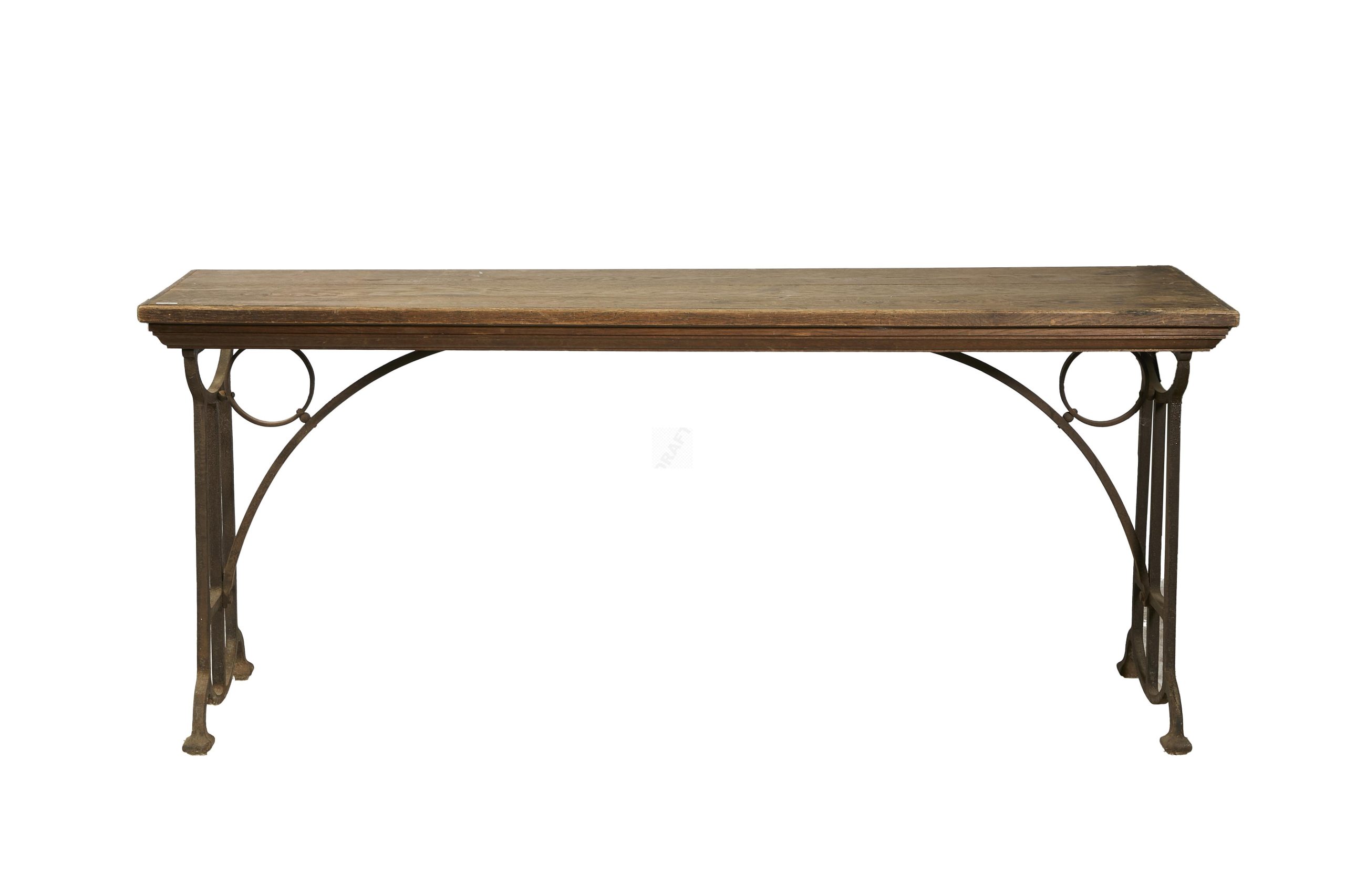 7 Console à plateau en bois posant sur un piètement en fer forgé, à structures latérales ajourées. 86x200x54 cm