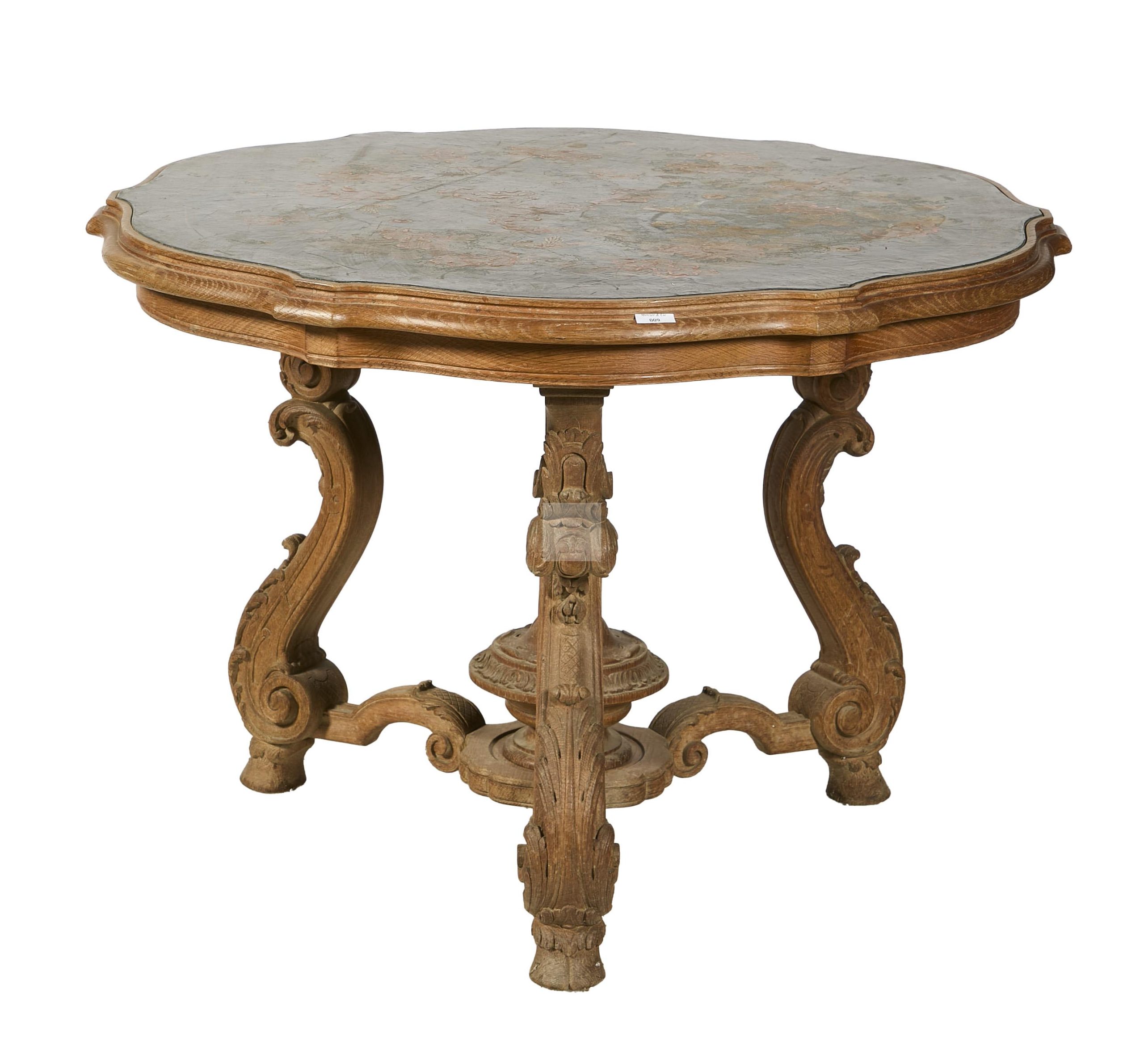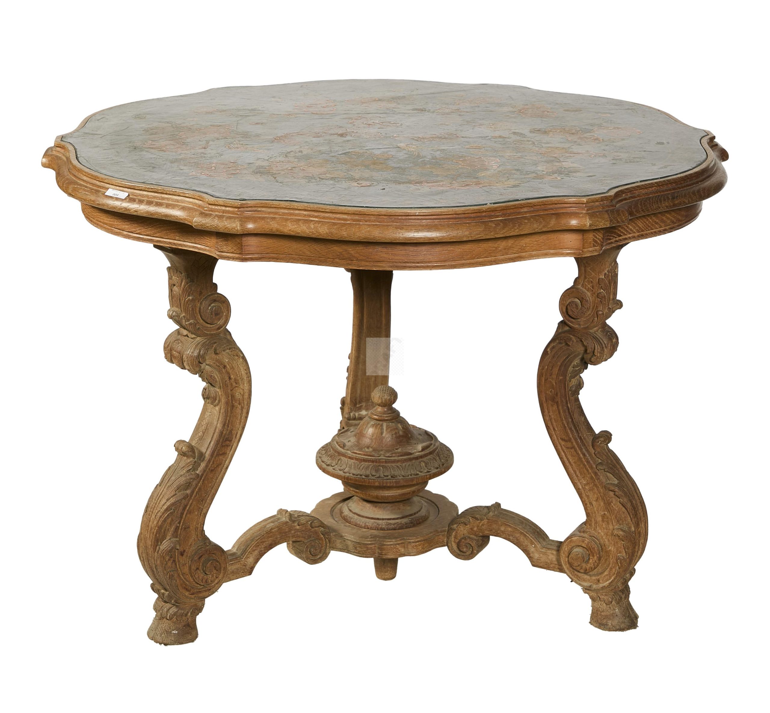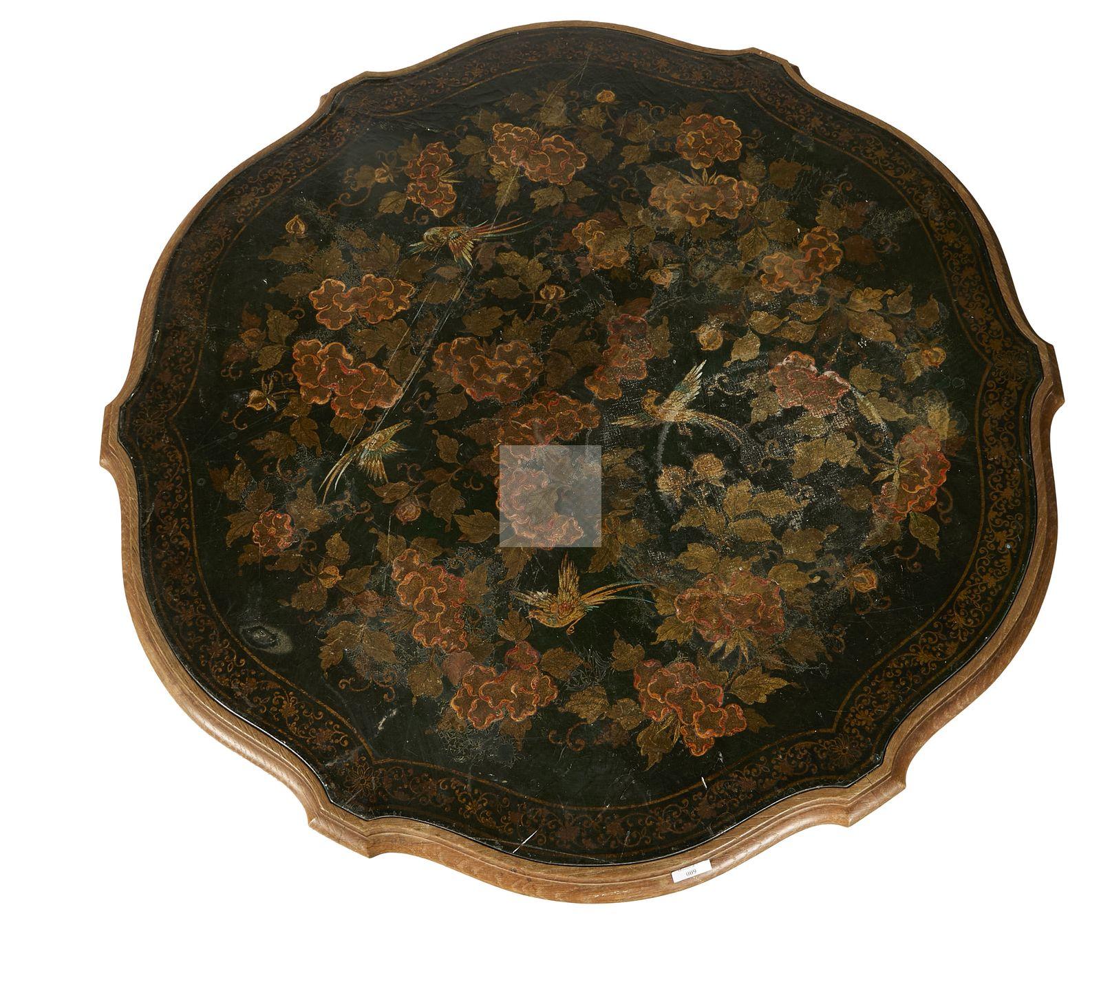 9 Guéridon en chêne à piètement tripode feuillagé et plateau polylobé laqué à décor polychrome sinisant, plateau en état d’usage, 73×105 cm