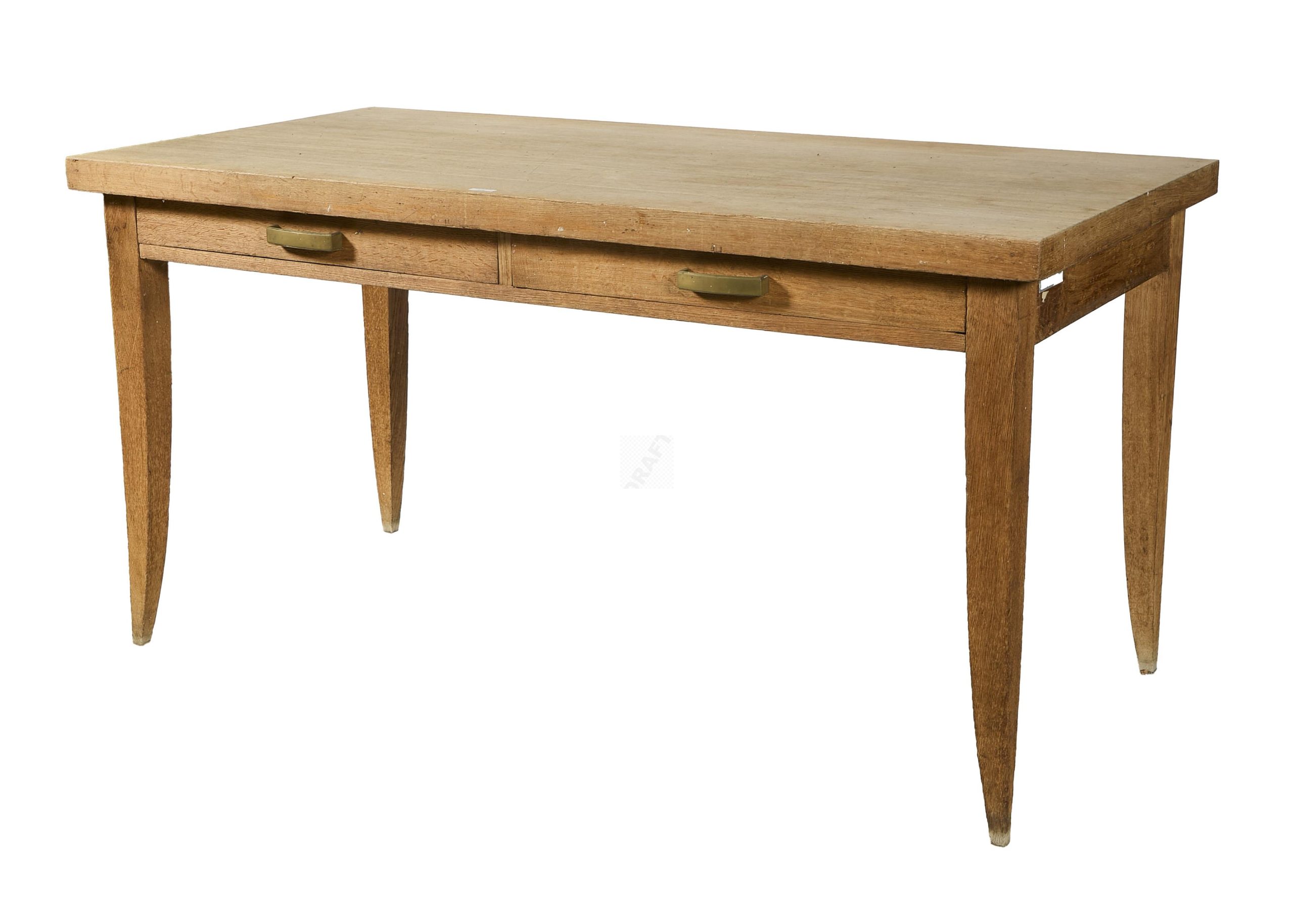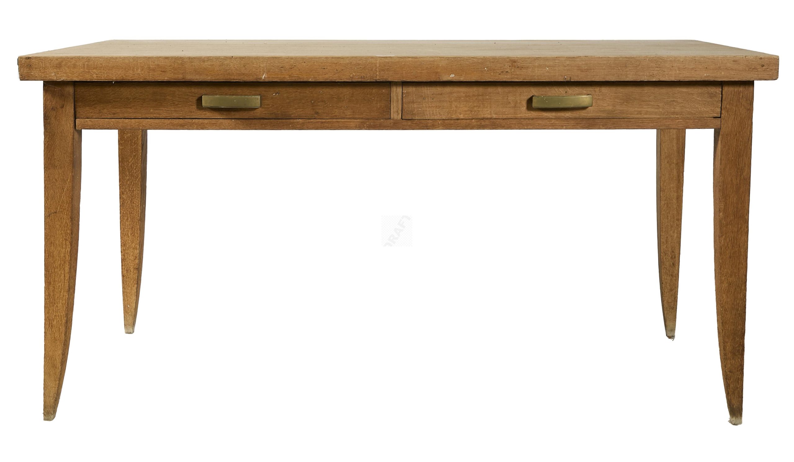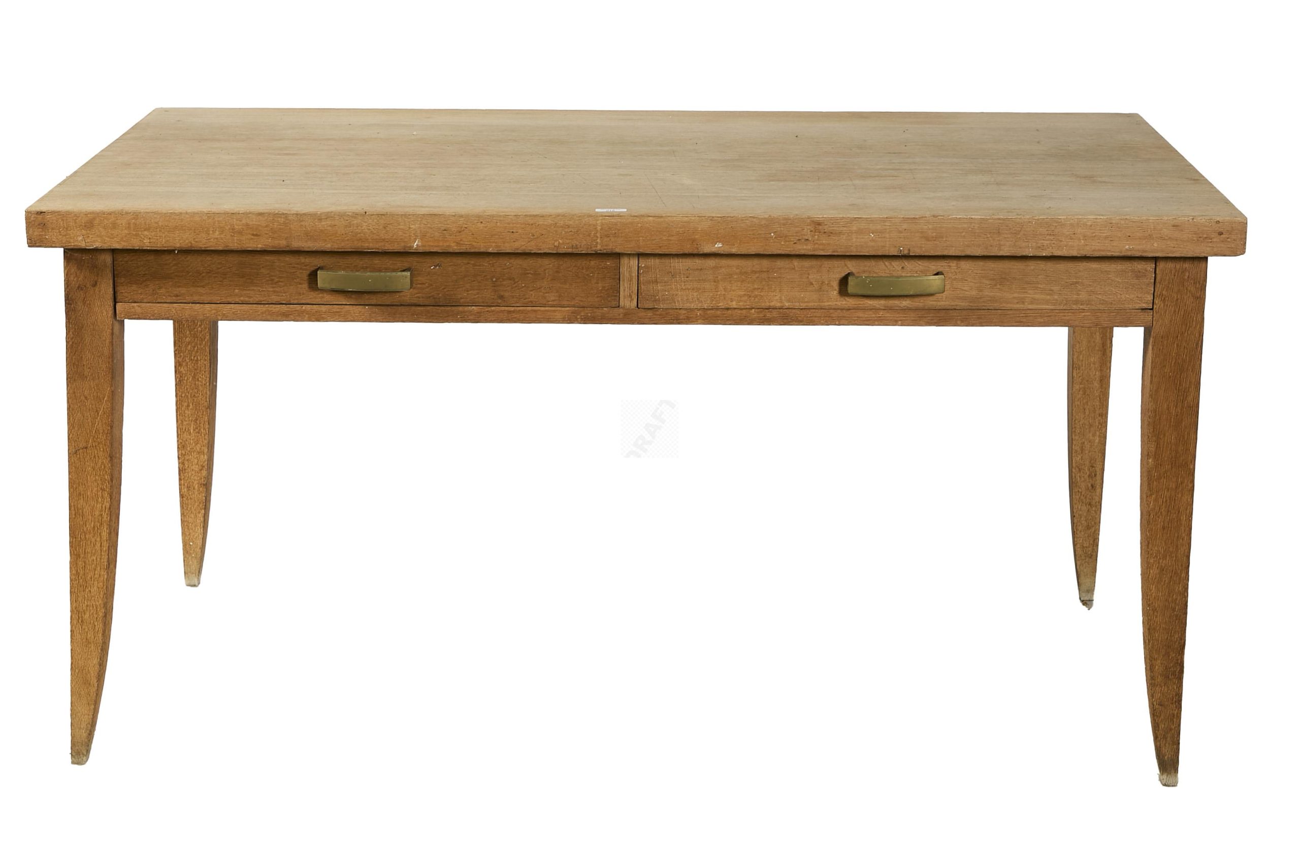 18 Bureau en chêne, ouvrant par deux tiroirs en ceinture à poignées en bronze, pieds légèrement galbés, circa 1950, état d’usage, 77x150x75 cm,