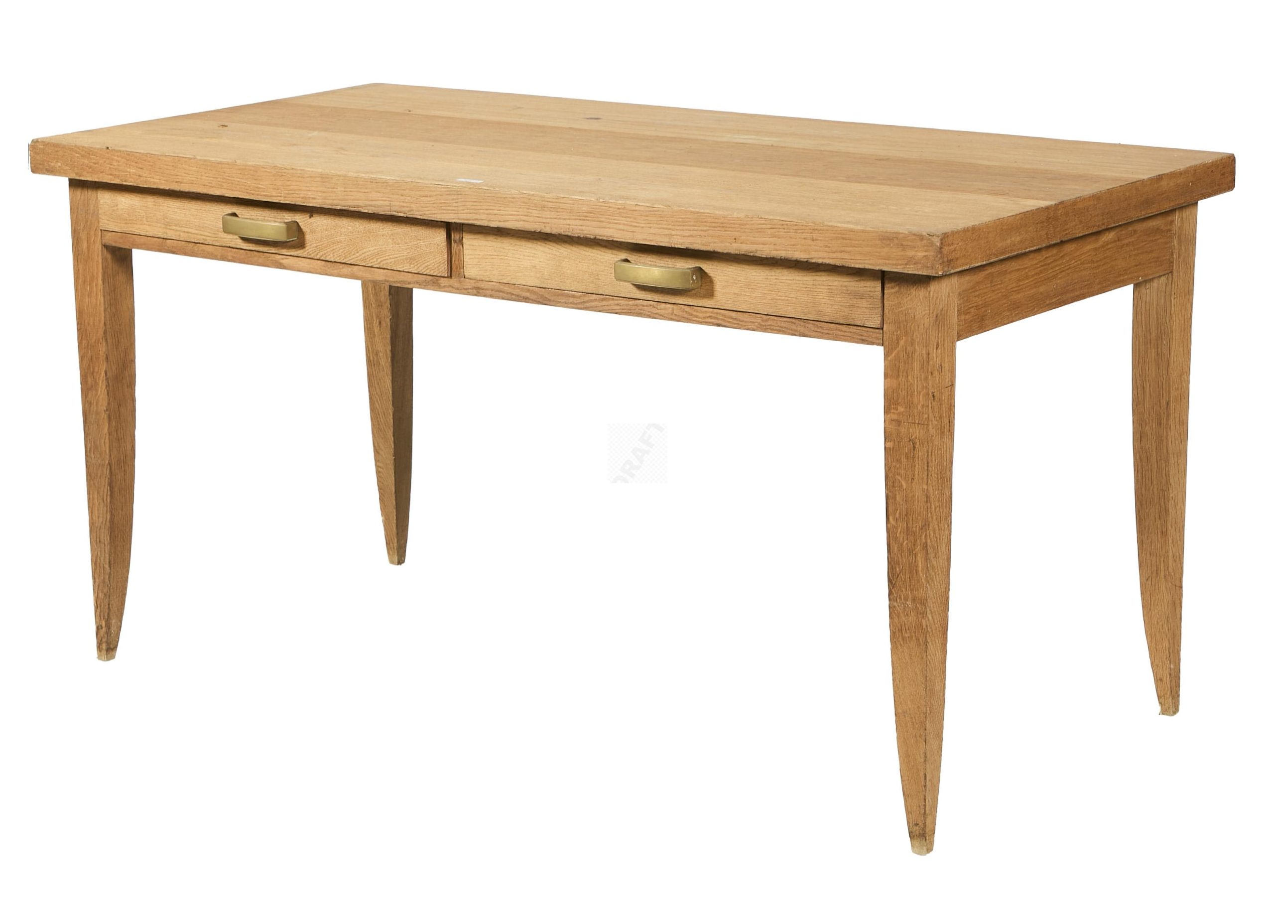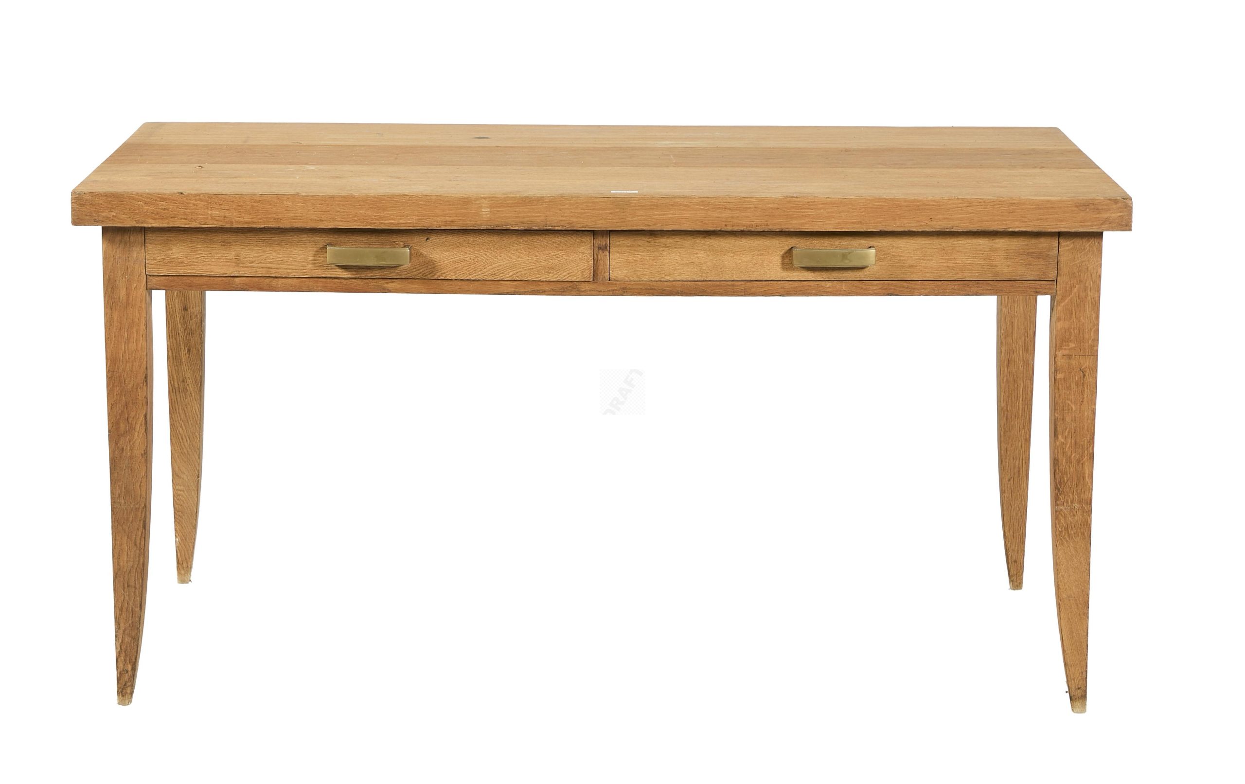 23 Bureau en chêne, ouvrant par deux tiroirs en ceinture à poignées en bronze, pieds légèrement galbés, circa 1950, état d’usage, 77x150x75 cm