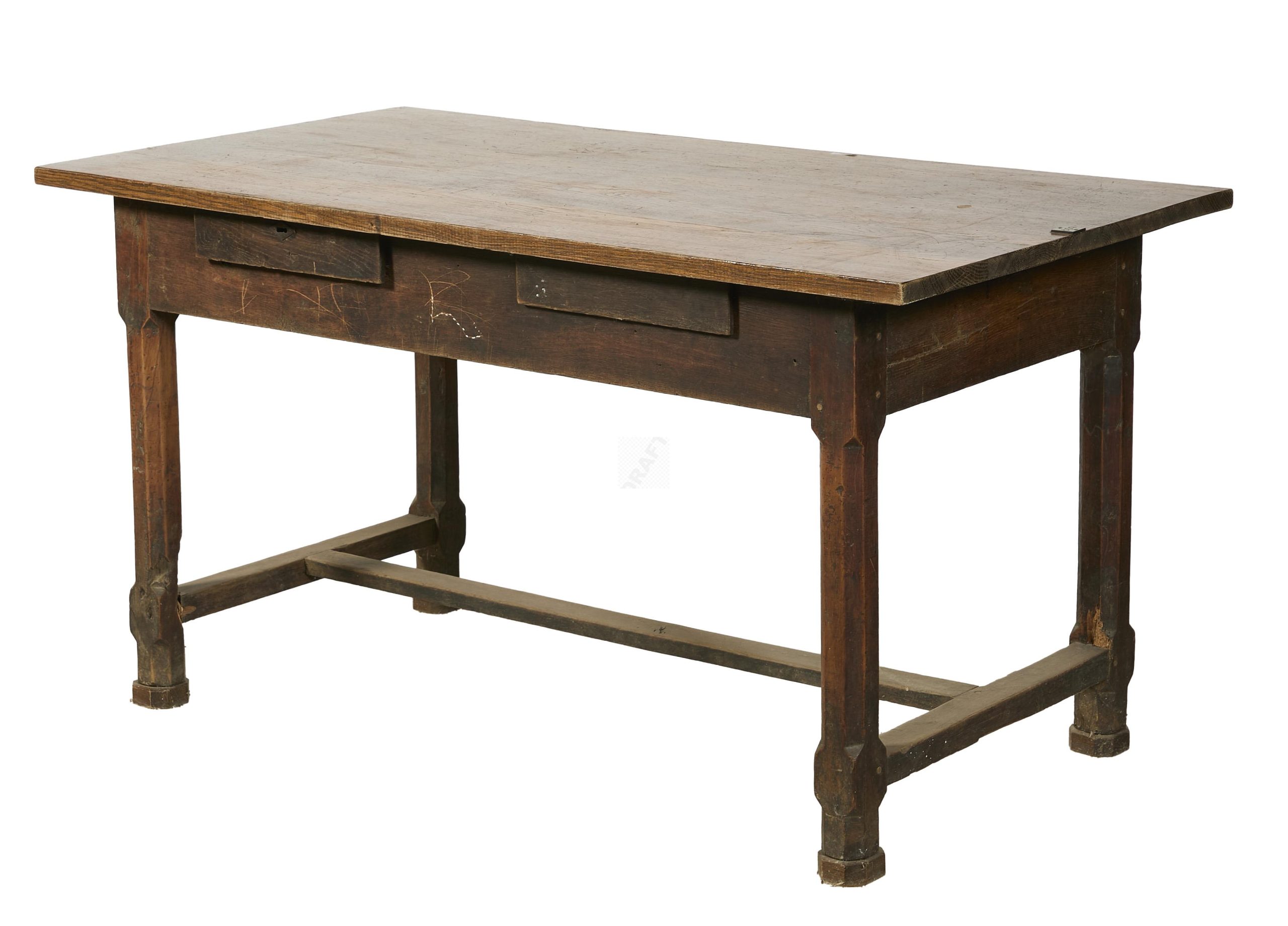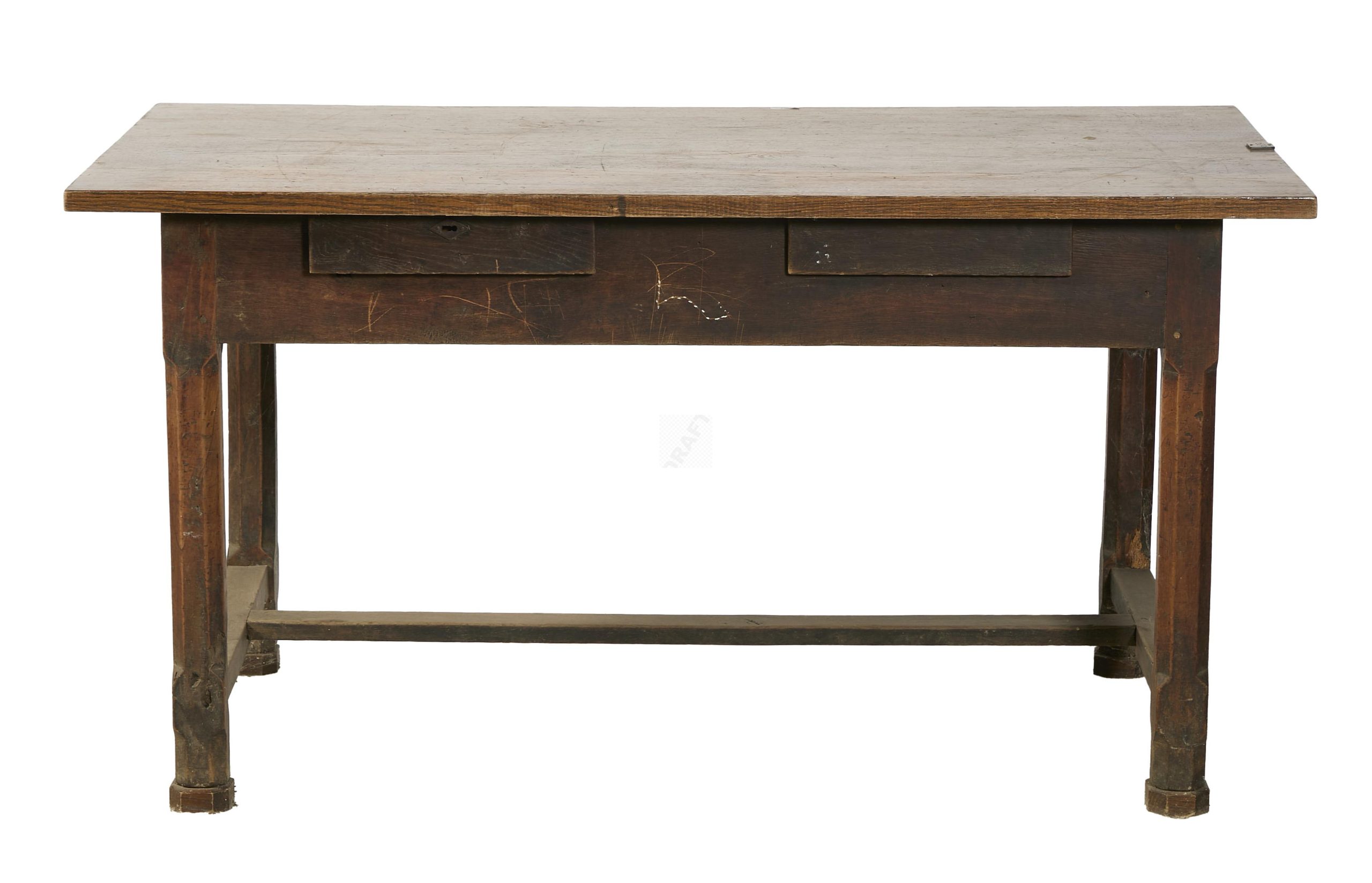 Lot n°32 - 32 Table en chêne à entretoise en H, présentant deux tiroirs en ceinture, usures
