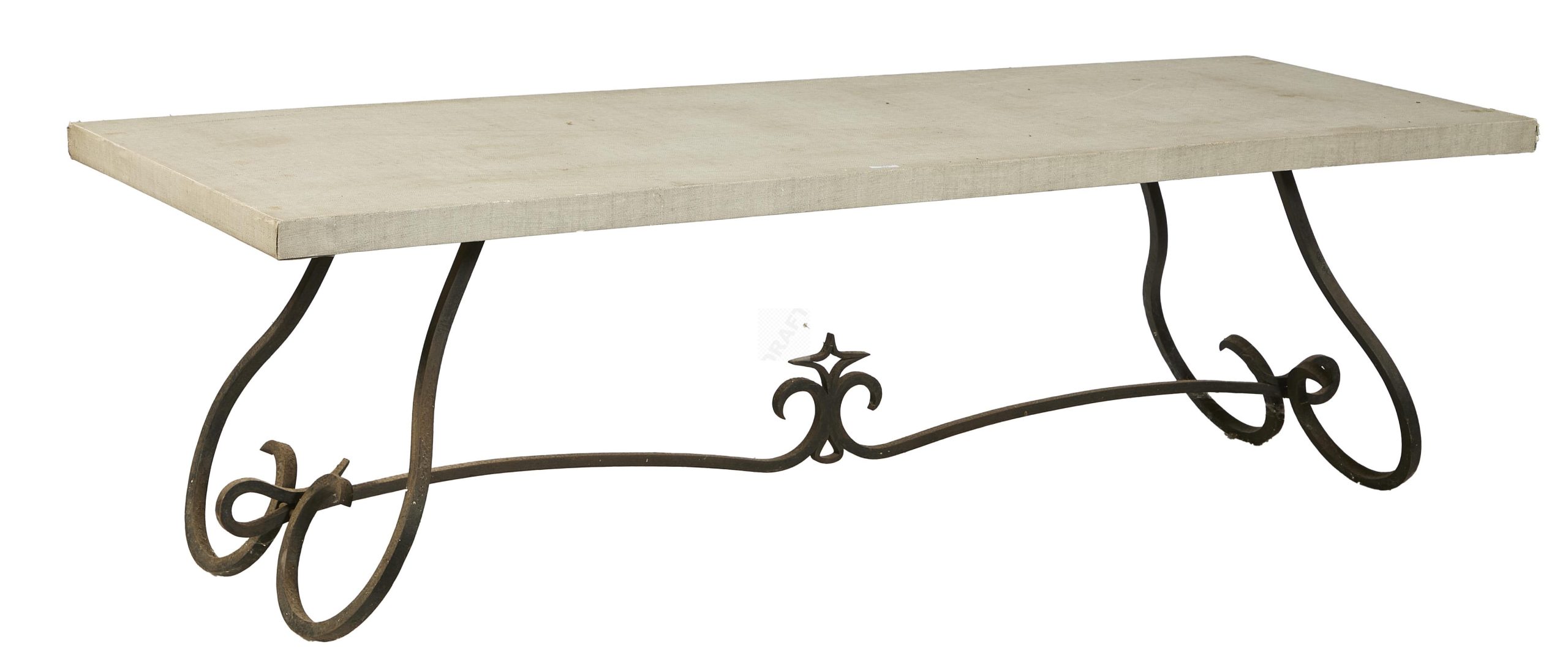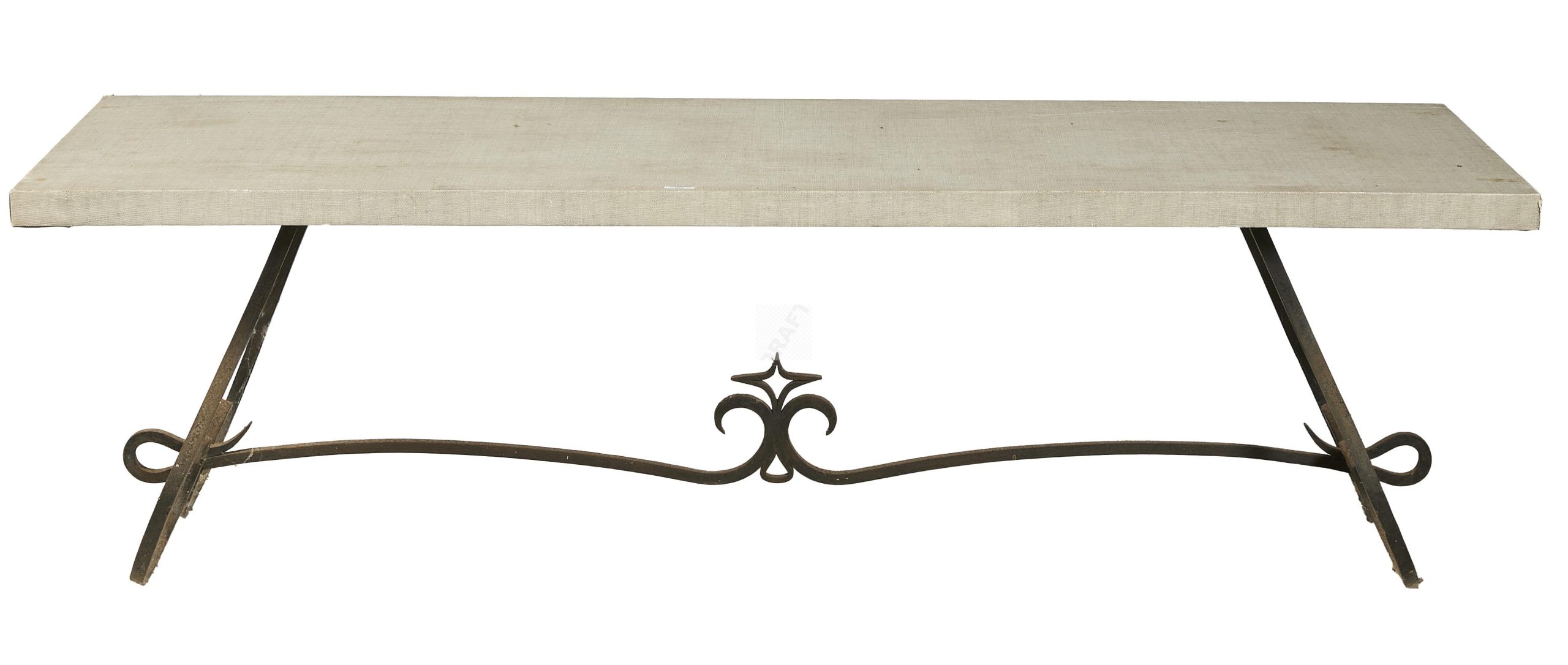 33 Piètement de table basse en fer forgé circa 1940, plateau gainé de toile enduite, 56x190x65 cm