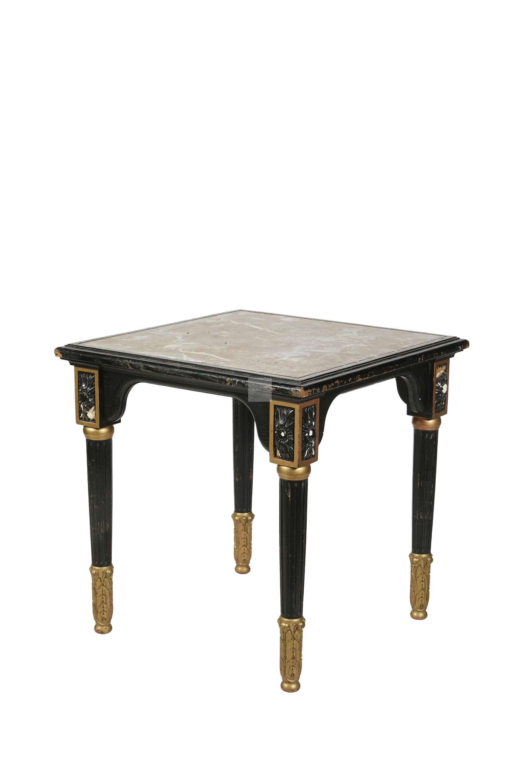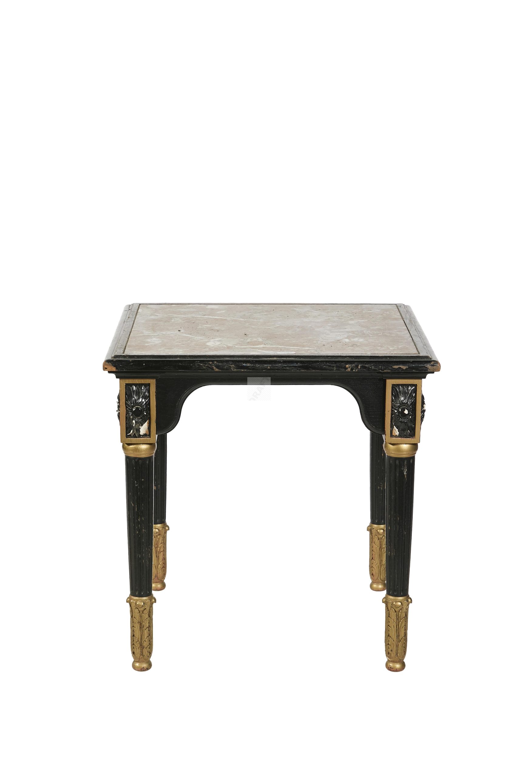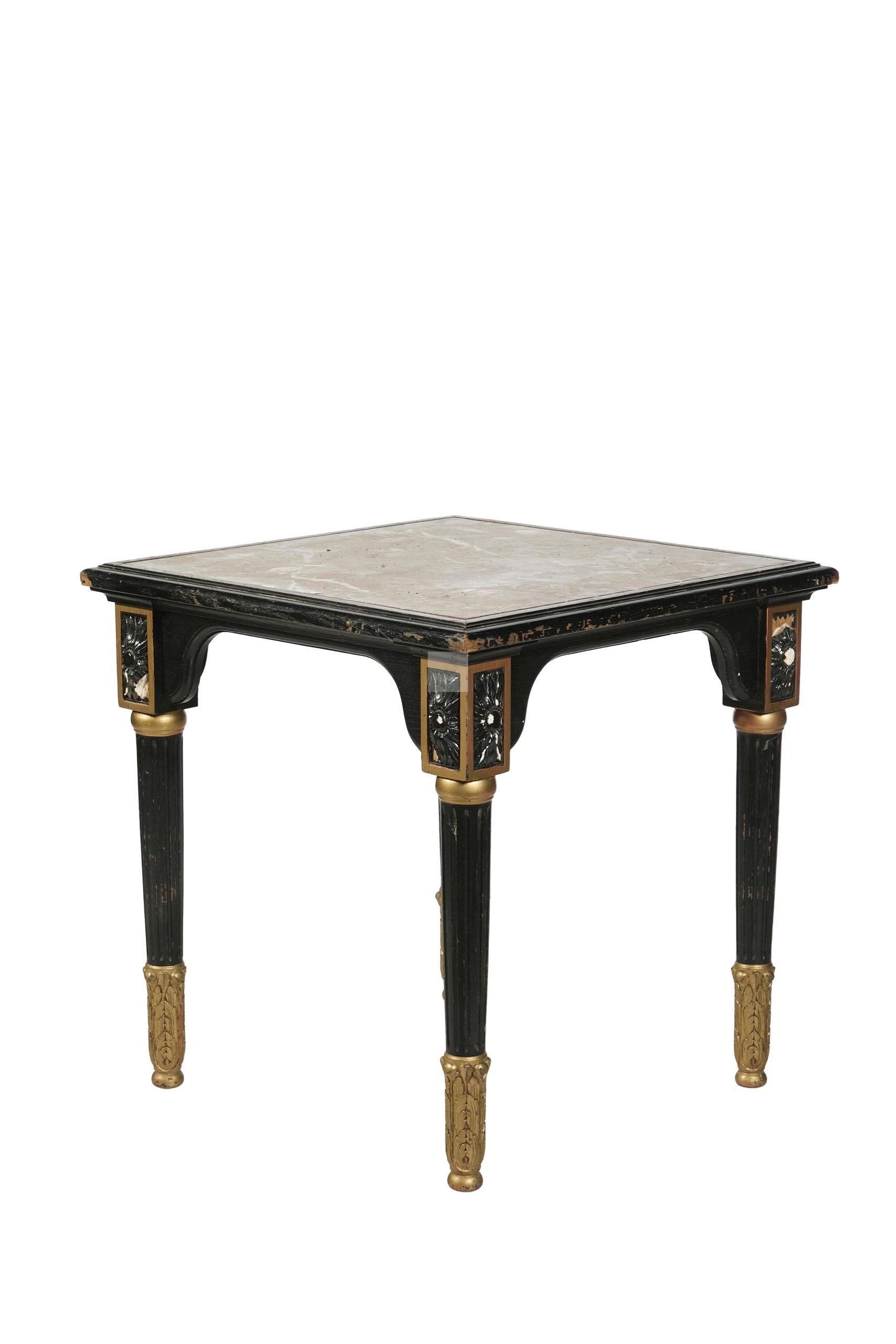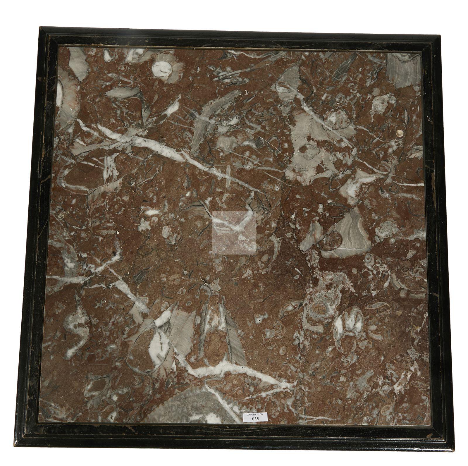 Lot n°35 - 35 Table à section carrée, plateau de marbre veiné ceint de bois noirci, pièteme