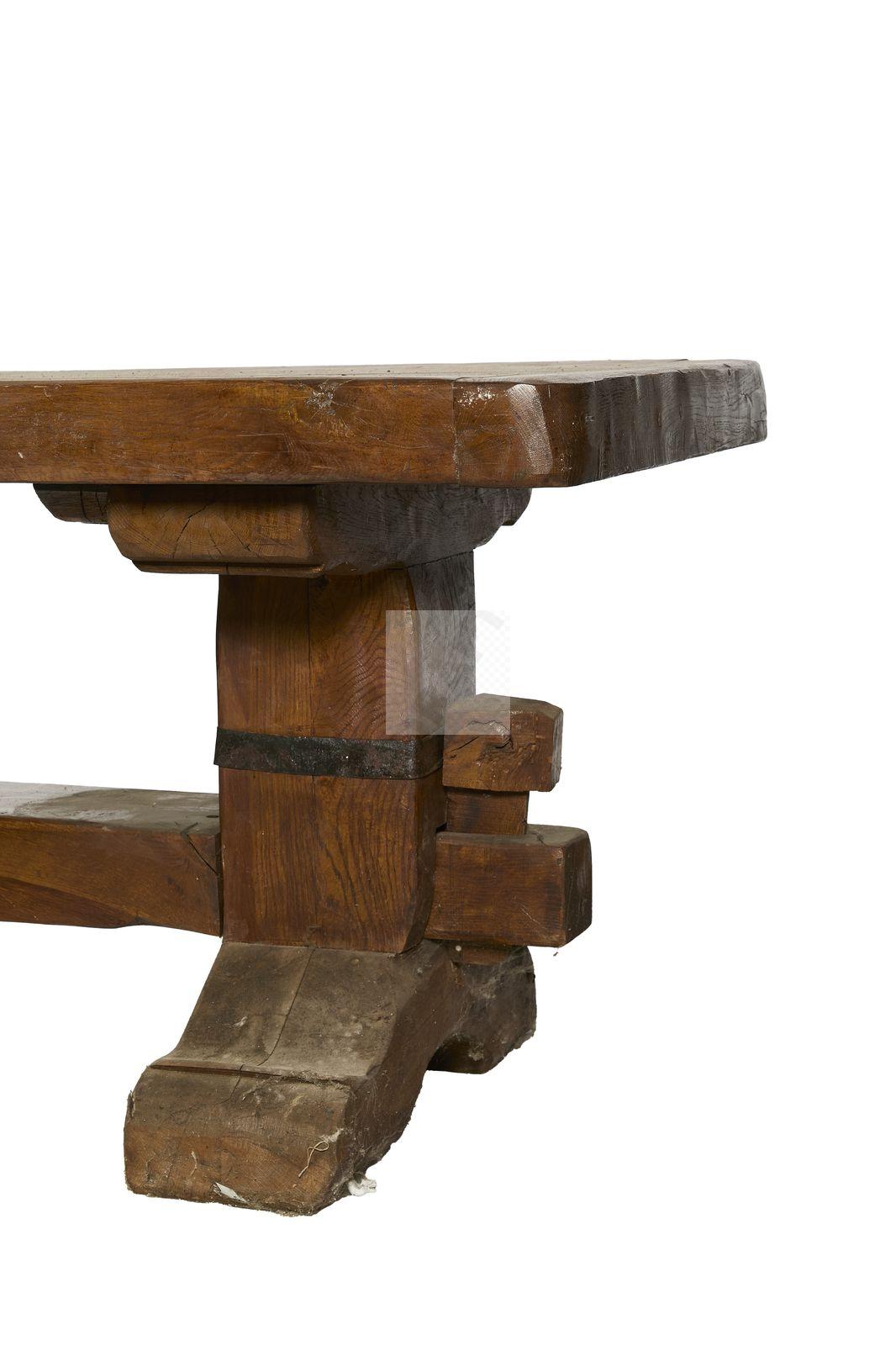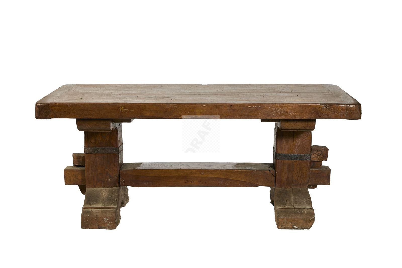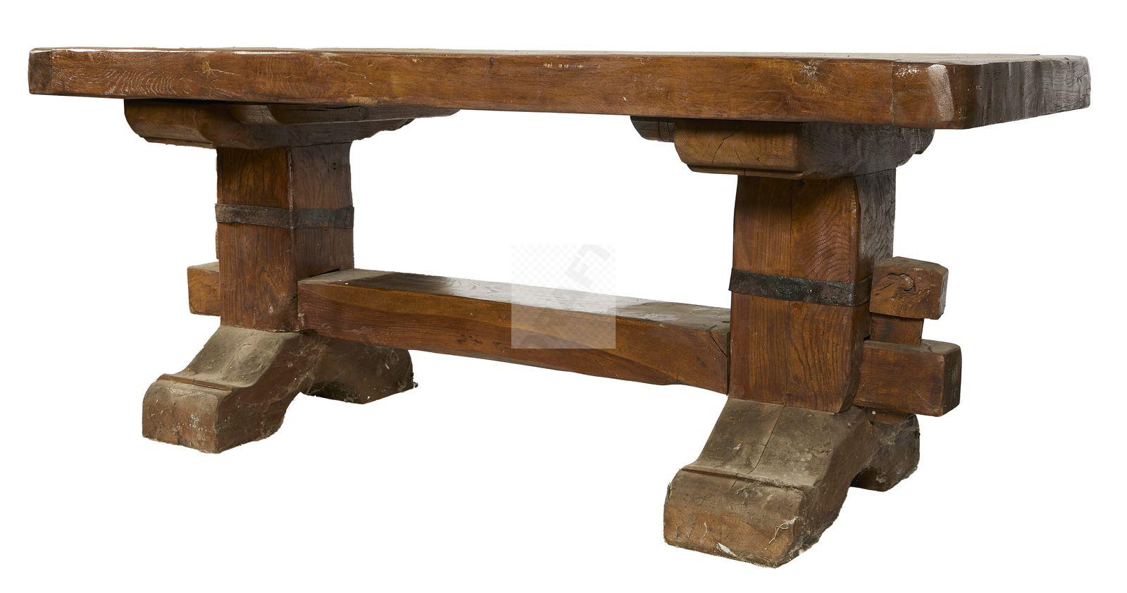 41Une table ovale à allonges de style Henri II, accidents au piètement, 73x158x134 cm , on joint une table conventuelle en chêne à épais plateau de bois, 78x192x88 cm, une table de salon de style Louis XV en bois laqué (usures, manque le plateau), 50x110x60 cm, et une table rectangulaire en chêne mouluré à l’italienne, de style Henri II, 76x153x87 cm
