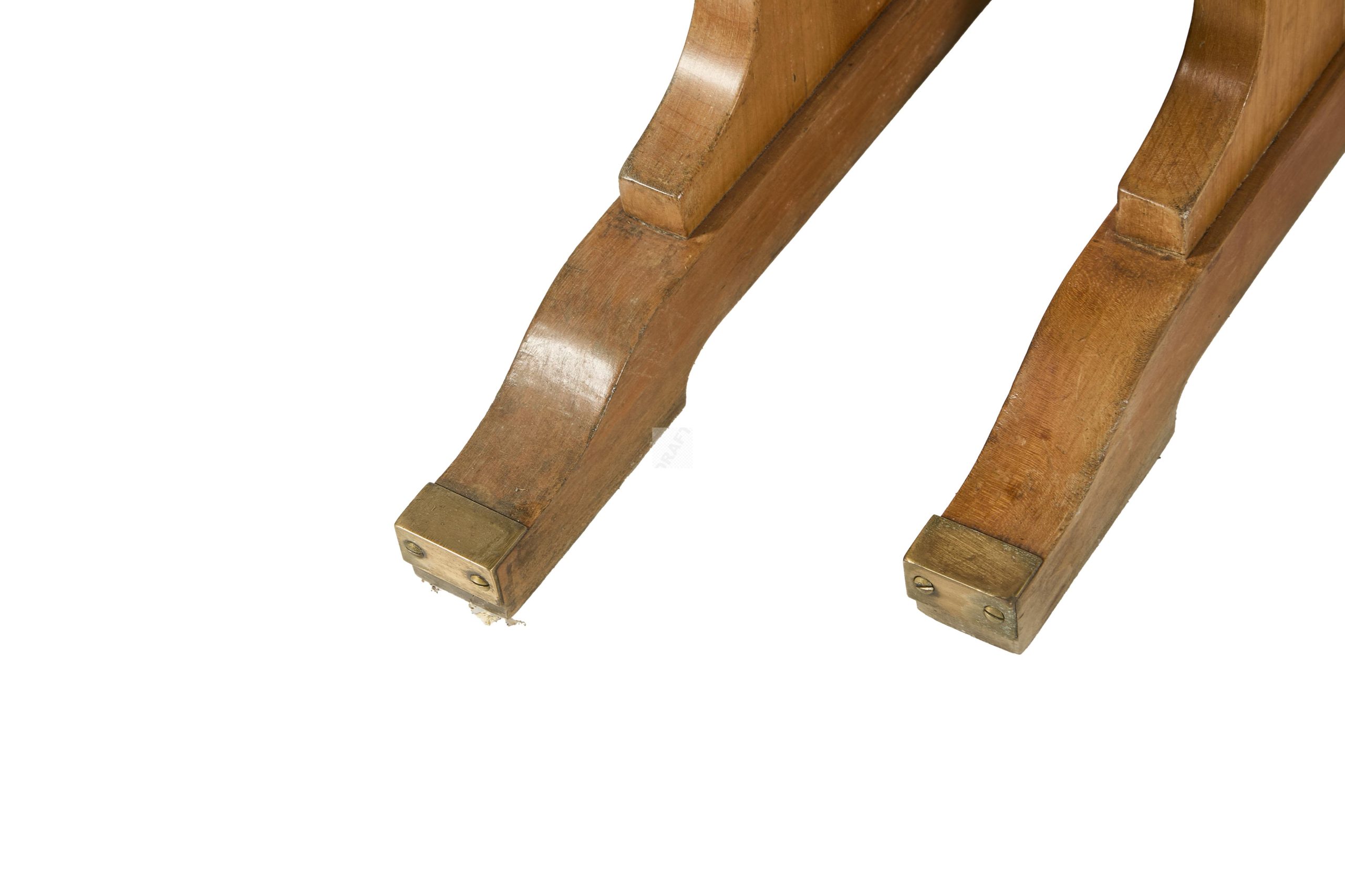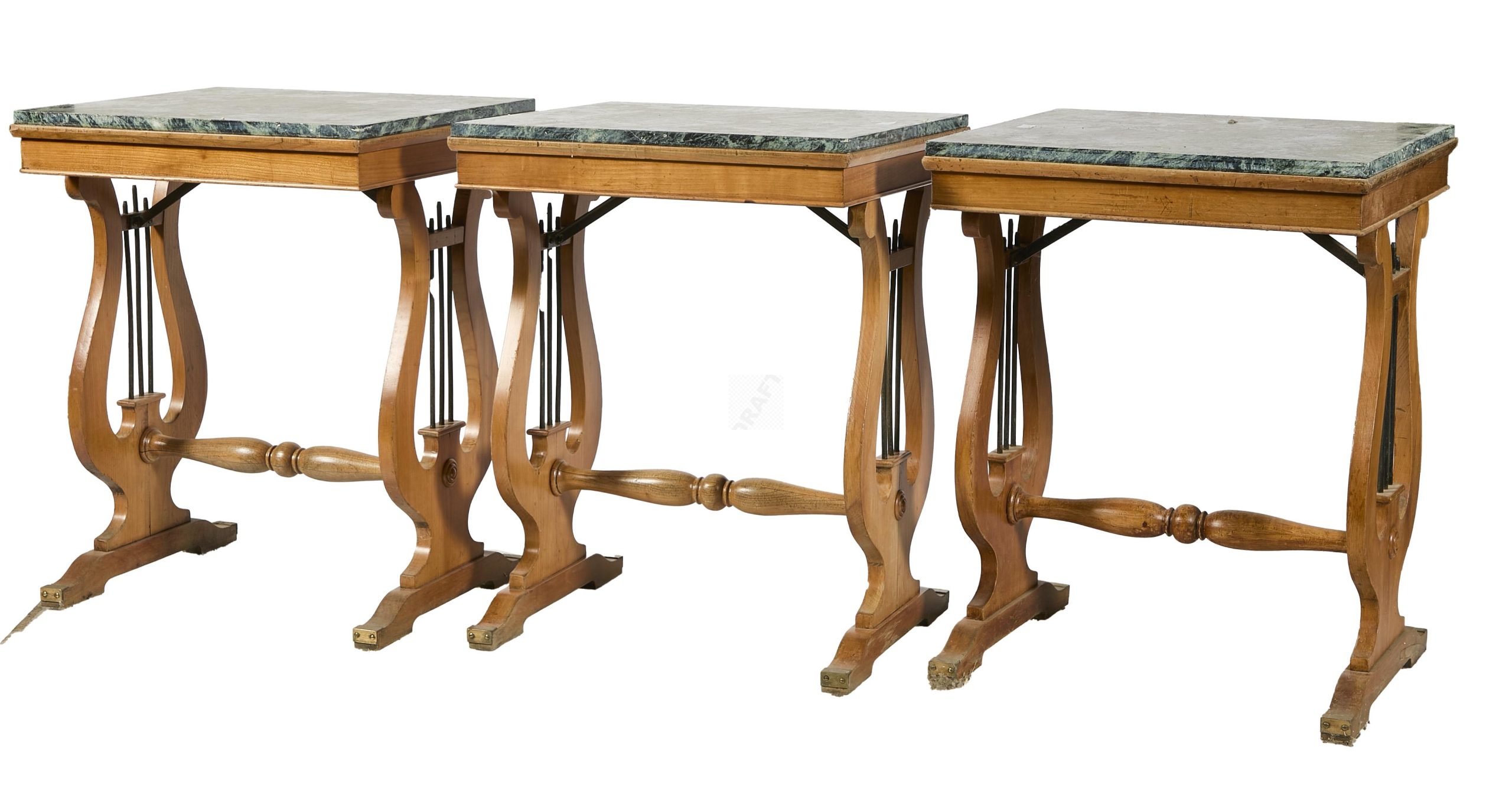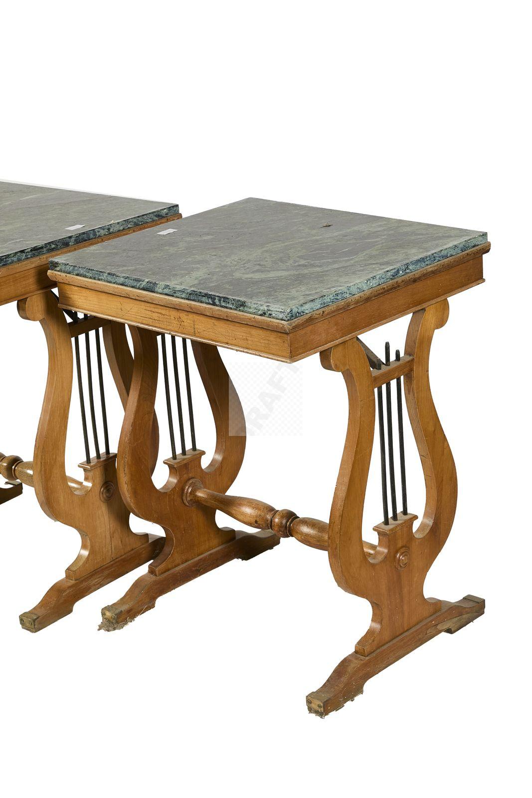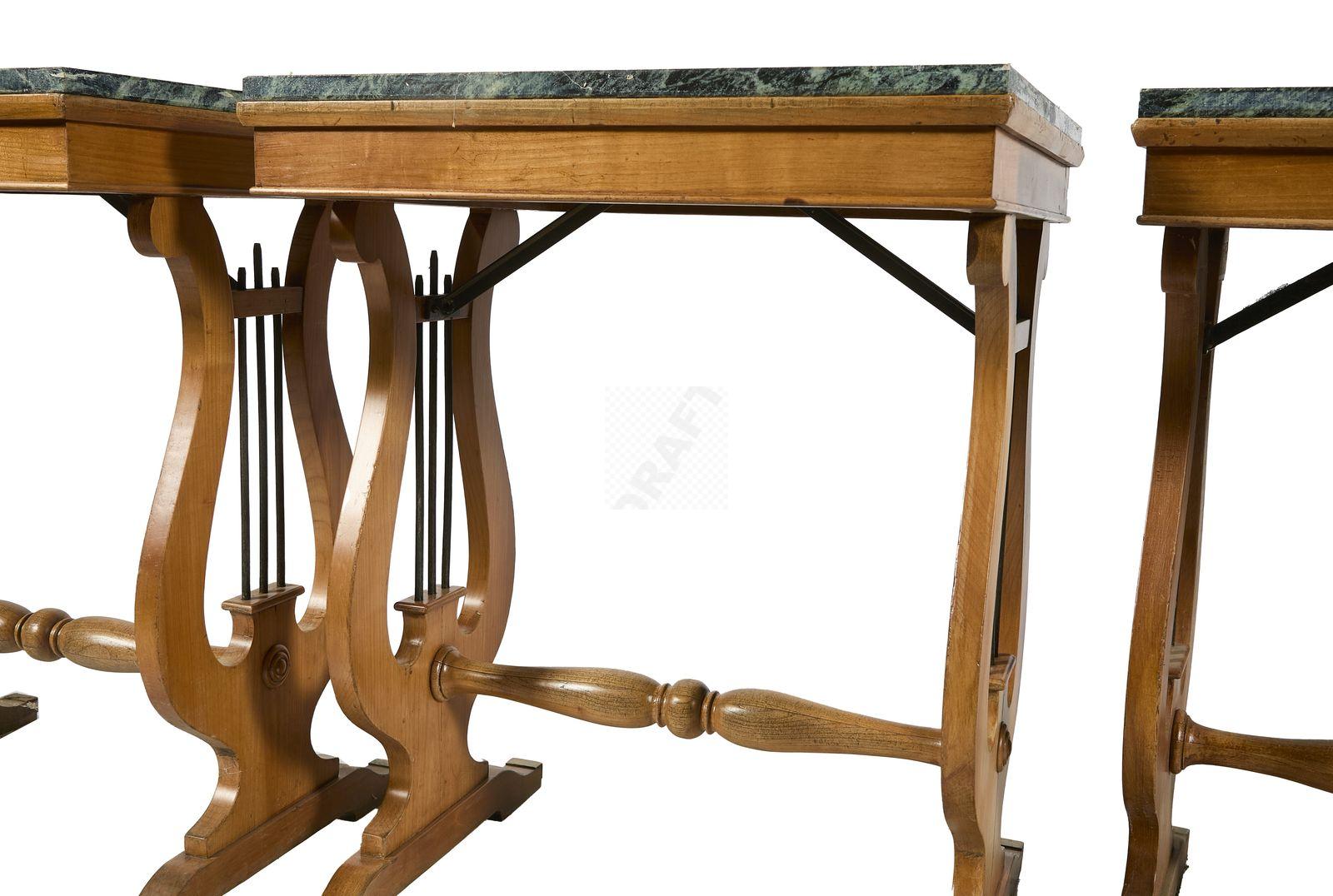 Lot n°48 - 48 Suite de 3 tables lyres en merisier, et marbre Portor, piètement à terminaiso
