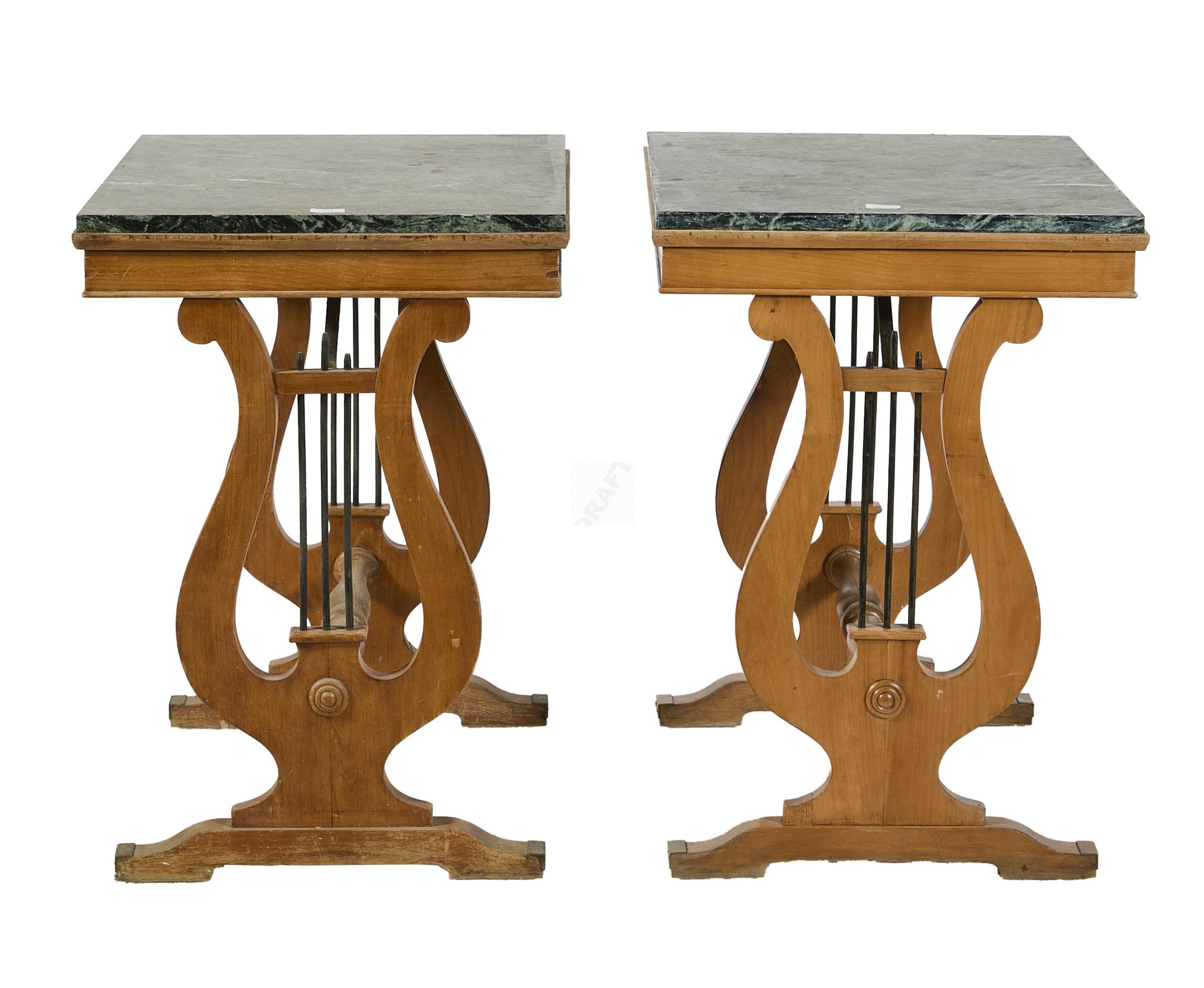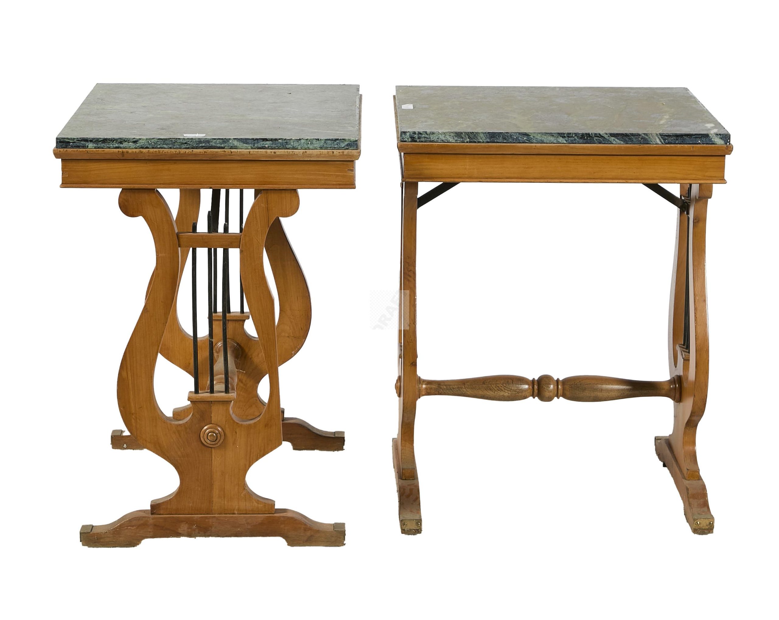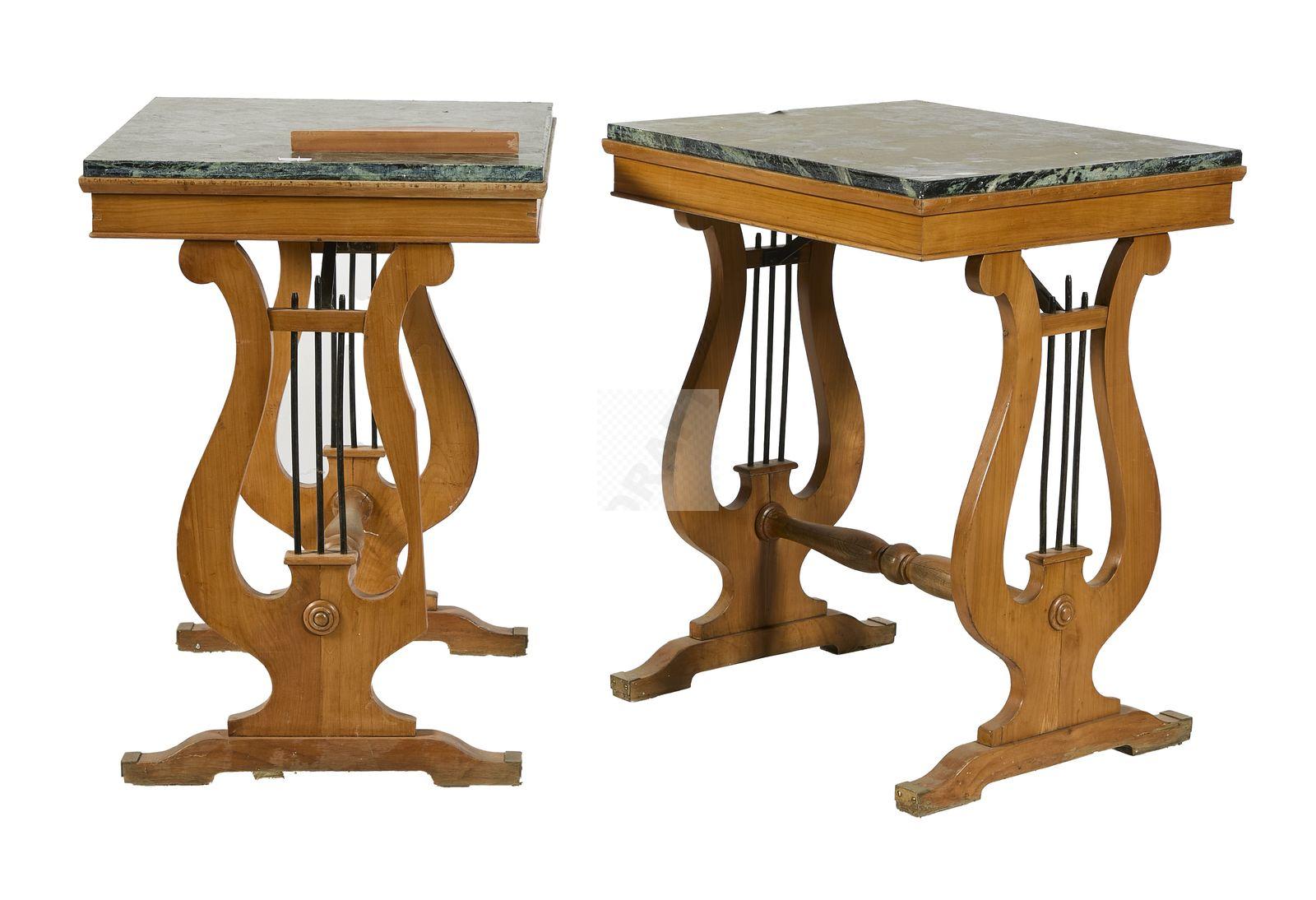 Lot n°50 - 50 Suite de 4 tables lyres en merisier, et marbre Portor, piètement à terminaiso