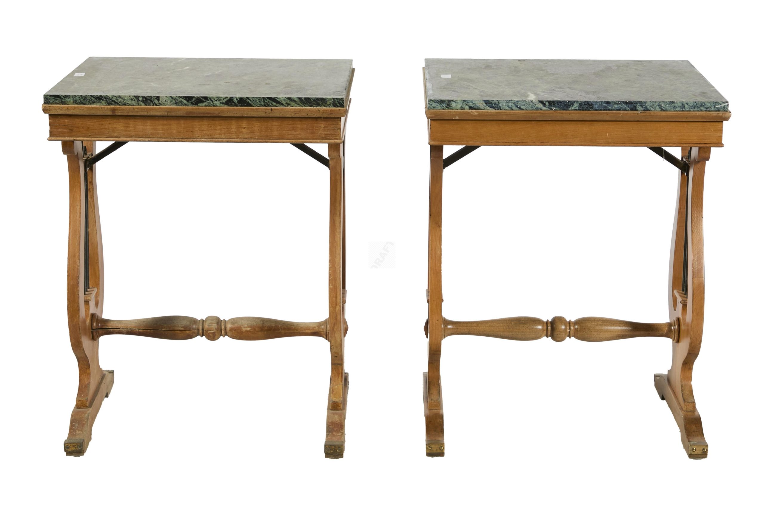 50 Suite de 4 tables lyres en merisier, et marbre Portor, piètement à terminaison de patins de bronze, pieds entretoisés à fût cannelés, Style Restauration, 77×54.5×60.5