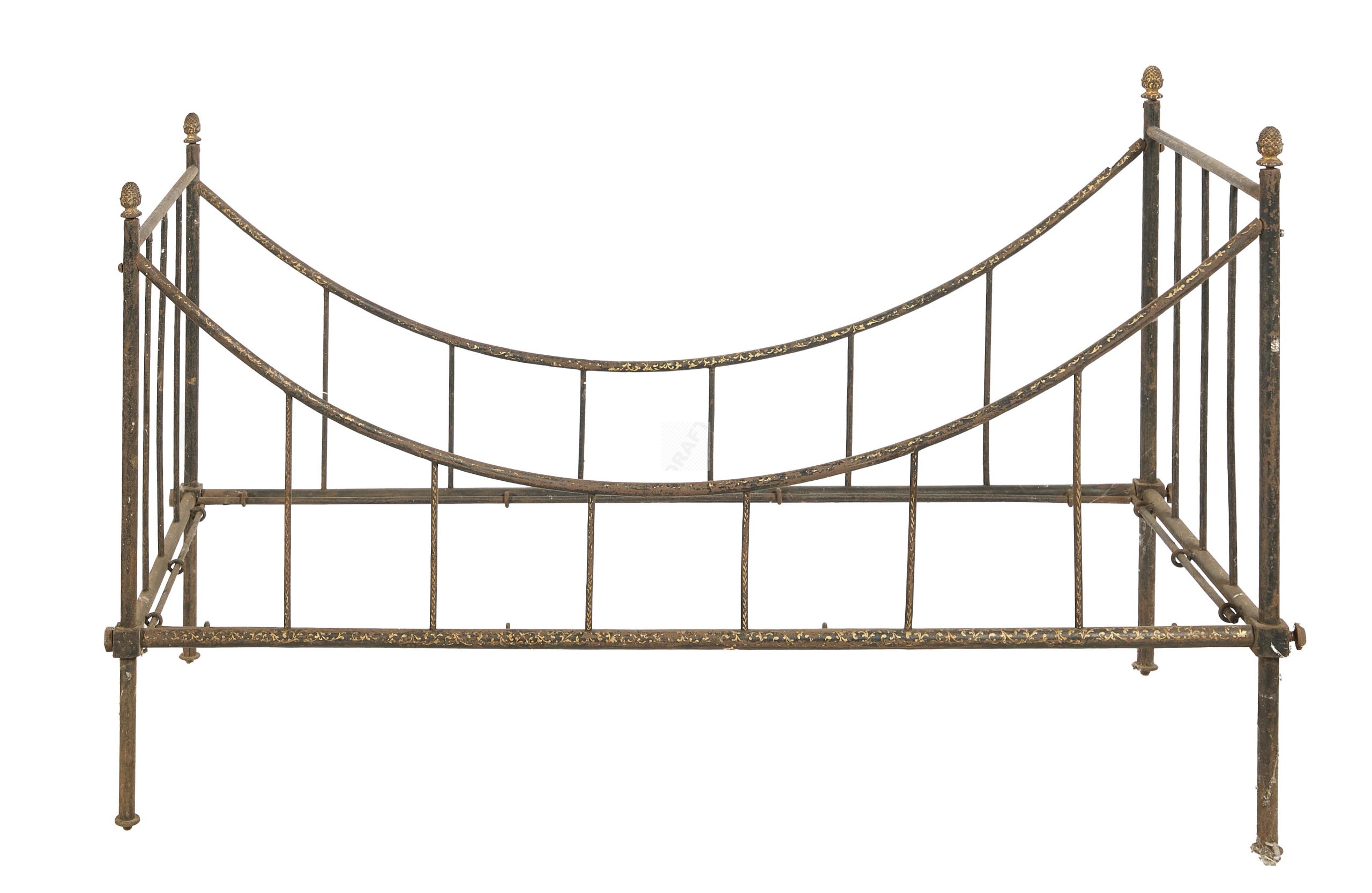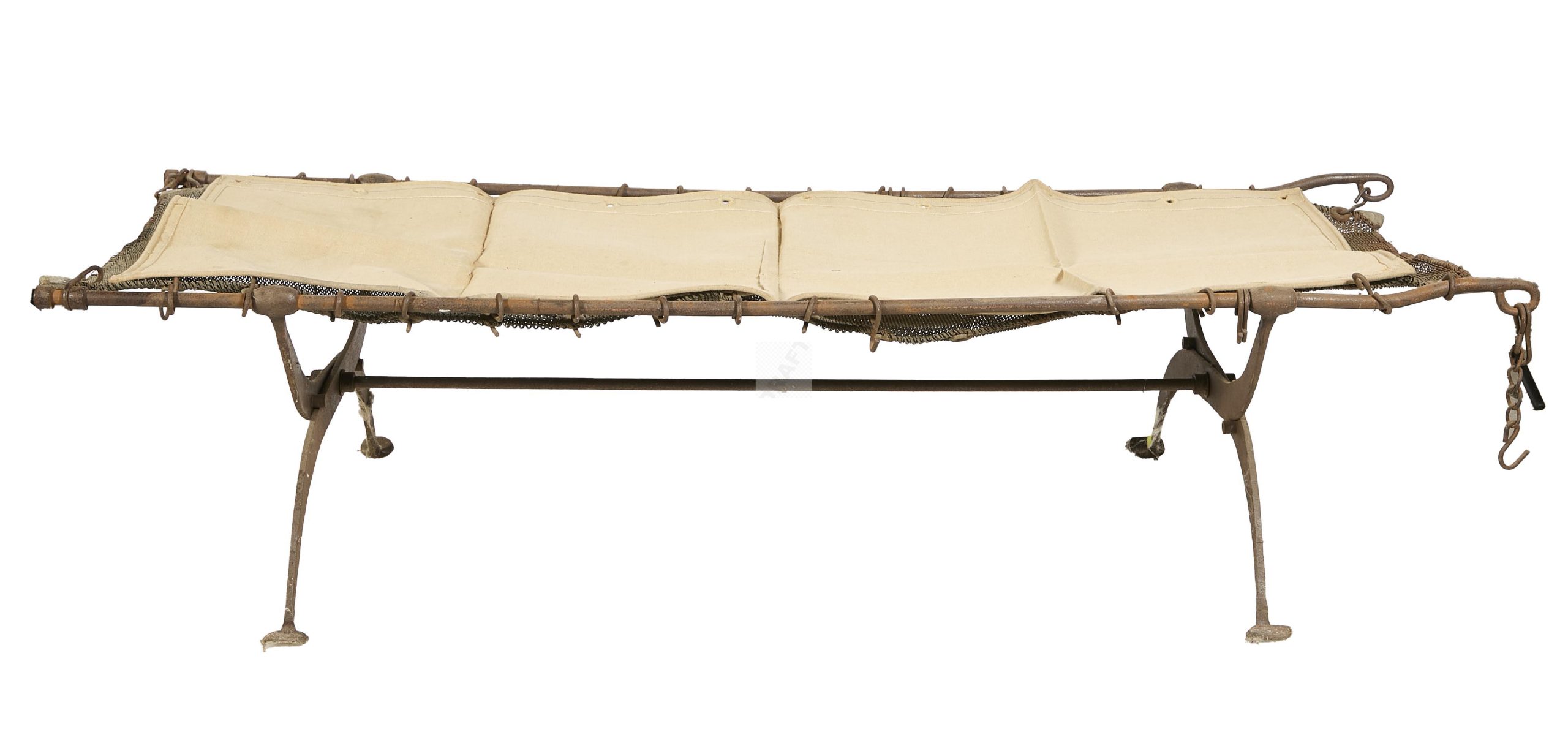 67 Suite de six lits de campagne à structure en X métallique et cotte de maille épaisse, on joint une structure de lit de style Louis XVI en métal, à motifs d’entrelacs feuillagés dorés, XIXe siècle, 53x205x77 cm, lit de camp déplié : 90x148x66 cm