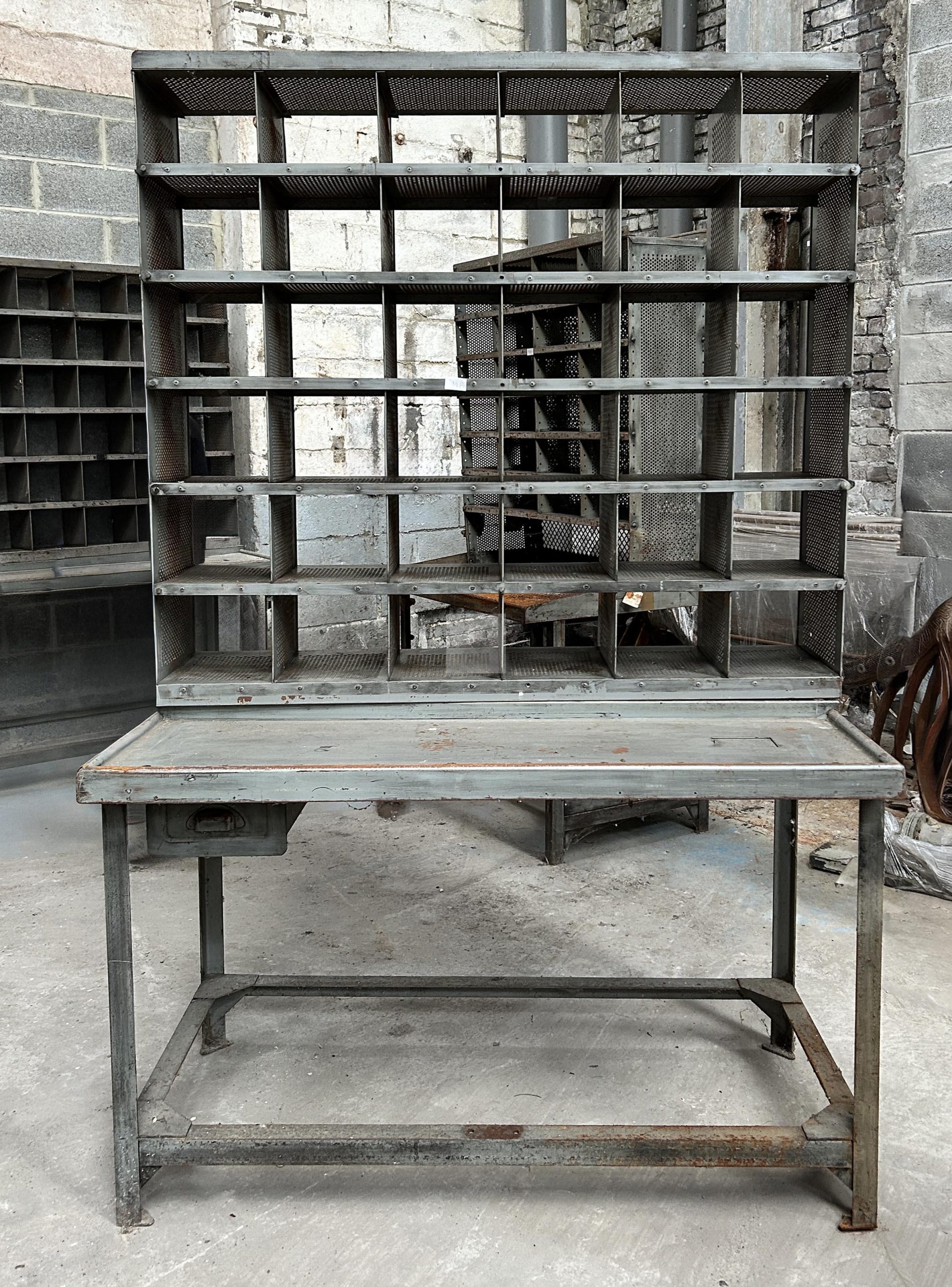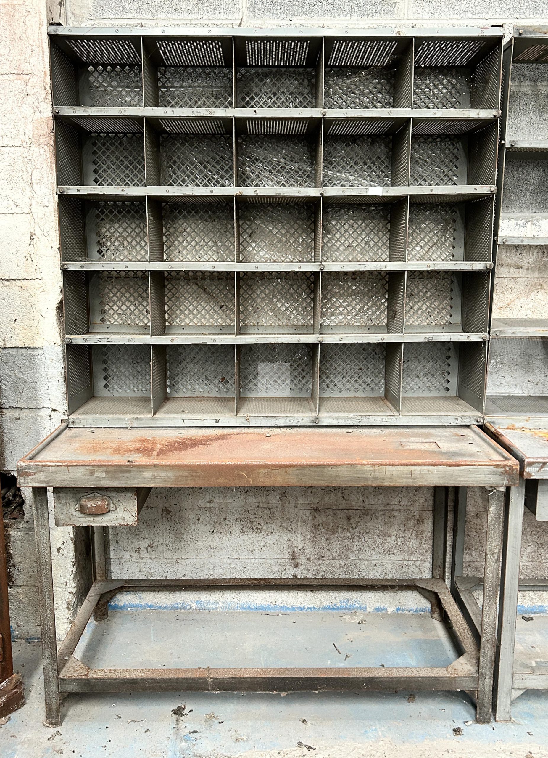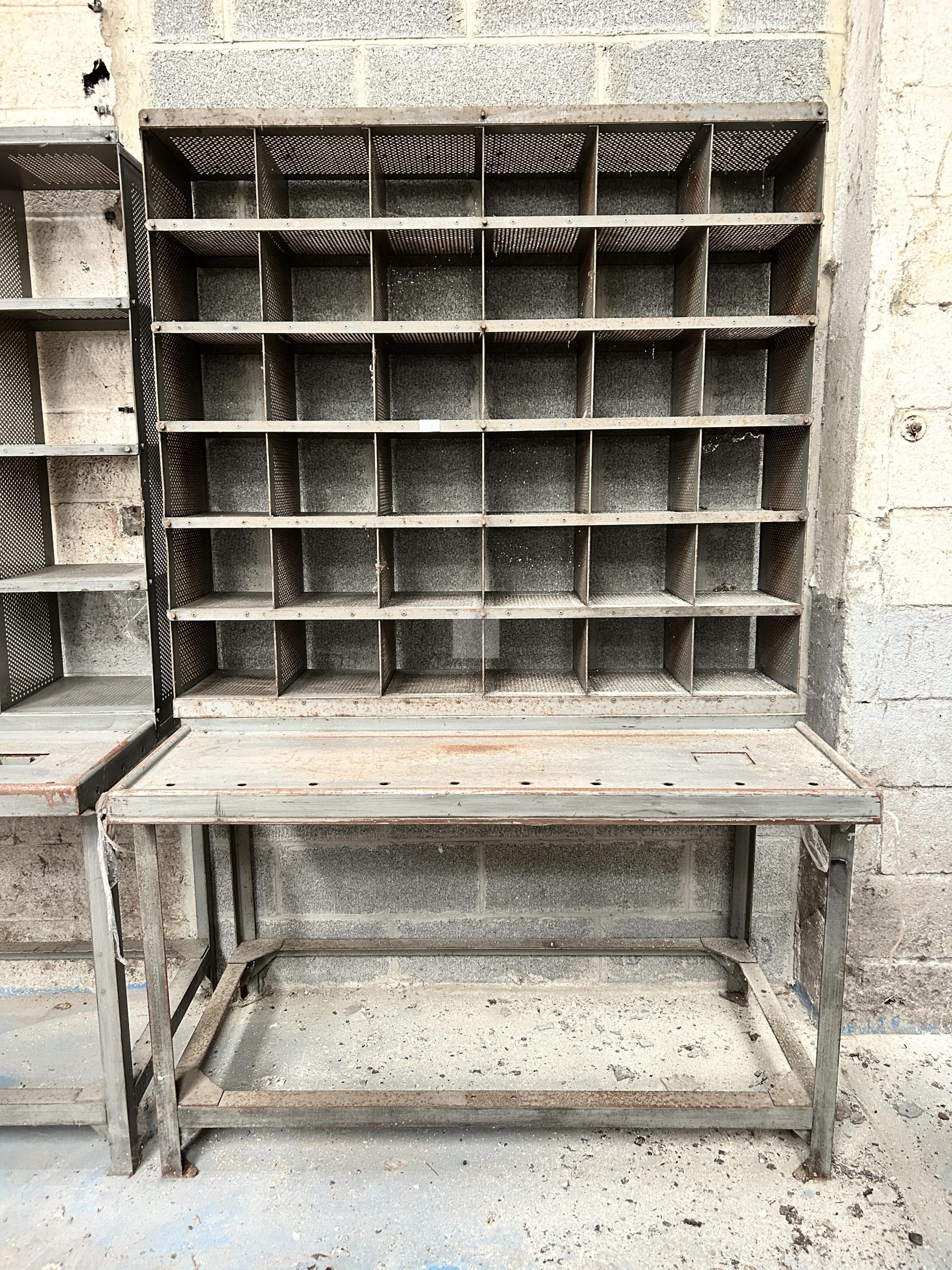 71 Suite de 6 meubles de tris à courriers, l’un double avec assise pivotante, présentant une table de tri en partie basse surmontée de casiers en métal perforé. Usures, rouille, Env. 193×125(105 pour l’un d’eux)x71 cm